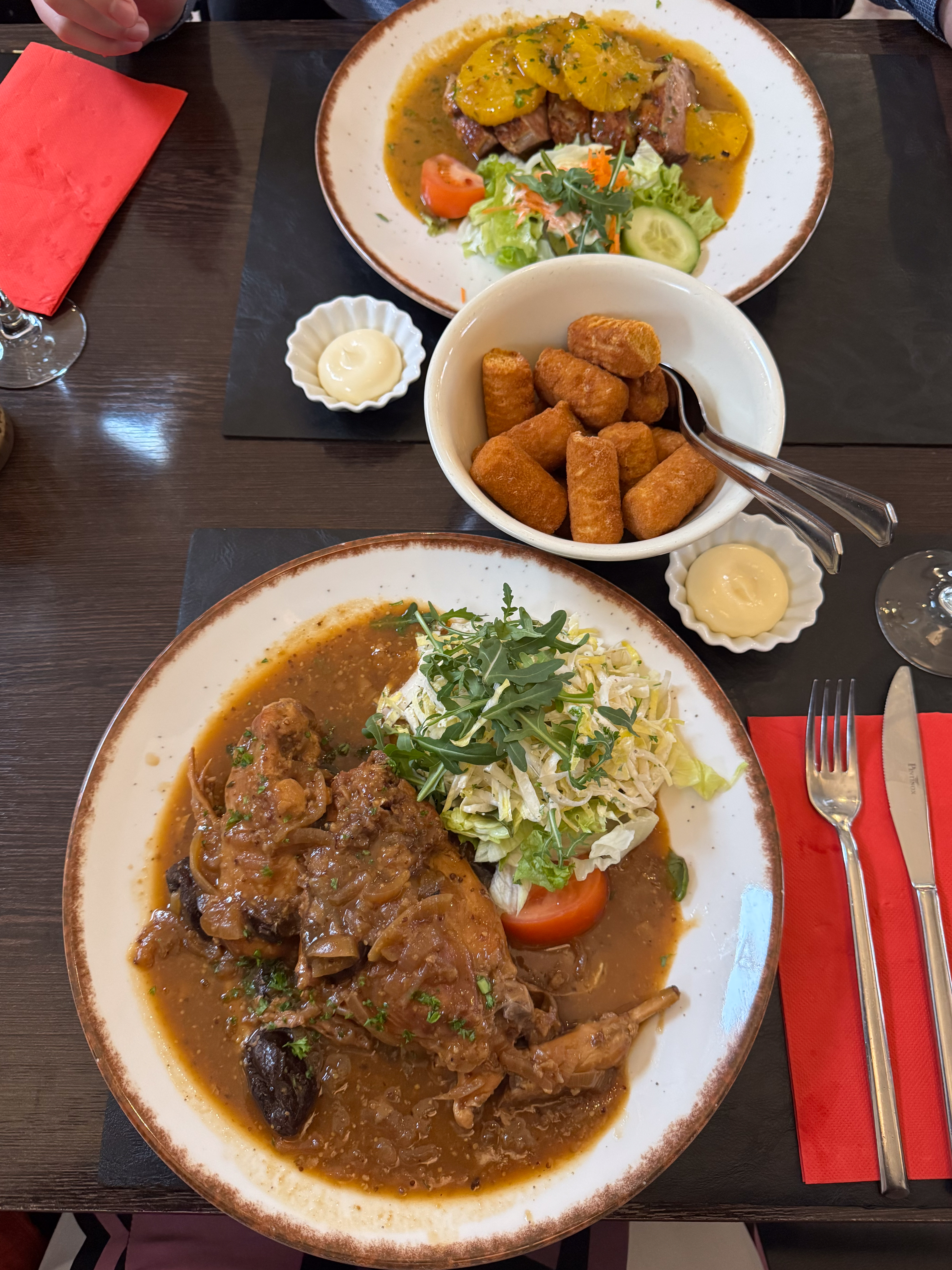 Na al de uitspattingen van gisteren deden mijn vriend en ik het vandaag rustig aan. Al slaagden we er wel in een nieuwe lunchplek uit te proberen: Brasserie Oud Leuven. Een brasserie die ik al talloze keren gepasseerd ben, maar die me door de klassieke uitstraling en het redelijk bejaarde cliënteel niet meteen aansprak. Aangezien mijn vriend en ik dit jaar het goede voornemen hebben om nieuwe Leuvense restaurants te ontdekken, besloten we deze brasserie vandaag een kans te geven. En ja, ik denk dat de andere klanten minstens dertig jaar ouder waren dan wij, maar de klassieke brasseriegerechten (duidelijk met kennis van zaken bereid door een Aziatische chef) stelden niet teleur. We deelden samen een bord garnaalkroketten als voorgerechtje en vervolgens koos ik als hoofdgerecht voor de klassieker der klassiekers: konijn met pruimen. En jawel, het smaakte!