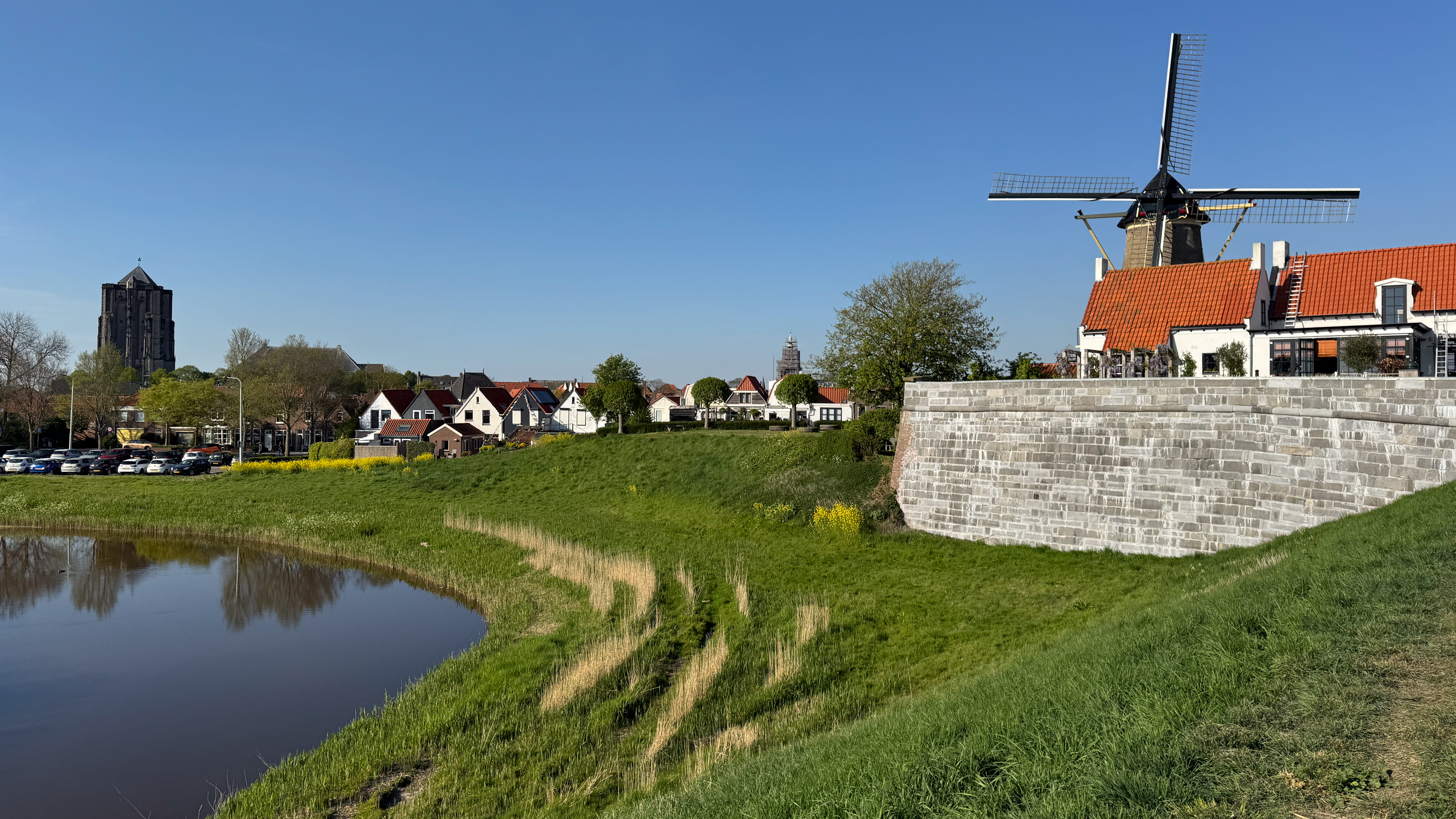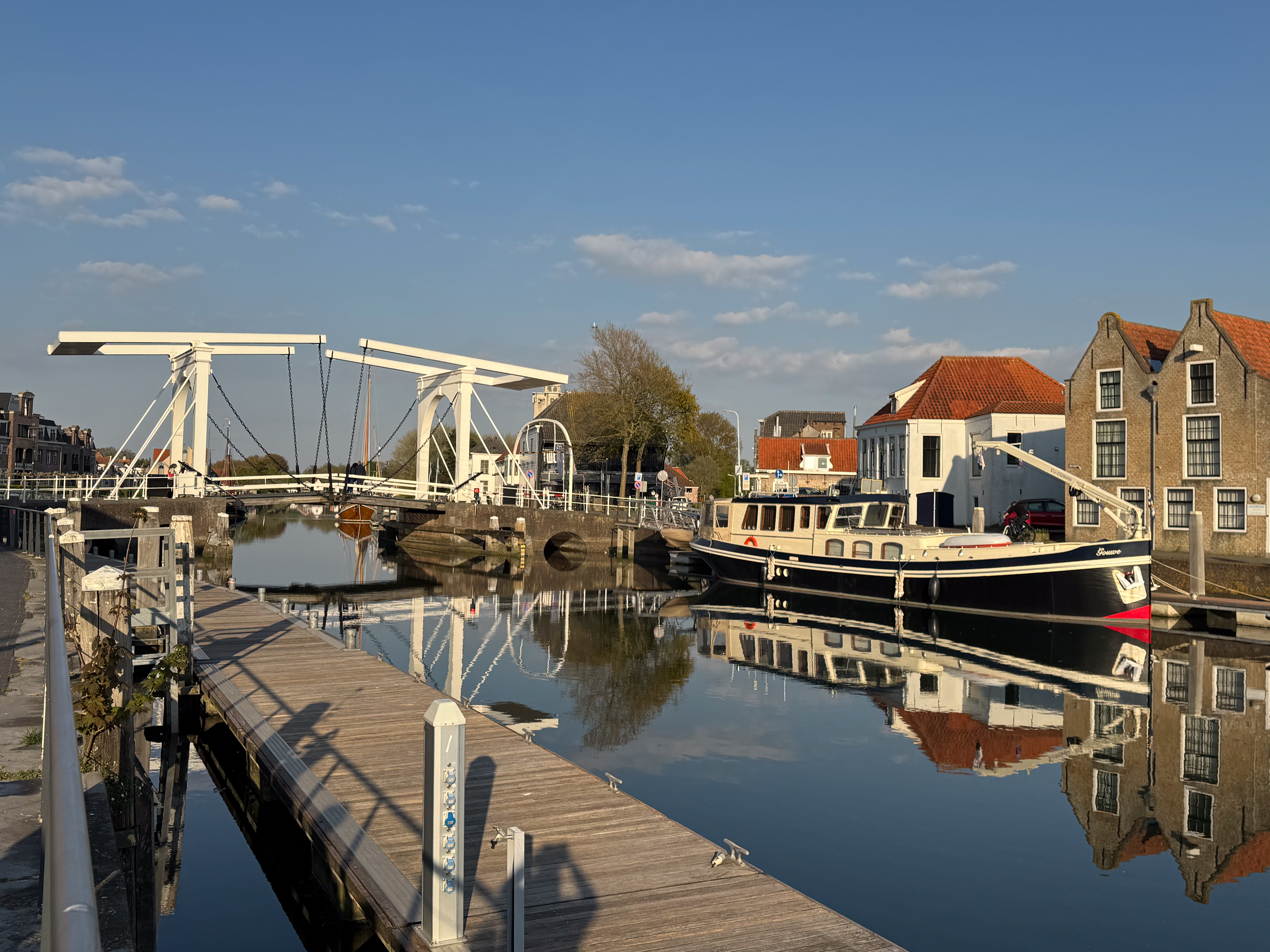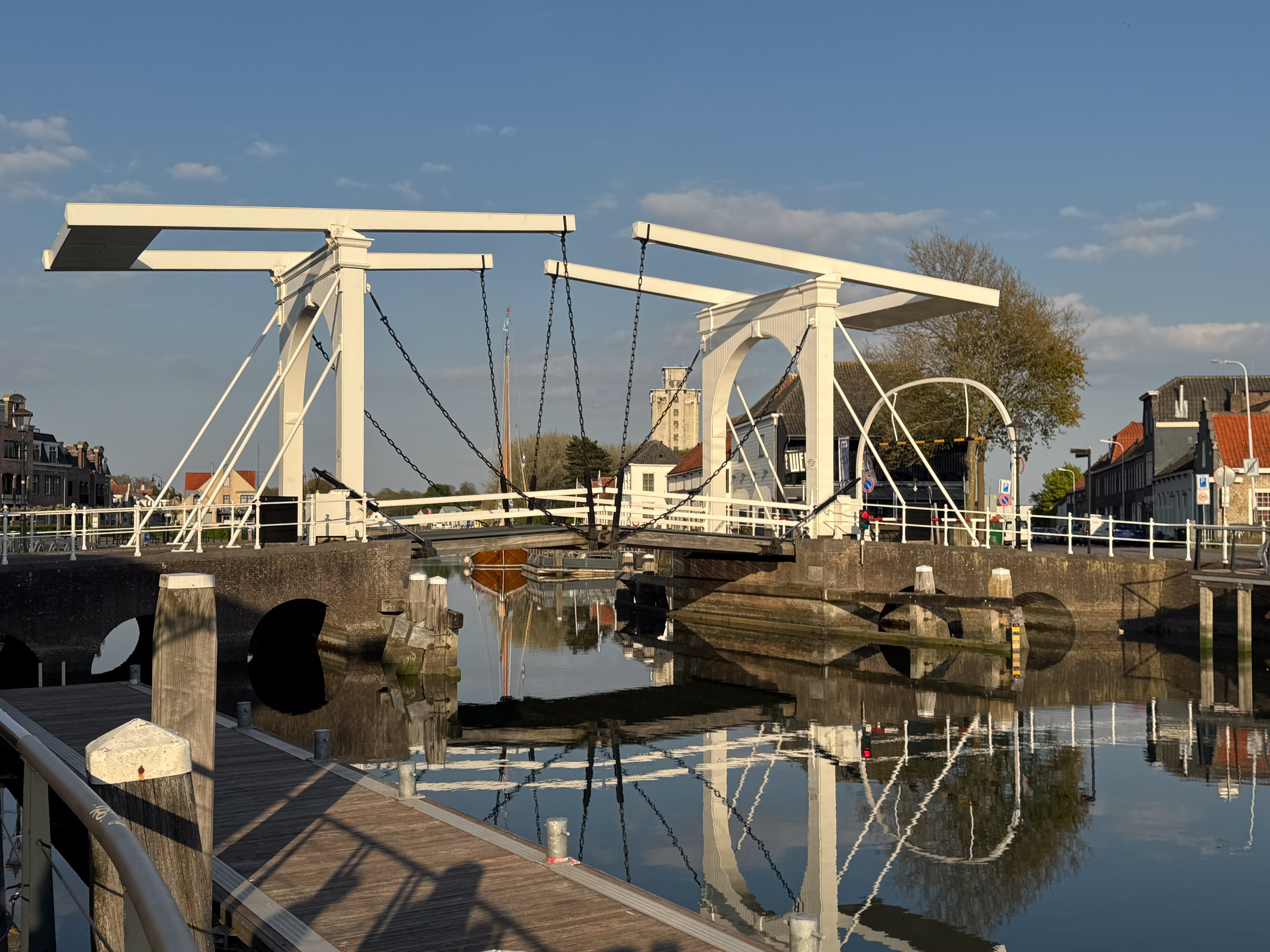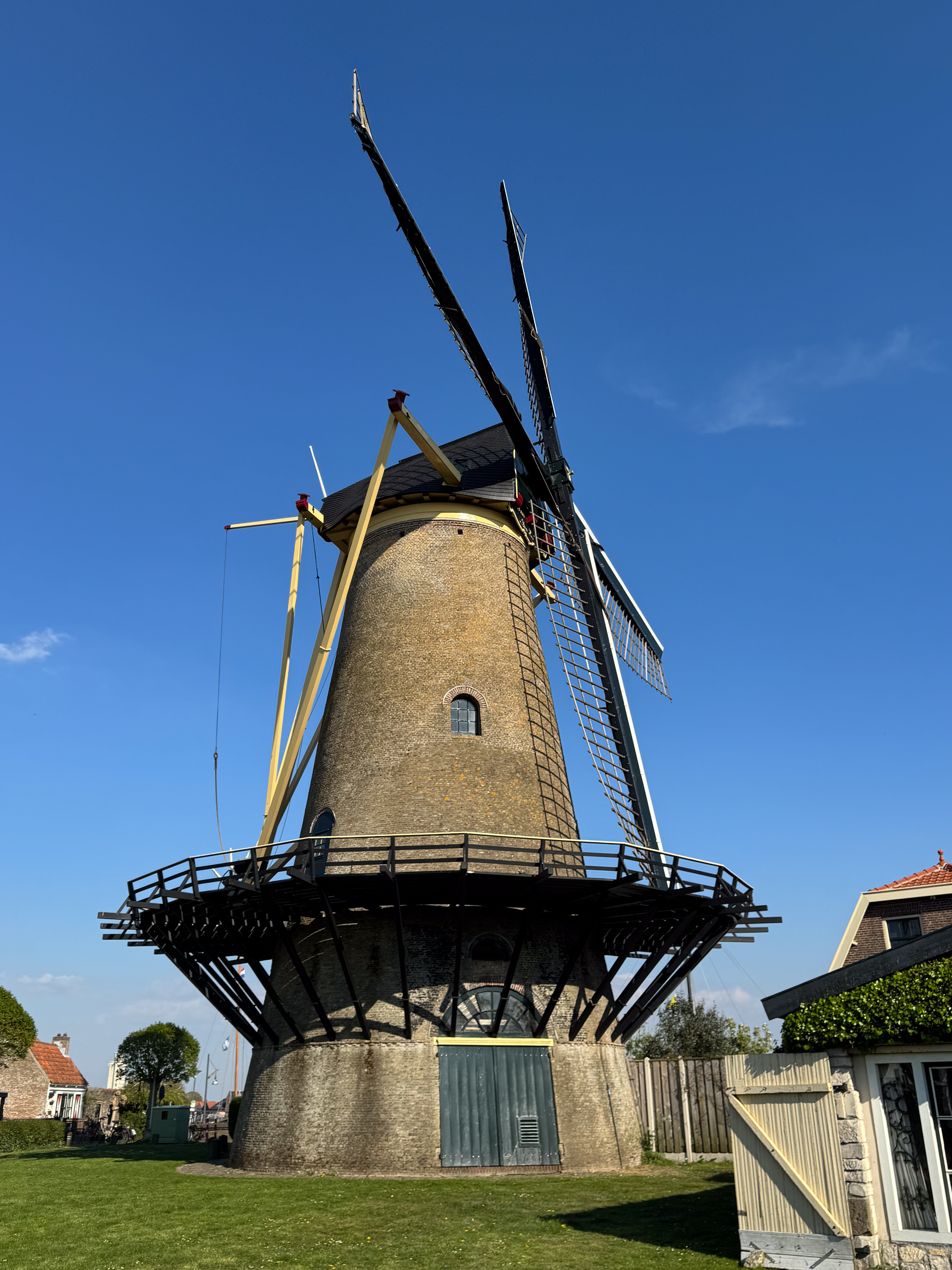Ditmaal parkeerden we ons op een andere randparking in Zierikzee, niet ver van Brasserie De Kaoie waar ik voor het avondmaal gereserveerd had. We slenterden een beetje op goed geluk door de straten van Zierikzee. Als we iets interessant zagen, een windmolen, een ophaalbrug, een mooi gebouw, een kerk, een stadspoort, een brulboei, liepen we gewoon die richting uit. Onze eerste indruk van Zierikzee werd bevestigd: mooi en gezellig stadje. Dat de lucht strakblauw was en we (toch wat onverwacht) konden genieten van een stralend zonnetje maakte dat alles er nog mooier uit zag.