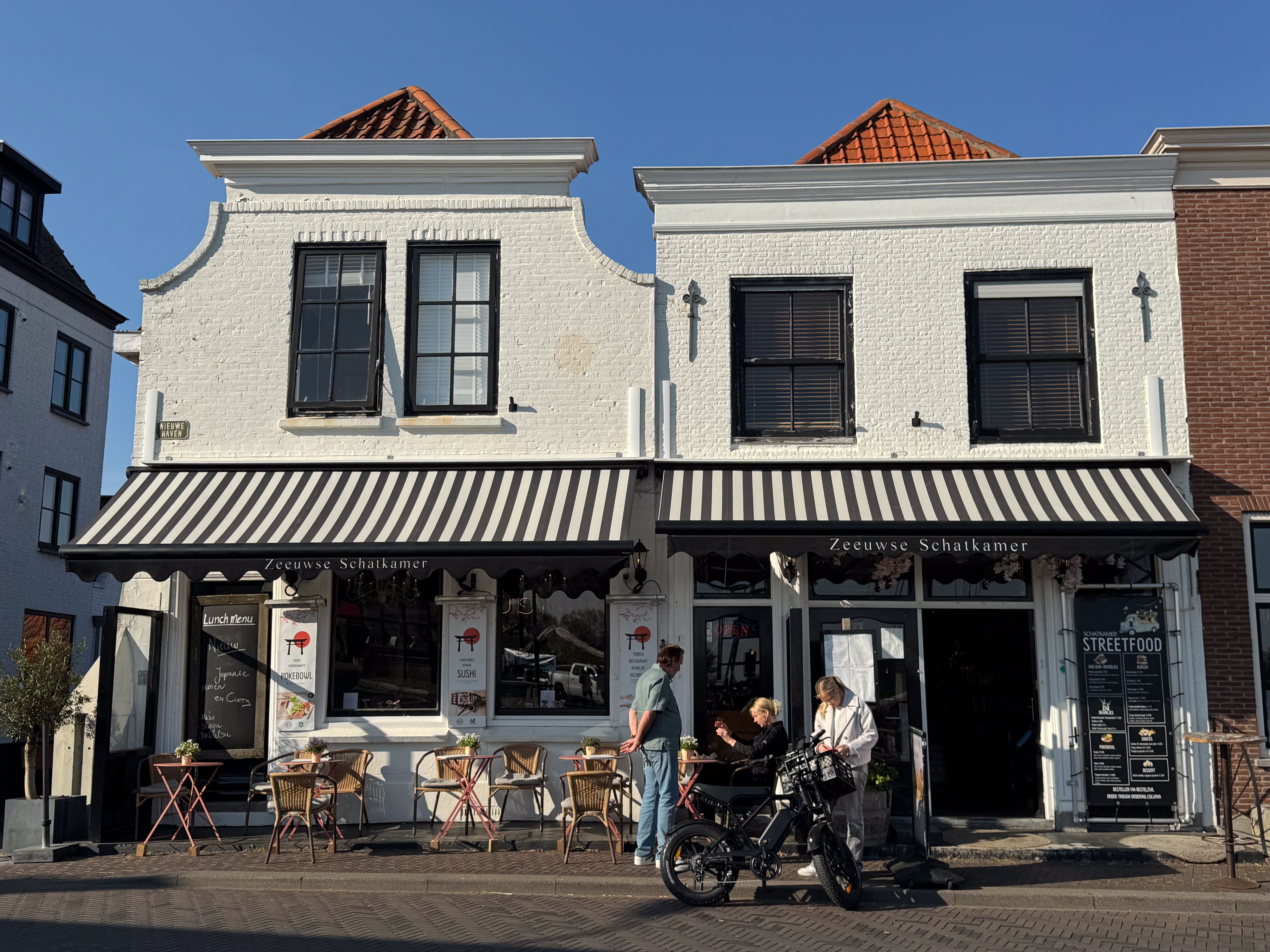 Mijn vriend en ik zaten dus dik twintig minuten eerder te genieten van een wijntje op het onverwacht zonnige terras van Eetcafé Marktzicht, in het hart van Zierikzee. Niet bepaald een straf.
