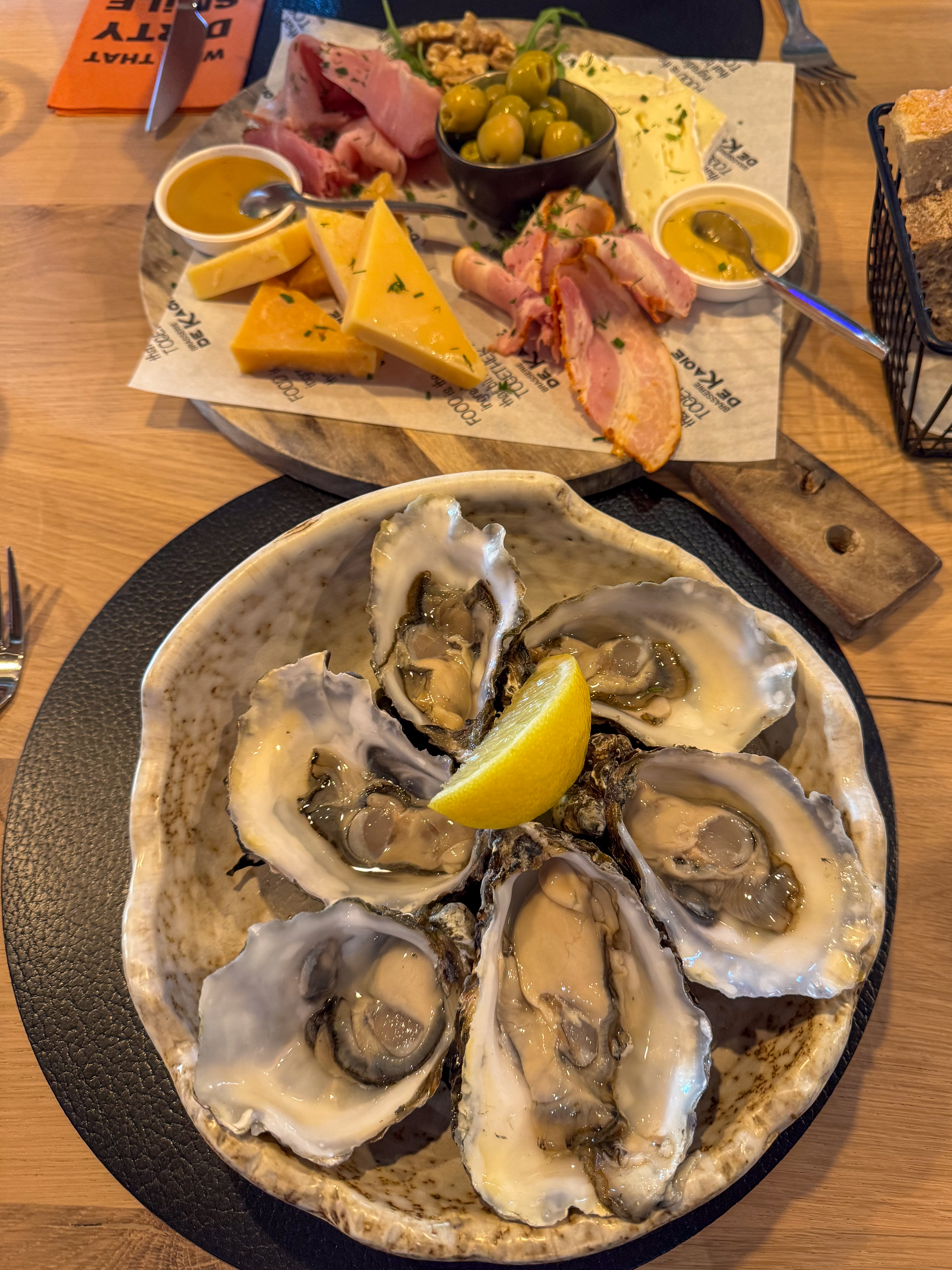 We kregen een heel mooie, grote tafel toegewezen voor ons gezelschap van vier volwassenen en twee tieners (al is de oudste zoon van onze vrienden ondertussen al achttien jaar, hij blijft toch nog een tiener). Na de asperges deze middag liet ik mij verleiden door mijn andere grote liefde: oesters! Verse Zeeuwse oesters met een paar druppeltjes citroen, meer moet dat echt niet zijn. We deelden samen een aperitiefbordje en als hoofdgerecht ging ik voor de tong. Het eten was lekker en het restaurant groot en modern met vriendelijk personeel.