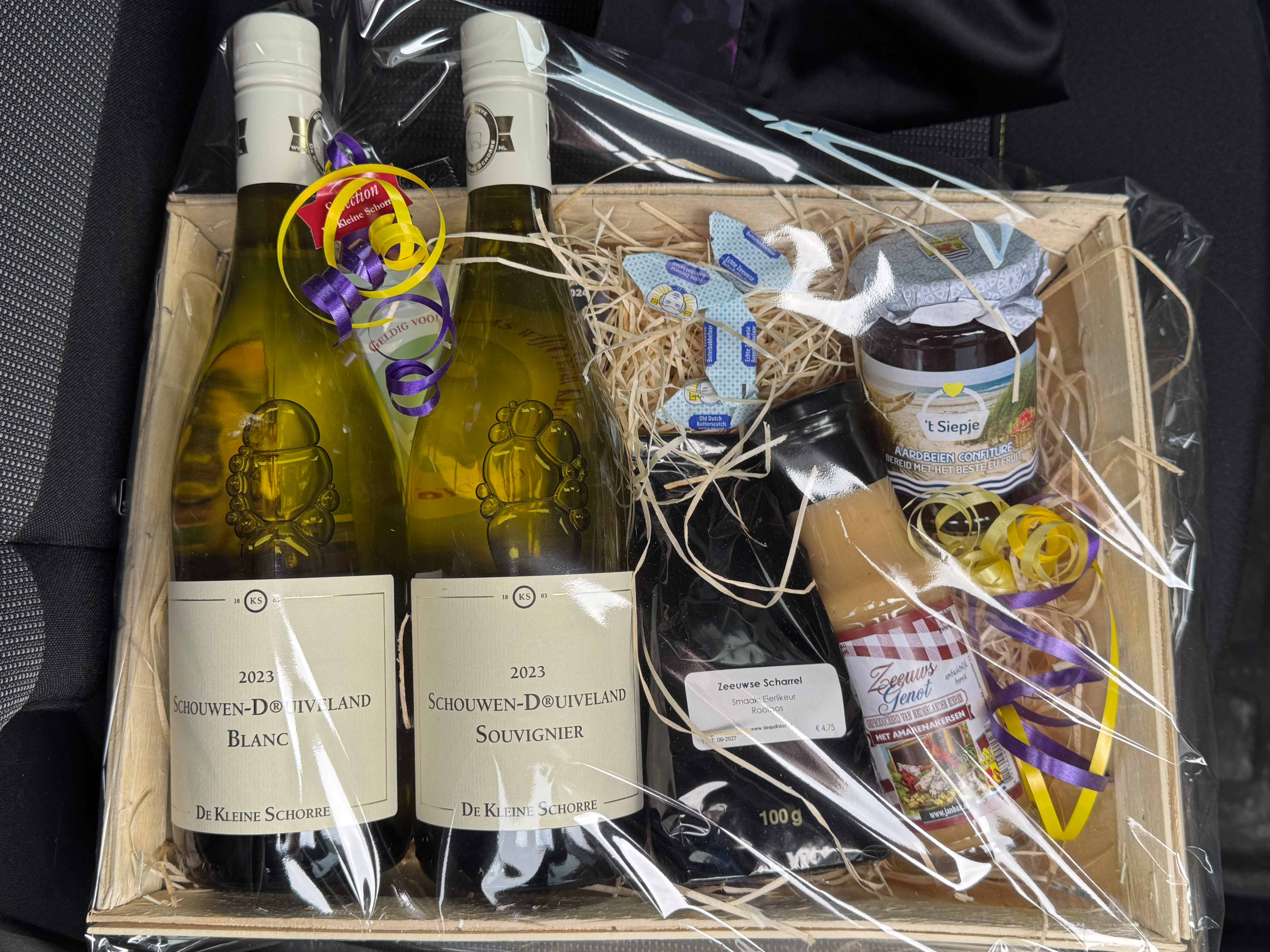 En dan is het moment van afscheid nemen aangebroken. Onze vrienden rijden terug richting Testelt en mijn vriend en ik rijden nog even langs de winkel van De Kleine Schorre, omdat de wijnen mij zo goed gesmaakt hadden in De Schatkamer. We kopen zes wijntjes voor onszelf, een mooi assortiment van het aanbod van De Kleine Schorre en een mooie geschenkmand voor de ouders van mijn vriend.