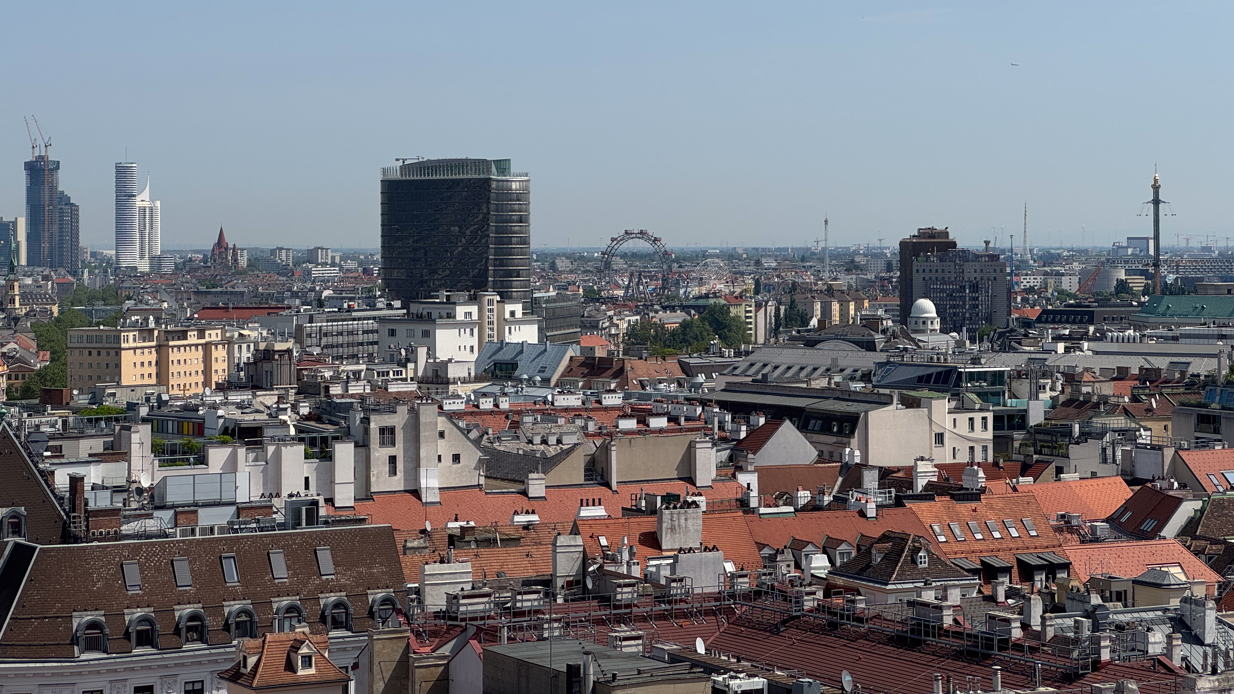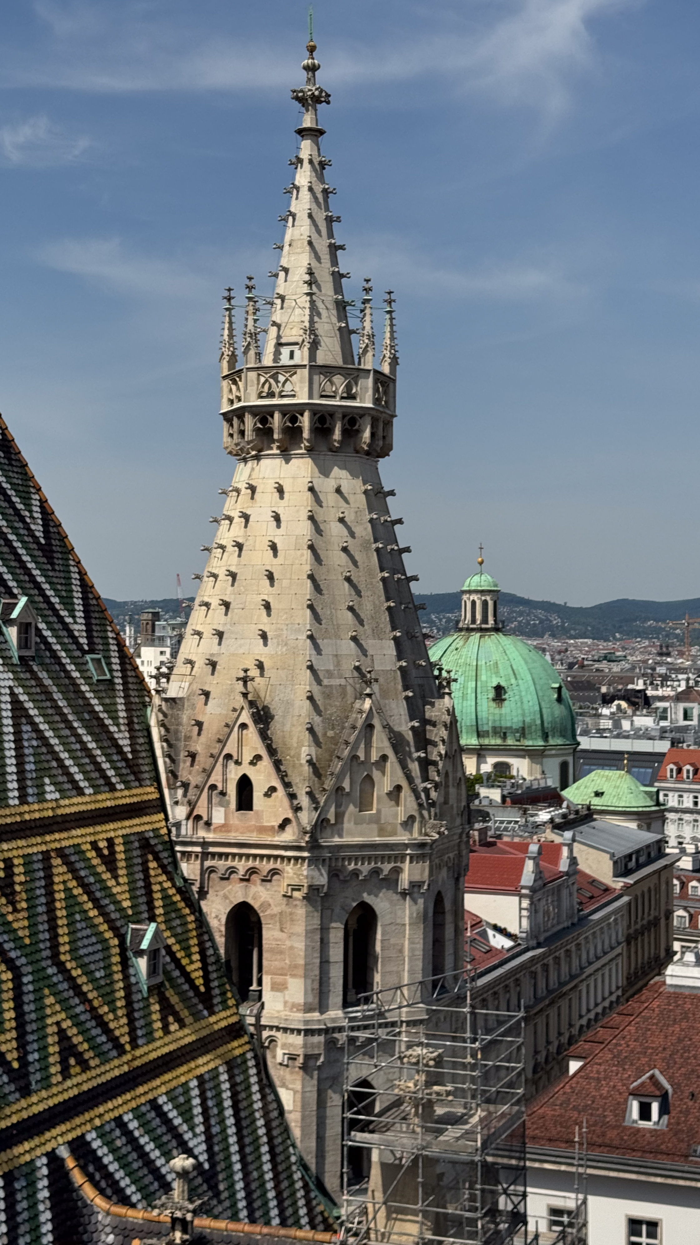 Vervolgens begeven we ons naar de noordelijke toren die is uitgerust met een piepklein liftje dat bediend wordt door een bijzonder vriendelijke Oostenrijker. Hij maakt voortdurend grapjes wat de nogal claustrofobische tocht naar boven iets aangenamer maakt. Het uitkijkplatform van de noordelijke toren is veel ruimer dan de nogal krappe torenkamer in de zuidelijke toren. Alhoewel de zuidelijke toren hoger is, maak ik bijgevolg meer foto’s vanaf dit uitkijkplatform.