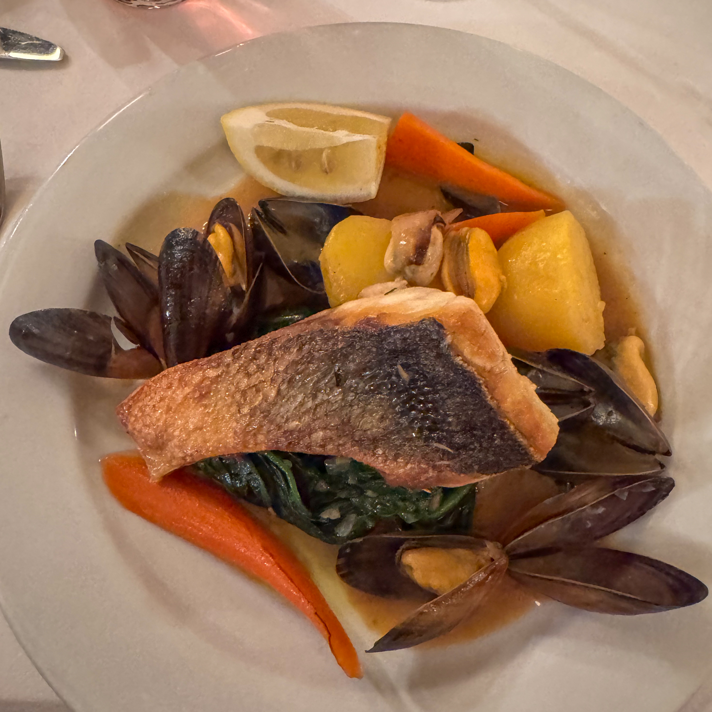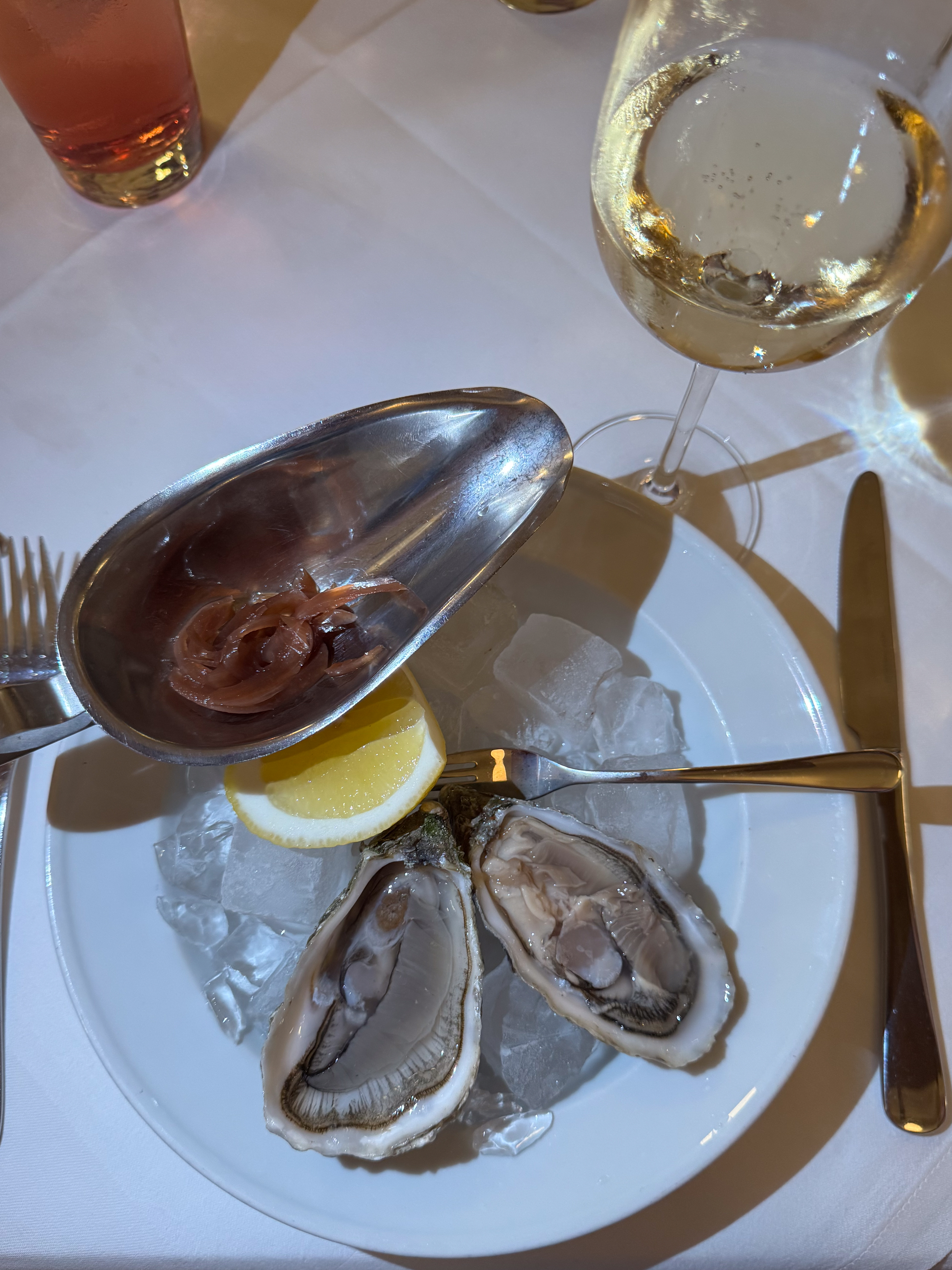Omdat het onze laatste avond is, mag het wel wat meer zijn. ik bestel twee oestertjes om de maaltijd te beginnen, vergezeld van een glaasje bubbels. Als hoofdgerecht ga ik voor de zeebaars met mosseltjes en patatjes met een karafje Sauvignon blanc. Voor het dessert delen we een crème brûlée, een chocomousse en topfensmarren (een variant op kaiserschmarren). Ik sluit de maaltijd af met een glaasje Gölles Alter Apfel Edelbrand. Een waardige afsluiter van onze laatste avond in Wenen.