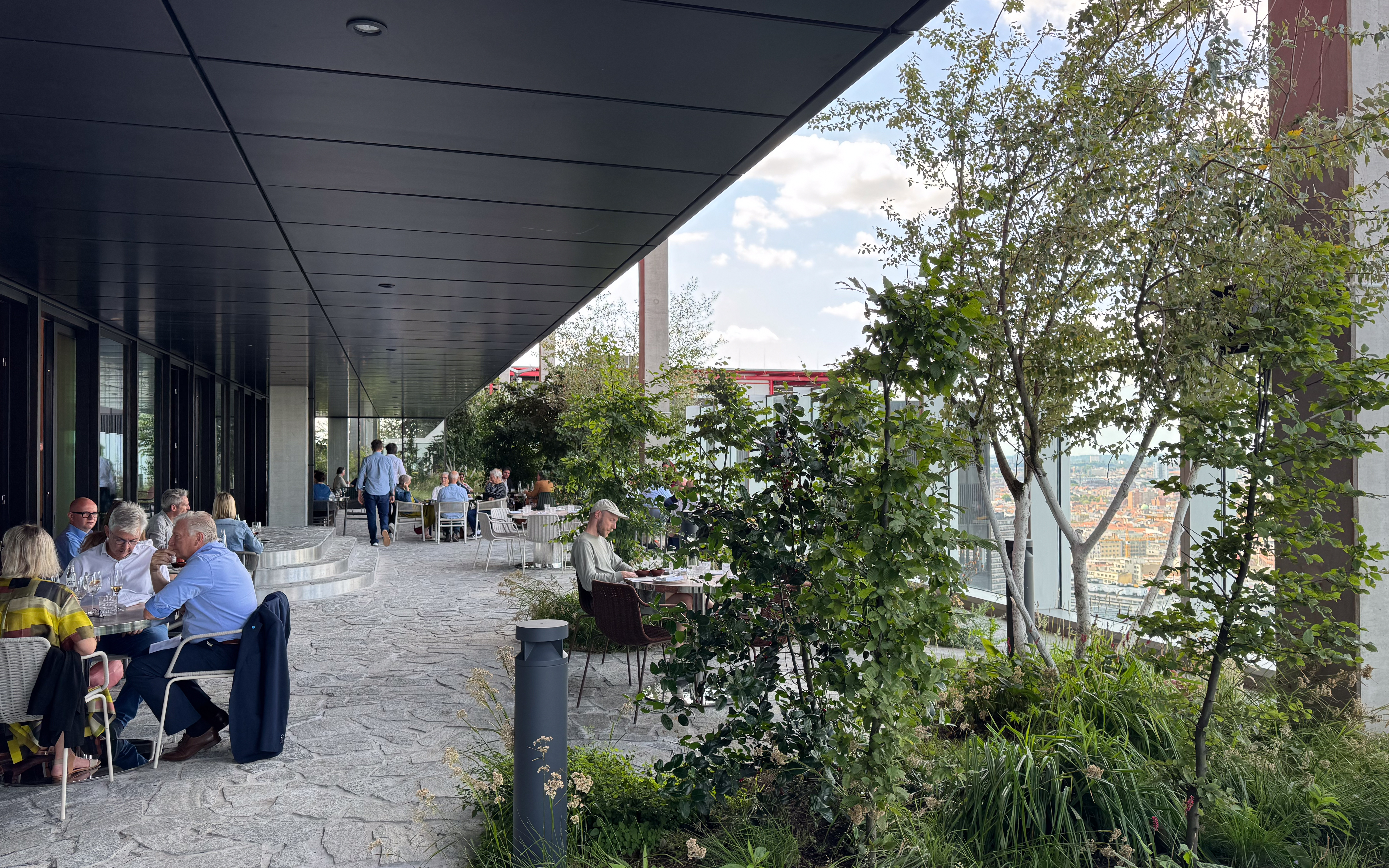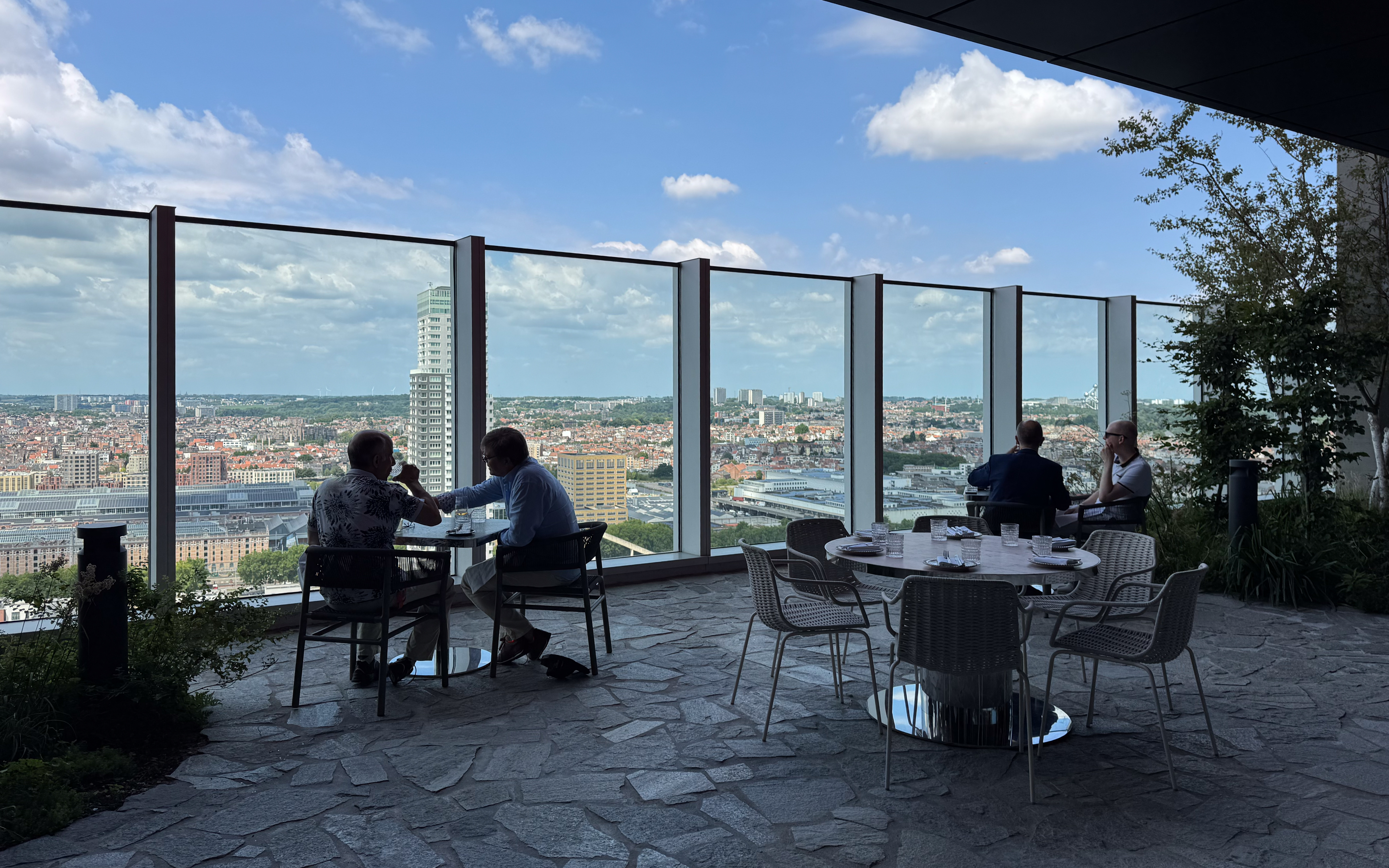 Na het officiële afscheidsfeest volgde vandaag de afscheidslunch met de leden van het managementcomité. De grote baas had voor deze bijzondere gelegenheid een tafel voor ons gezelschap gereserveerd in het gloednieuwe restaurant Lila29. De 29 verwijst naar de verdieping waarop het restaurant gelegen is en vanaf waar je een werkelijk fenomenaal uitzicht hebt over Brussel. Het was duidelijk dat het restaurant nog niet al te lang open was, want het personeel was nog niet goed op mekaar ingespeeld, maar dat zagen we graag door de vingers, want wie durft er klagen over carpaccio van zeebaars als voorgerecht en octopus als hoofdgerecht? Echt overheerlijk! Dat uitzicht in combinatie met een stijlvolle inrichting en heerlijk eten komt natuurlijk aan een prijs: goedkoop is deze plek niet, maar dat zal mij alvast niet tegen houden om terug te keren!