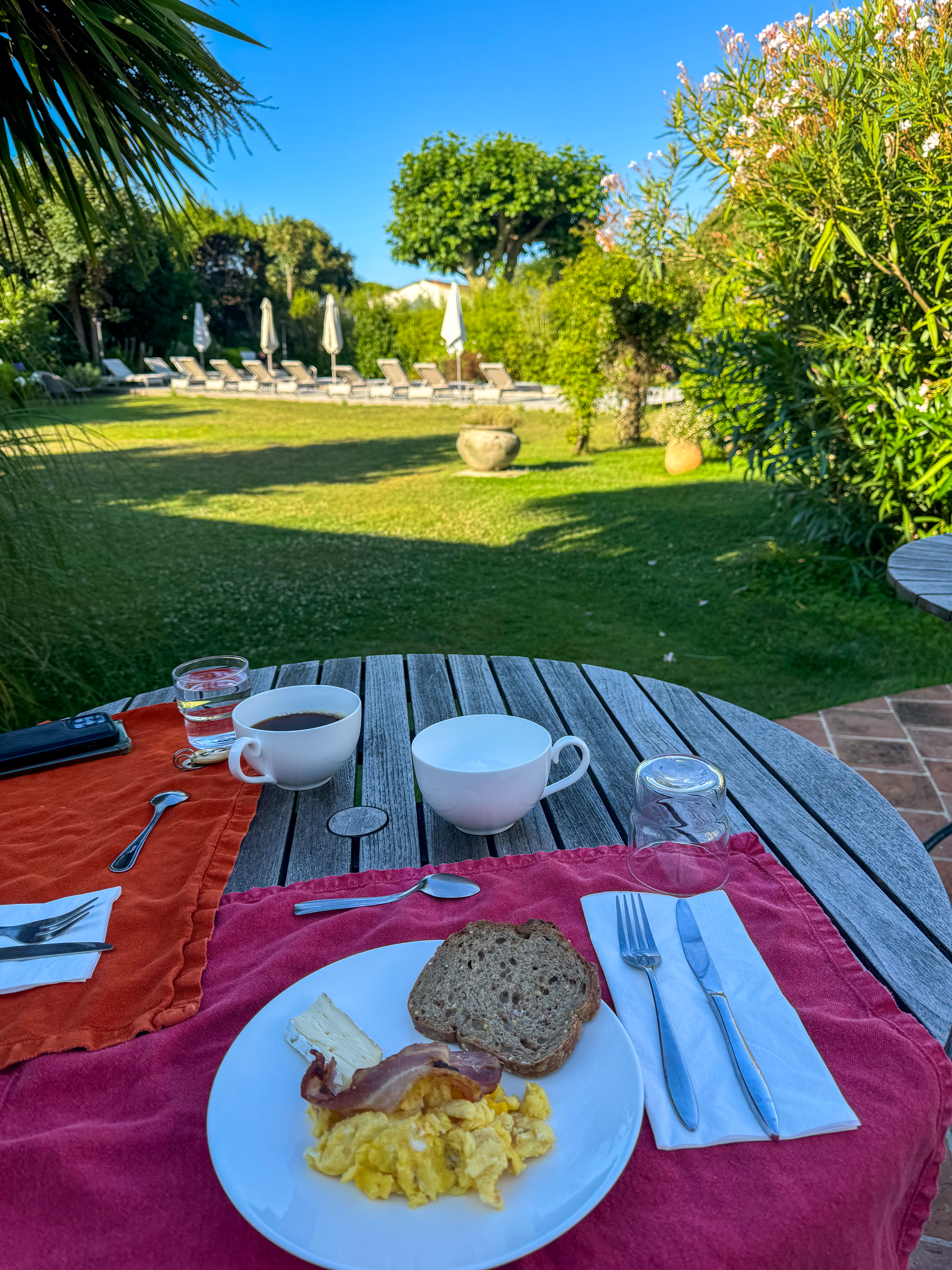 Vandaag geen ontbijt op bed en we daar zijn we allebei blij om! Het is immers zeer mooi zitten op het aangename terras van ons hotel. We hebben een tafel met zicht op de tuin met natuurlijk zwembad, dat we hopelijk straks kunnen uitproberen!