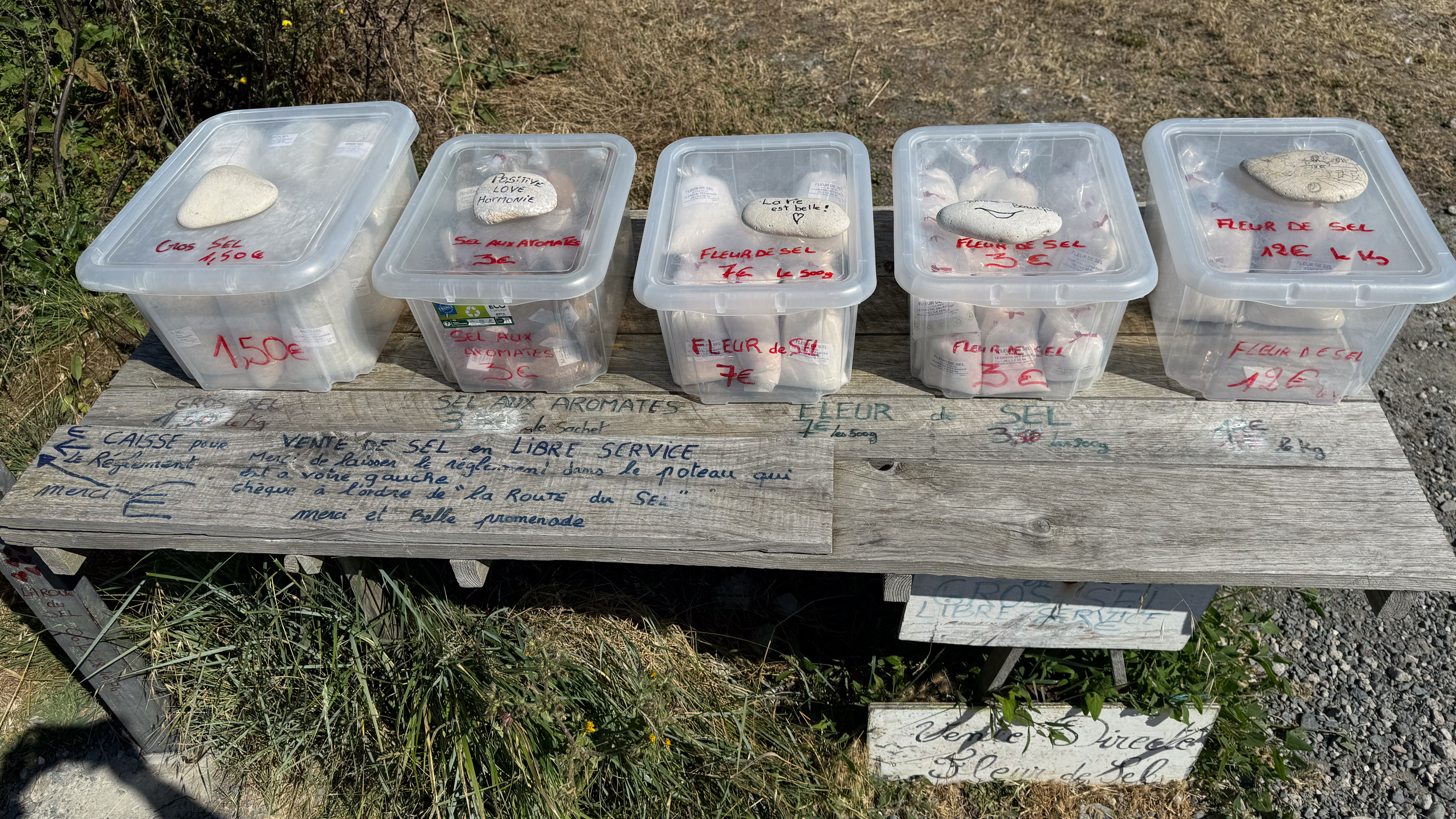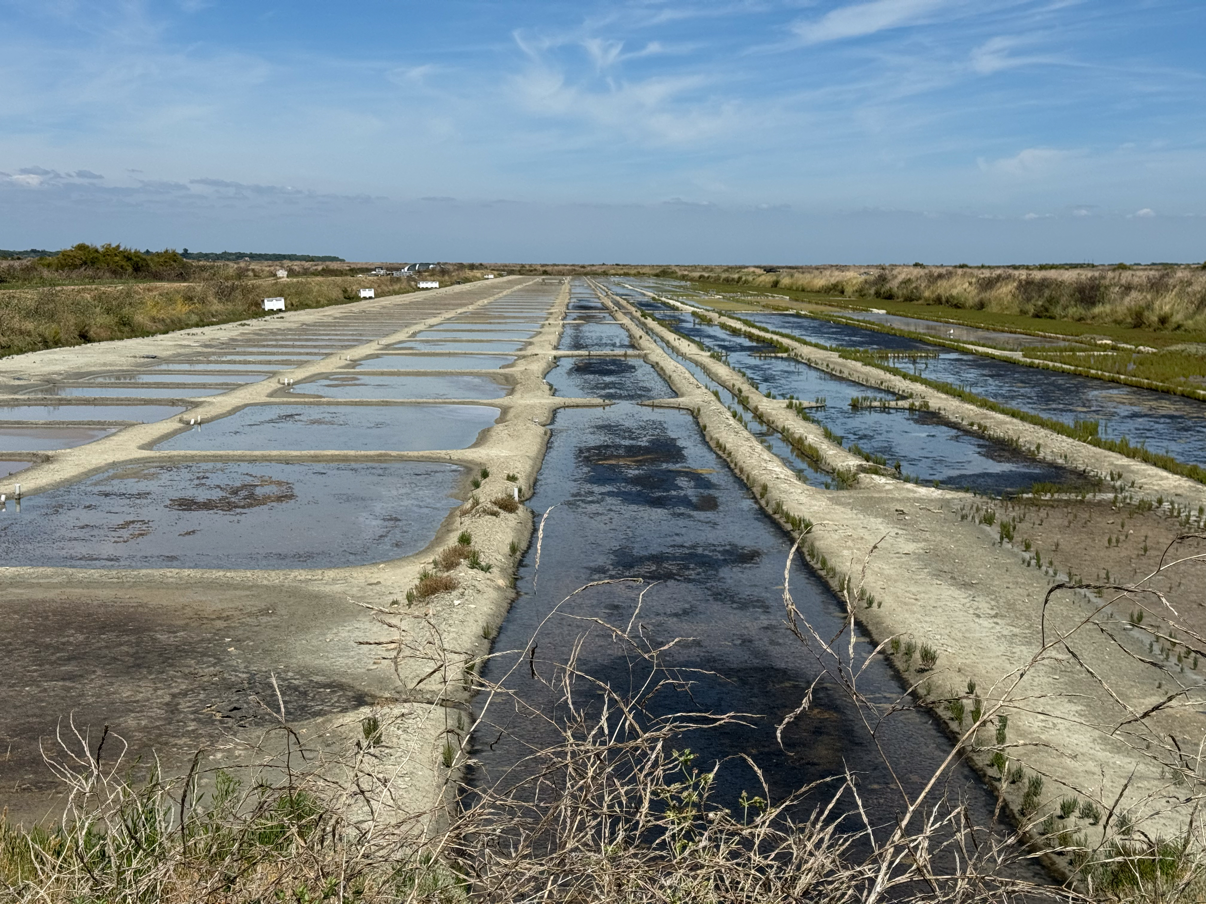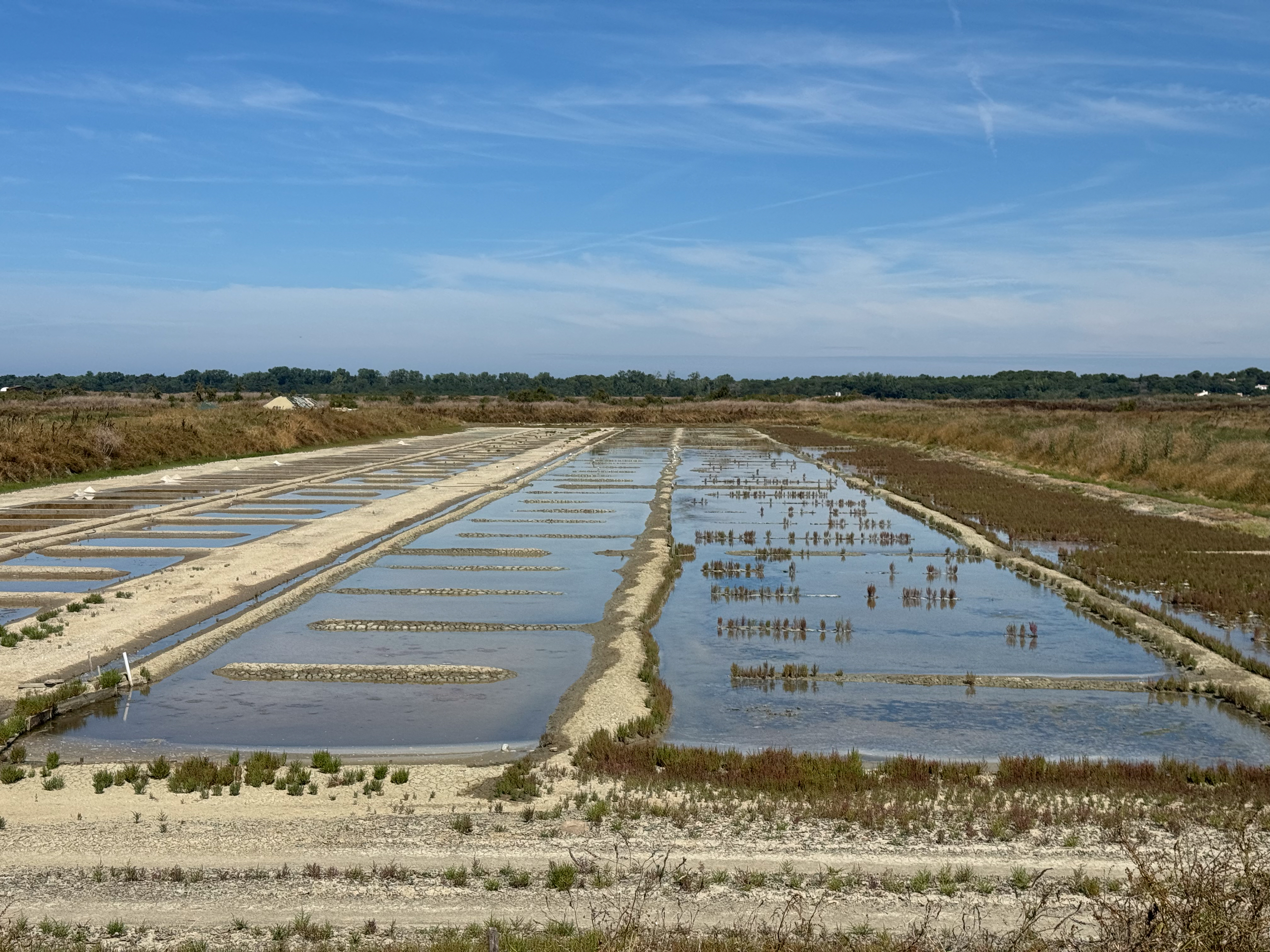 Het is vandaag prachtig fietsweer. De zon schijnt volop, dus we halen de zonnecrème boven. We hebben ons in het verleden al iets té vaak mispakt aan de sterkte van de zon. We fietsen langs talrijke zoutwinningen. Overal langs de weg staan standjes waar je zakjes met natuurlijk zeezout kan kopen. De standjes zijn onbemand: je moet gewoon geld achter laten in een bankje en that’s it. We genieten van de tocht door een prachtig natuurgebied met veel vogels. Alleen vervelend dat Komoot ons soms langs een route wil sturen waar je niet mag fietsen.