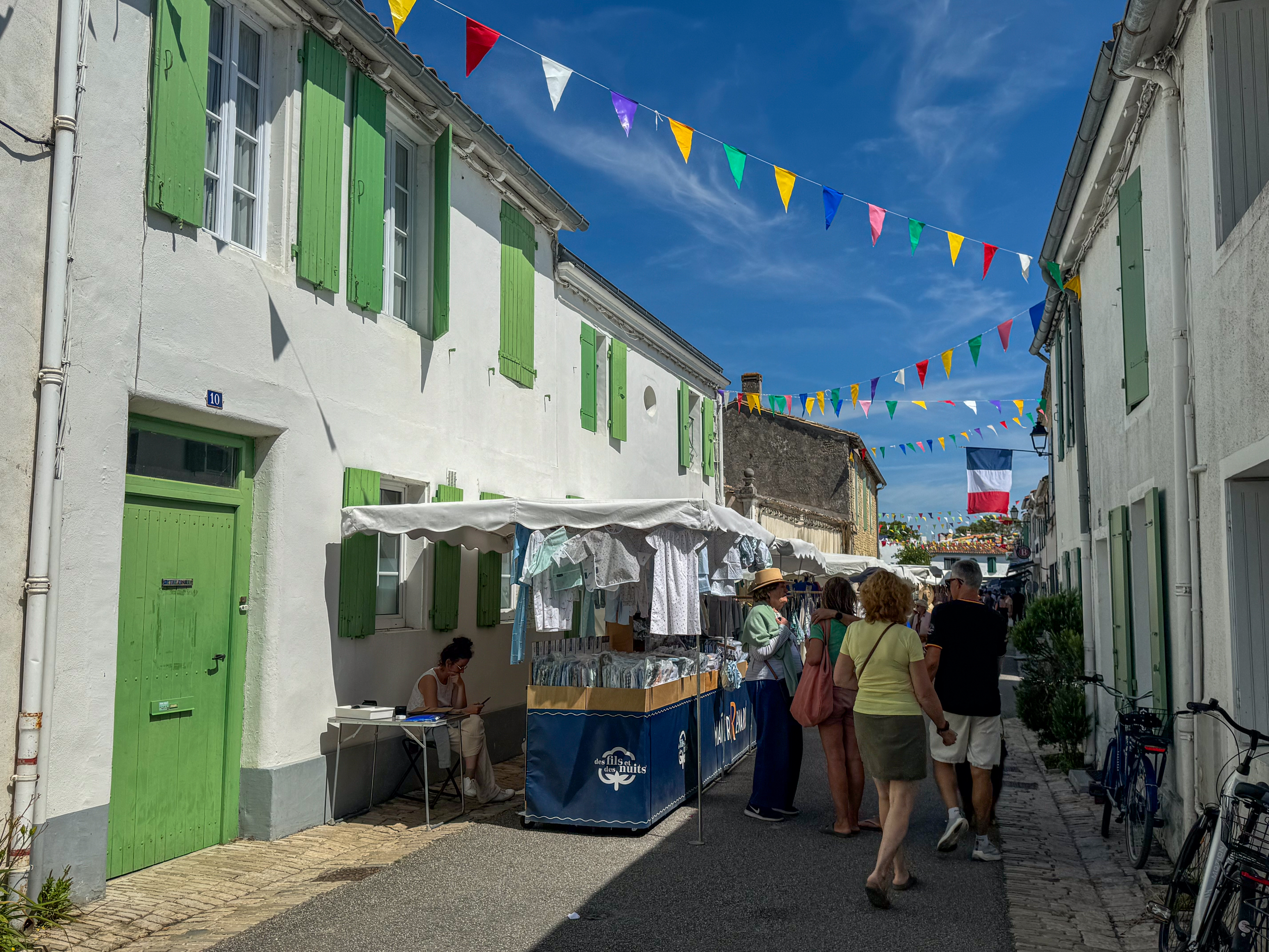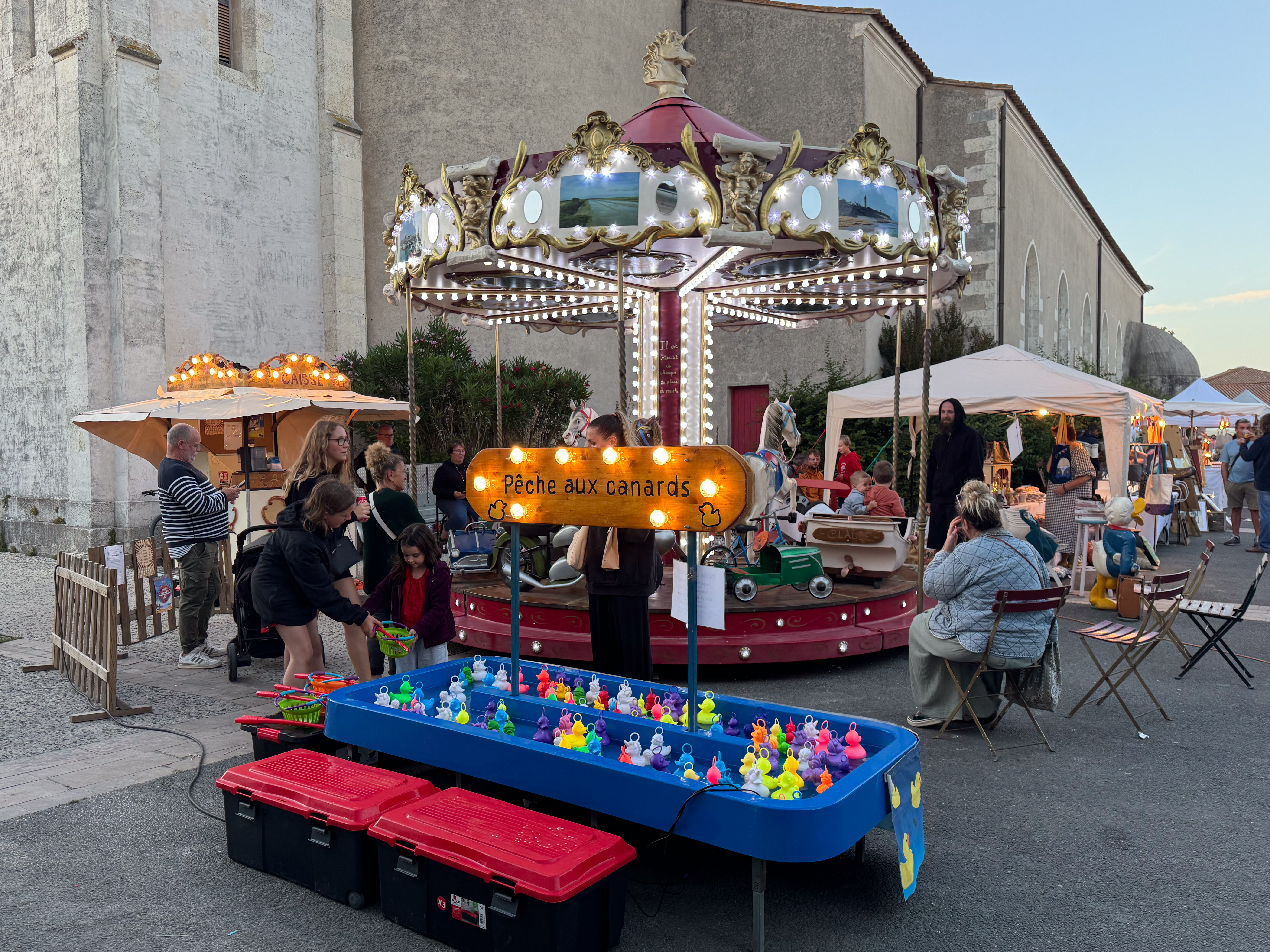 Na het diner maken we een wandeling door het dorp. Voor de kerk staat er nu een marktje met allerlei handgemaakte spullen en zelfs een kleine draaimolen en eendjeskraam. Allemaal ter ere van het honderdvijftigjarige bestaan met Saint-Clément-des-Baleines.