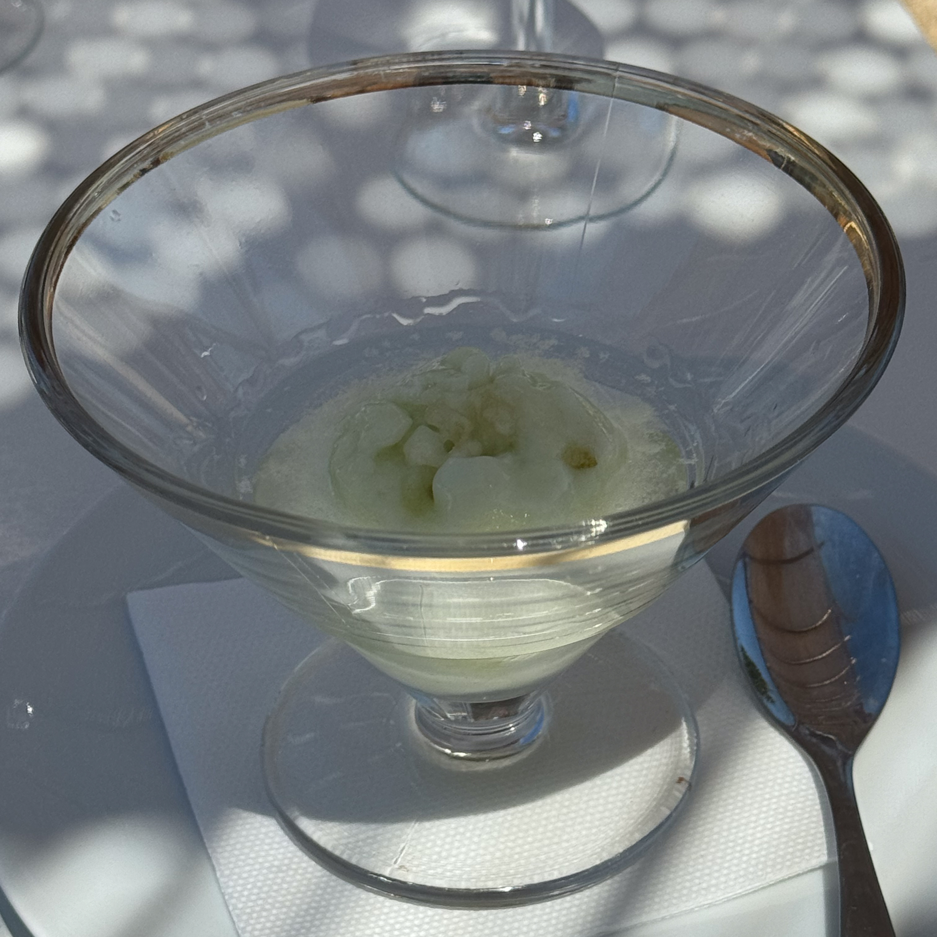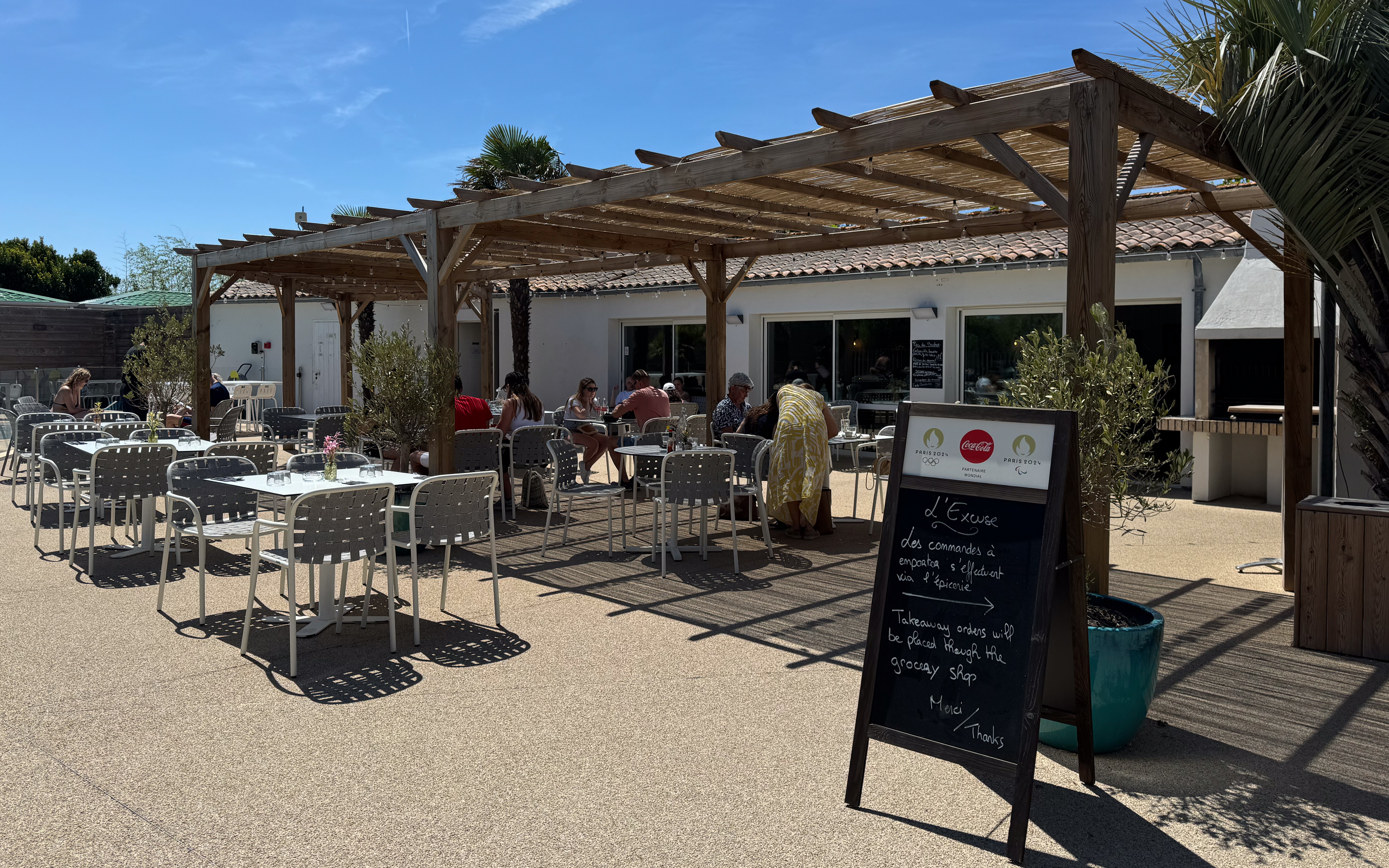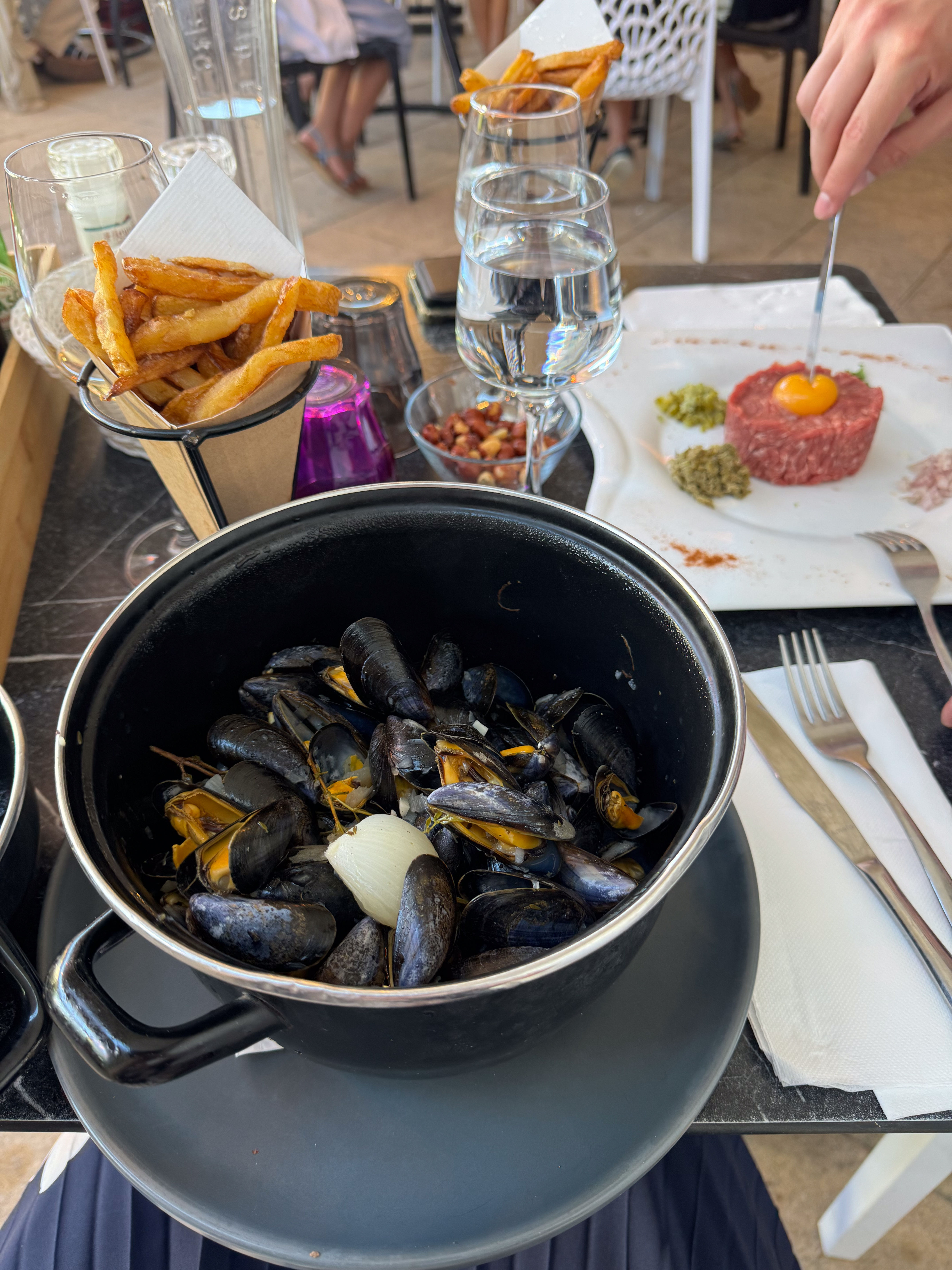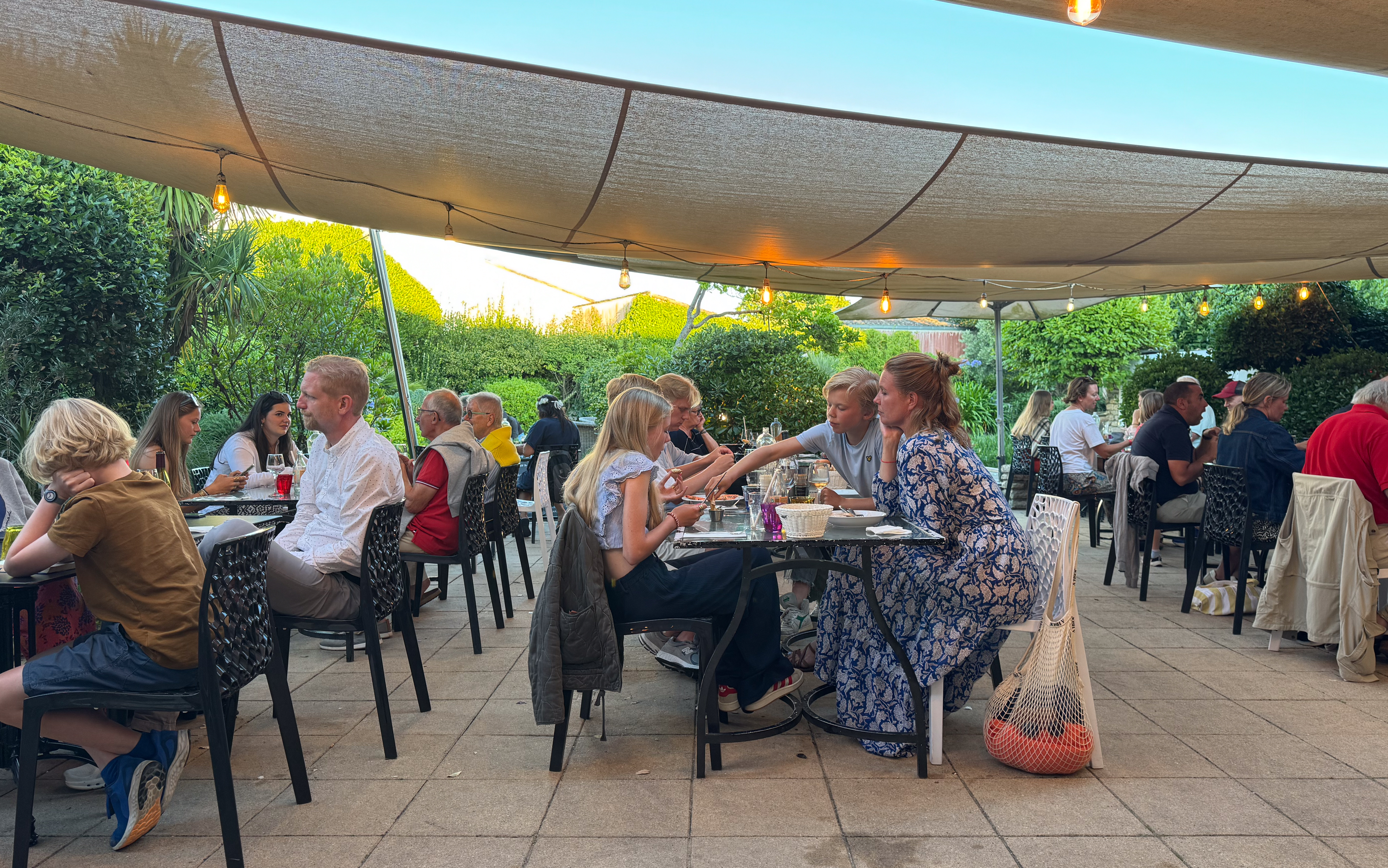 Na een deugddoende douche om het zoute zwembadwater van ons af te spoelen gaan we dineren bij La Villa, een groot restaurant met een mooie en gezellige tuin. Ik geniet van heerlijke vissoep als voorgerecht, maar de mosselen vallen tegen. Ik vergeet altijd dat Franse mosselen niet kunnen tippen aan de Zeeuwse. Jammer, maar niets aan te doen! Door de schaarsheid van de mosselen had ik wel nog plaats voor een geflambeerd pannenkoekje als dessert. Yummie!