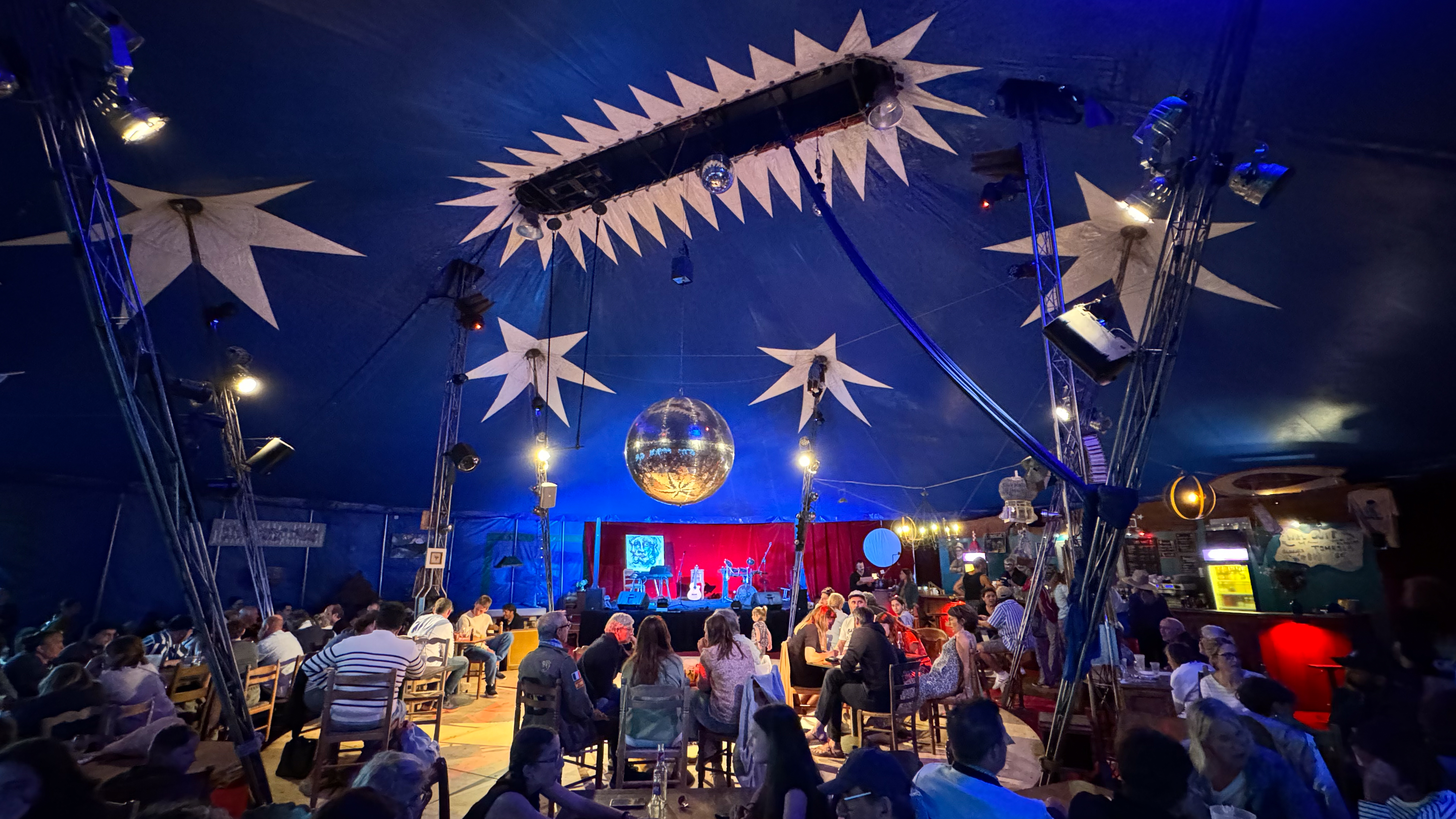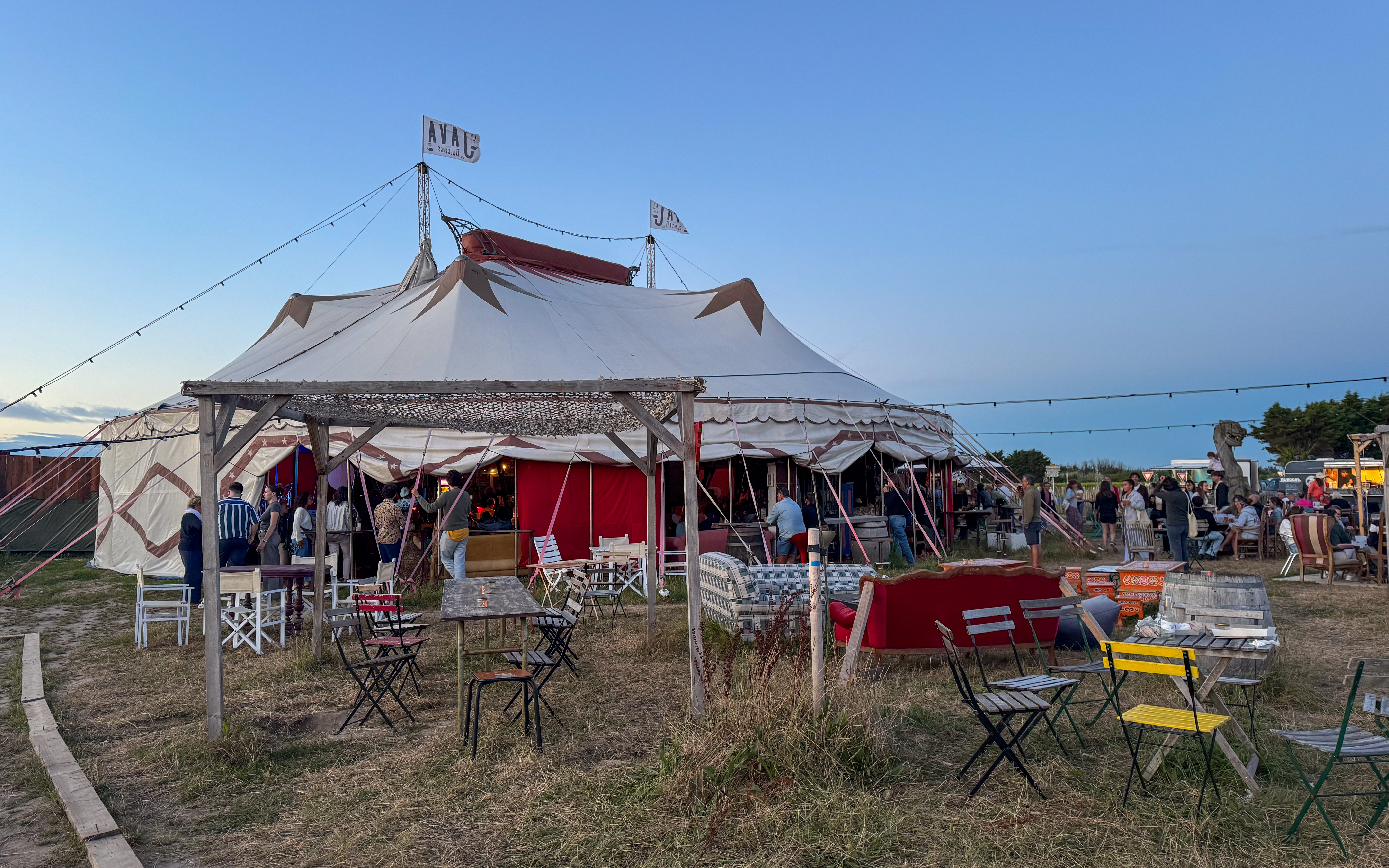 Wat verderop treffen we op een groot veld een tent waar een muziekquiz aan de gang is. Op het terrein staan ook een paar foodtrucks en je kan je eender waar neer vleien in allerlei oude stoelen en zetels, wat een leuke en gezellige kakafonie oplevert.