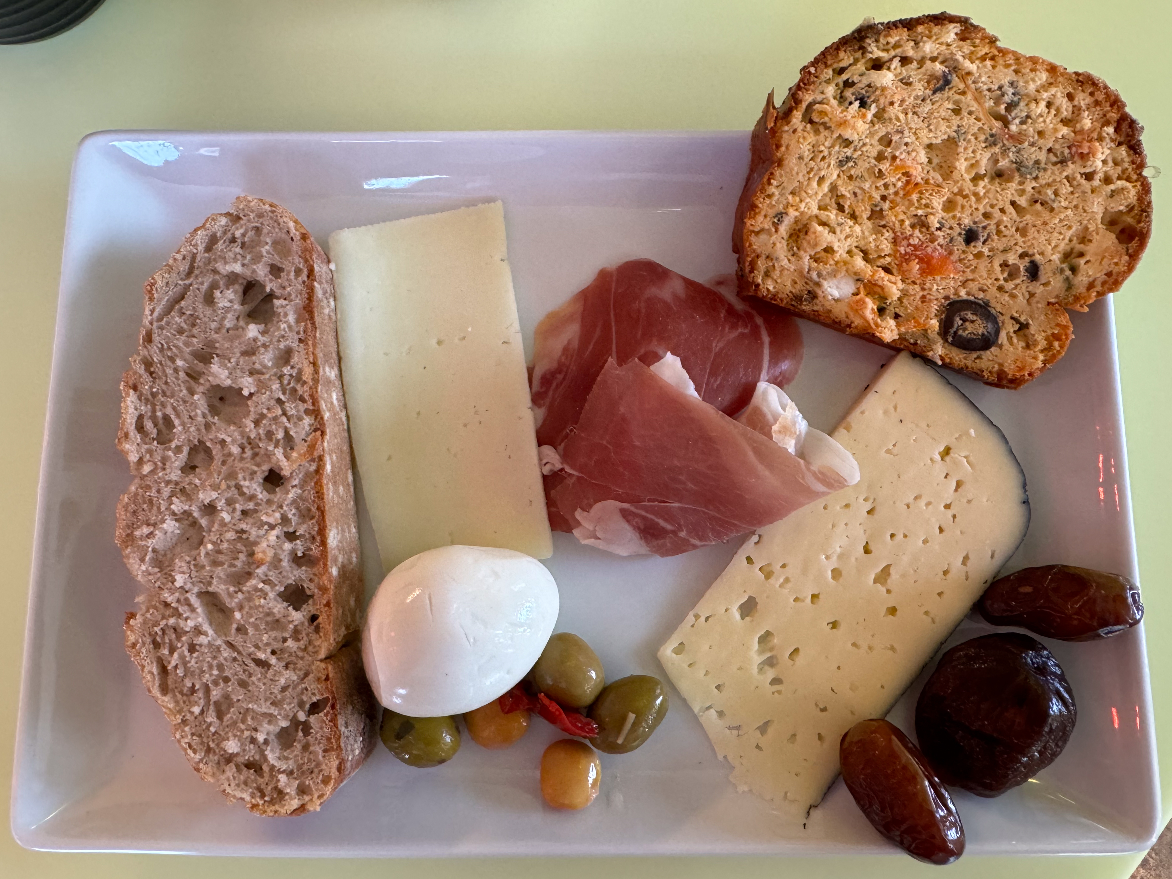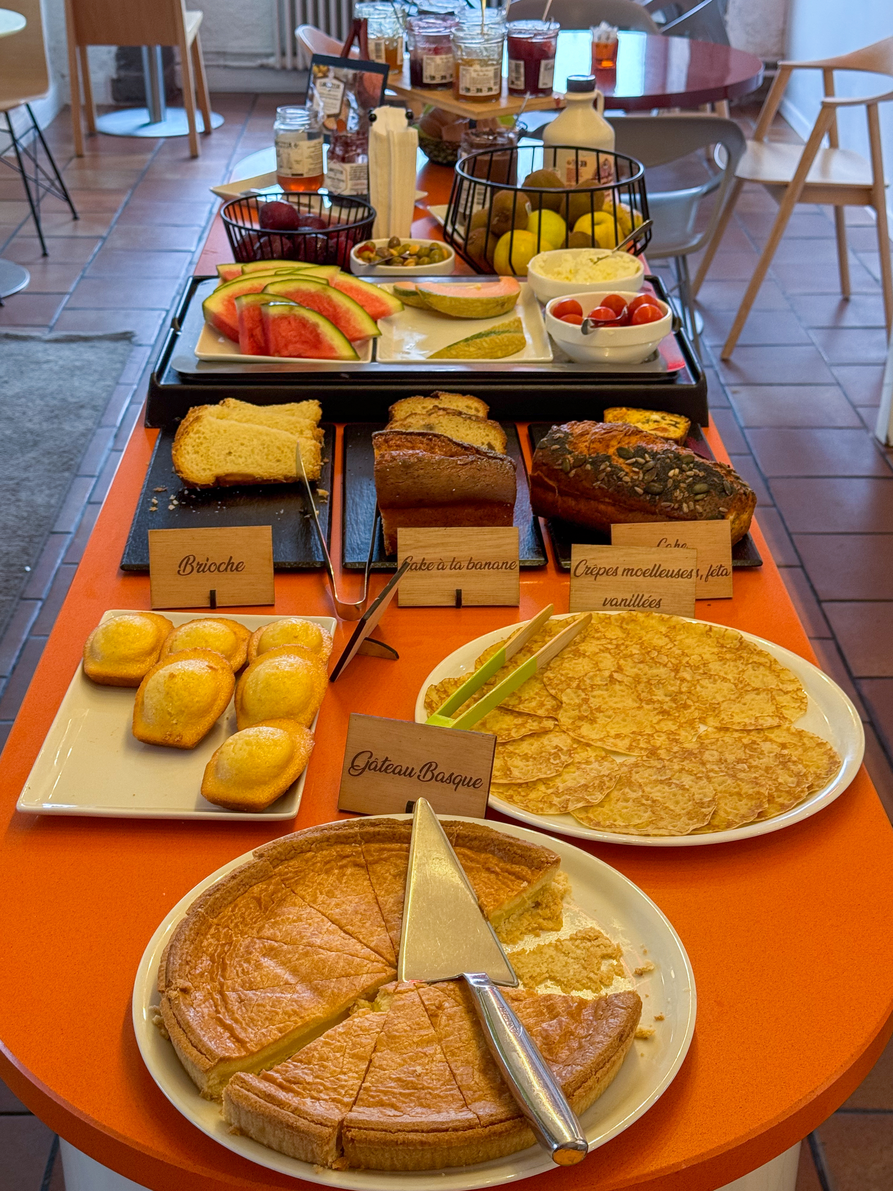Vandaag starten we de dag opnieuw met een uitstekend ontbijt met veel variatie. Ik ben een grote fan van de hartige cake met fetakaas, tomaten en olijven, yummie. Alleen de scrambled eggs ontbreken om het helemaal af te maken.