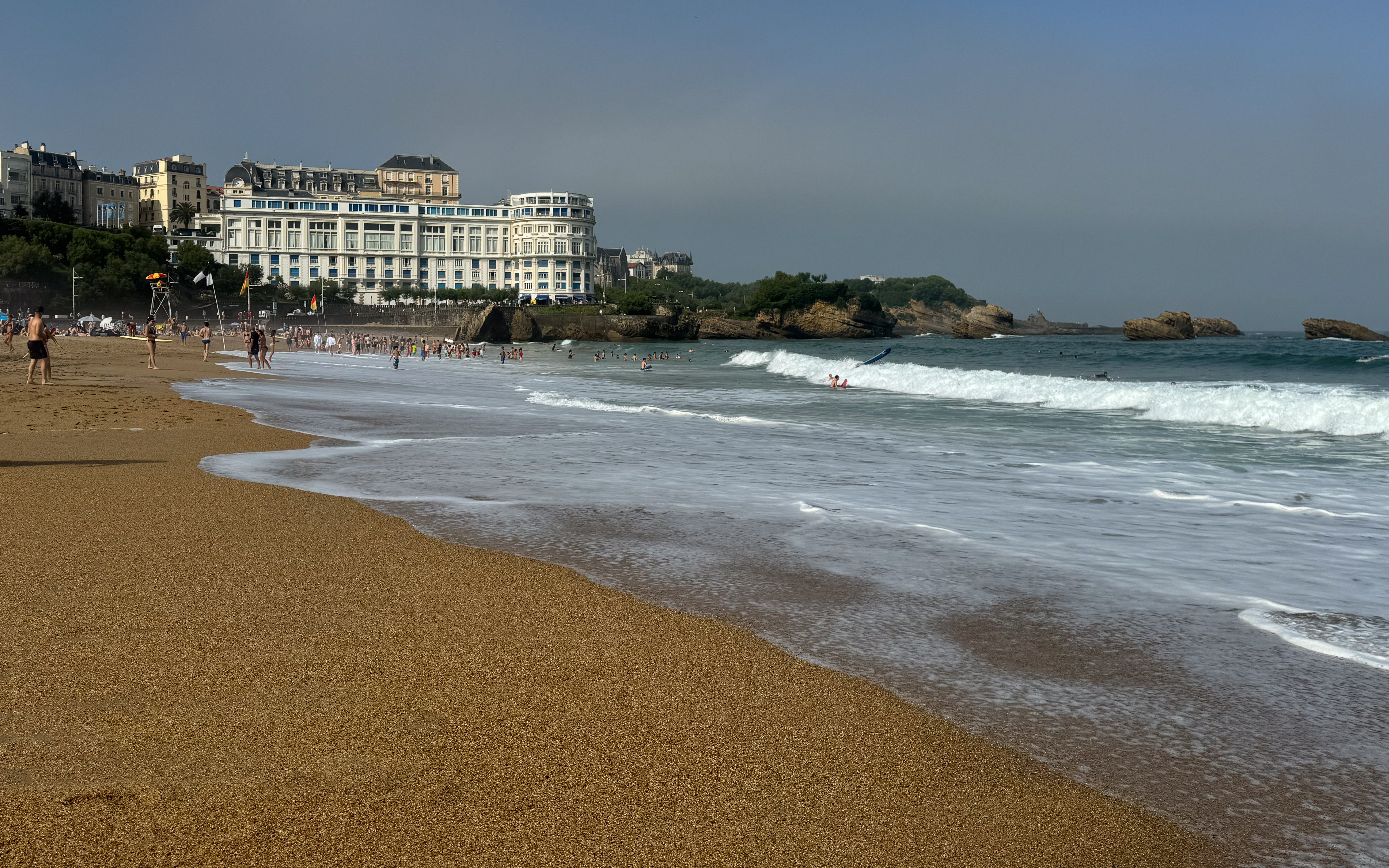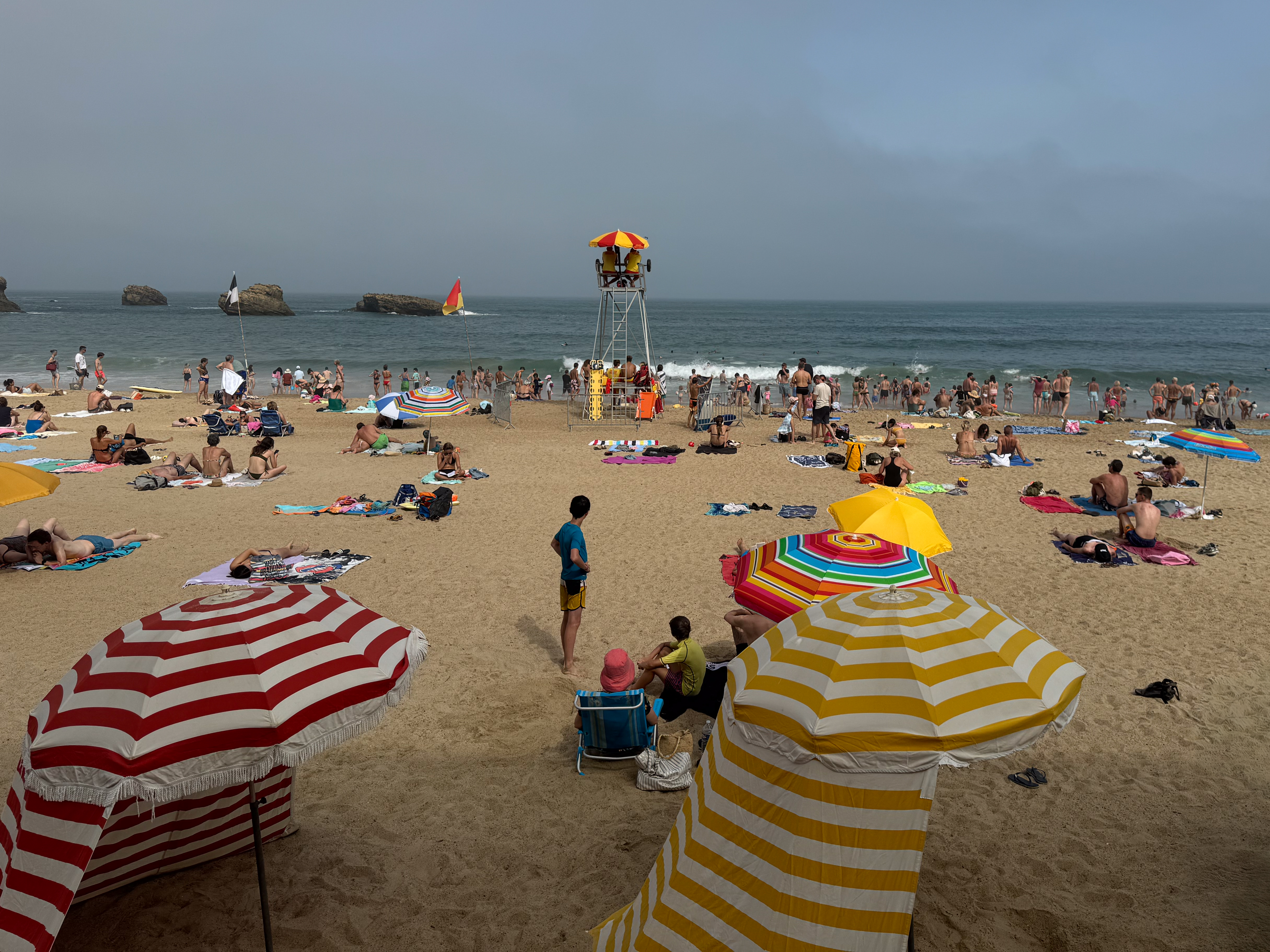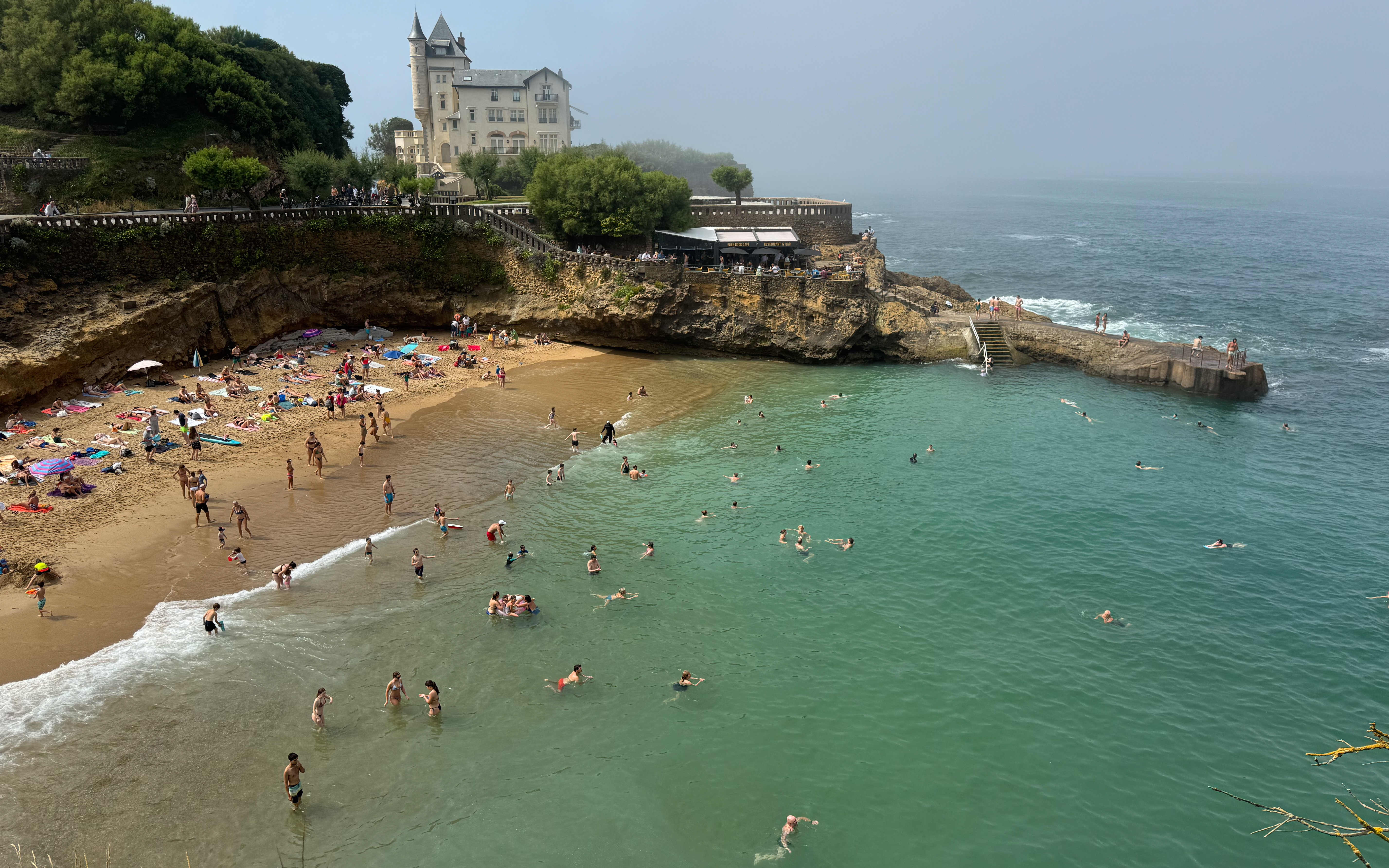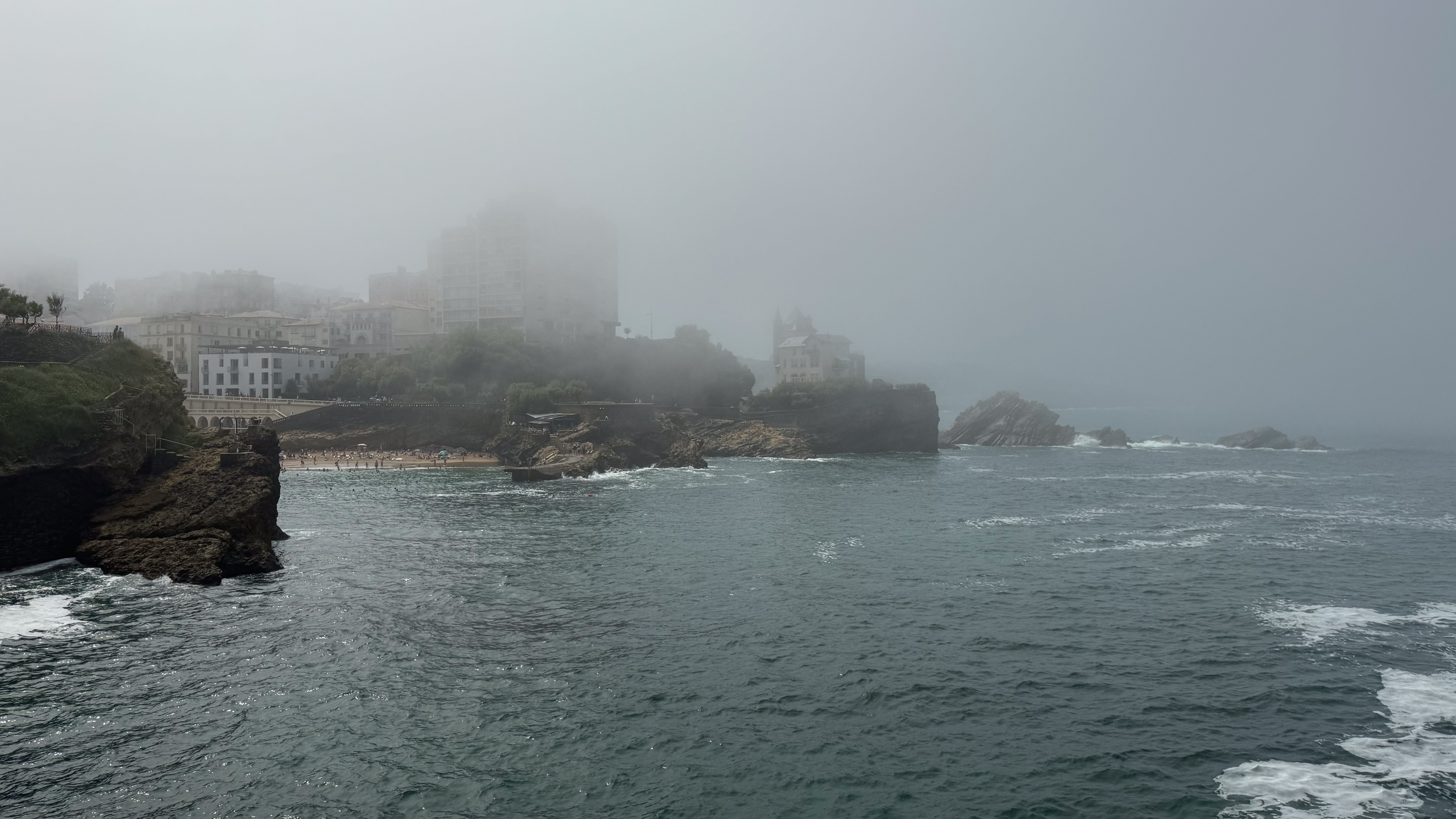Maar voordat we ons neervlijen in onze strandtent gaan we eerst op verkenning in Biarritz. We wandelen langs de mooie kustlijn met goudgele stranden afgewisseld met ruige rotspartijen. Tot onze grote verbazing komt er opeens geheel onverwacht uit het niets een mistdeken alles bedekken. Wat aanleiding geeft tot bijzonder sfeervolle foto’s.