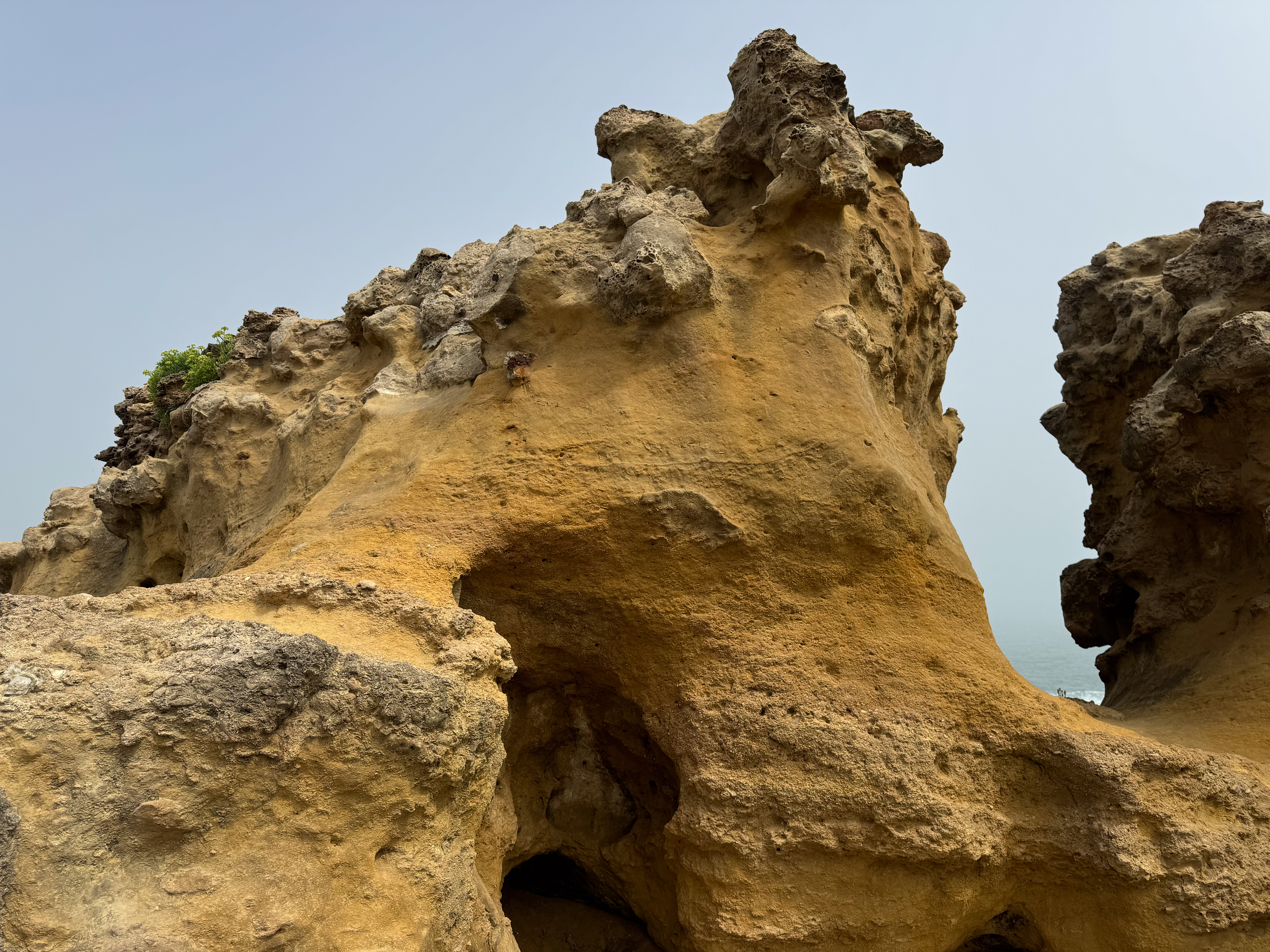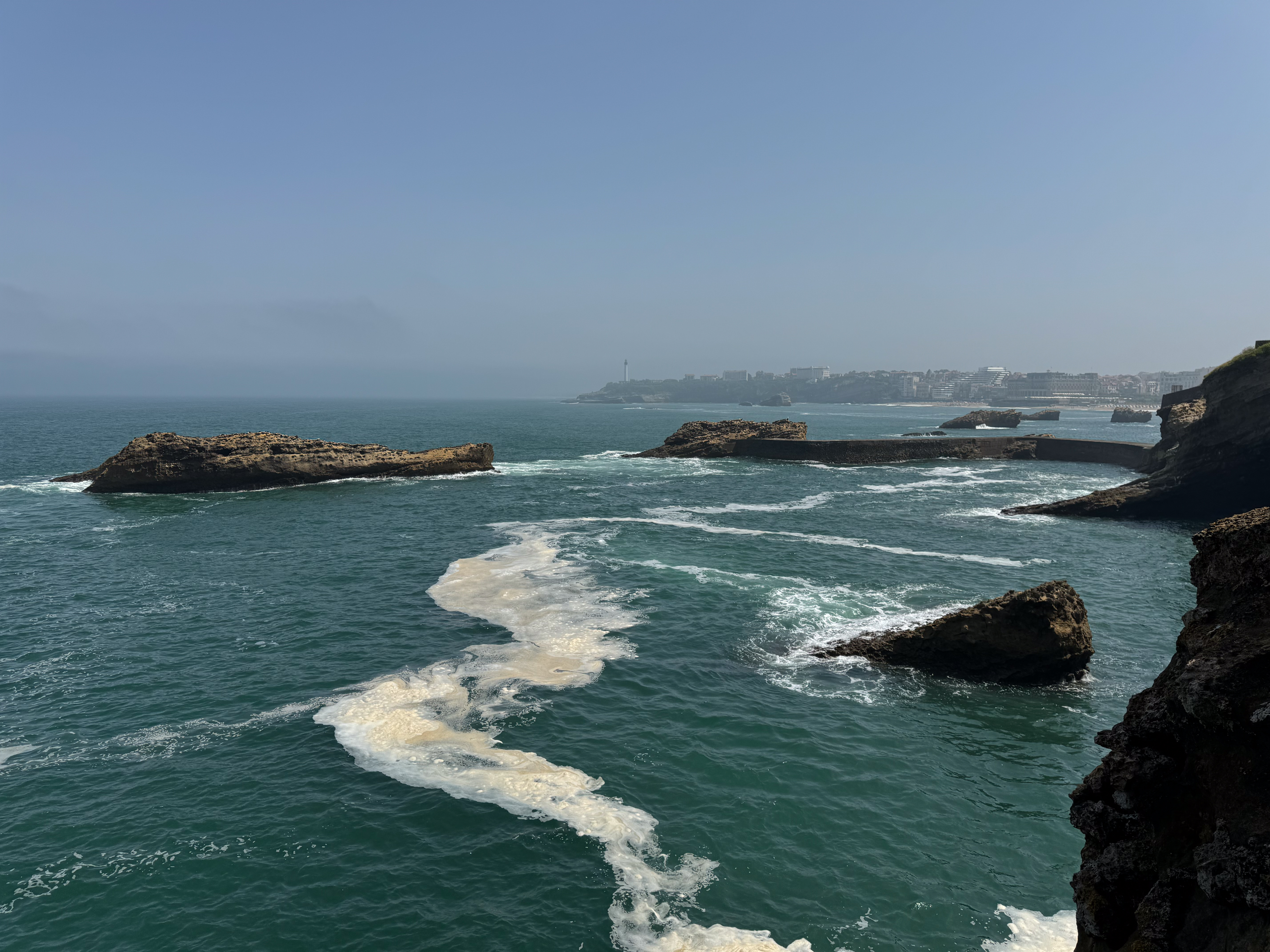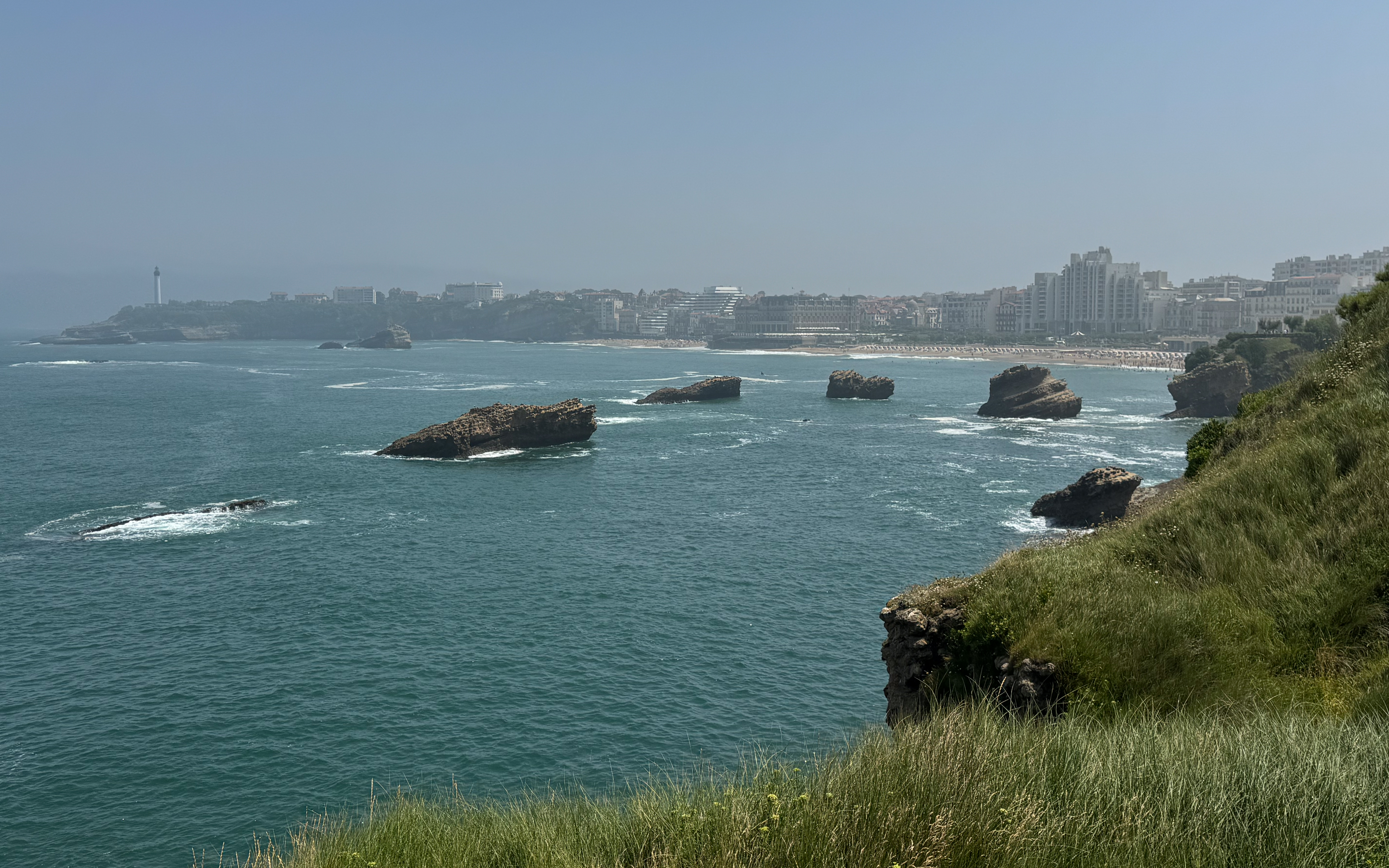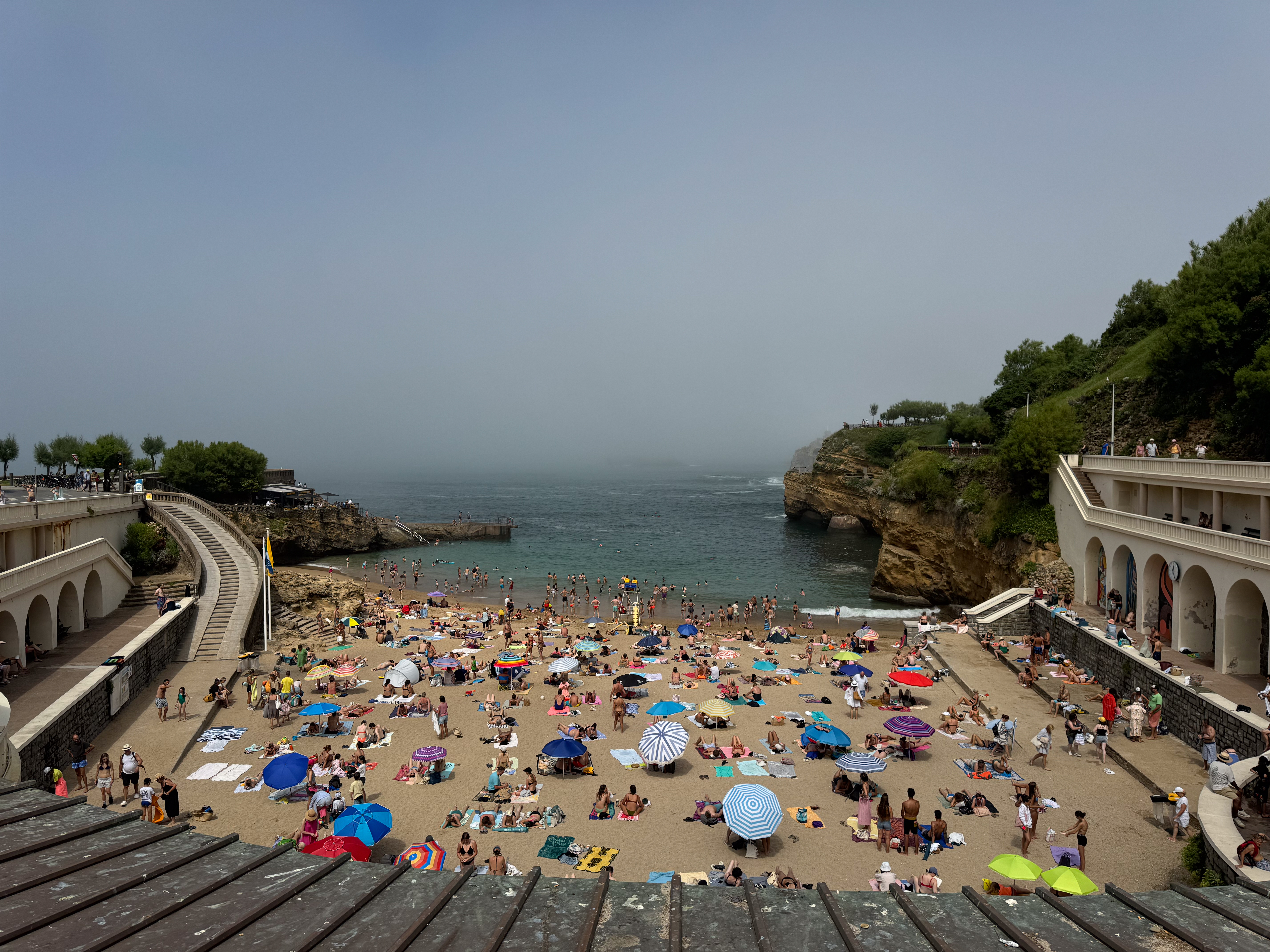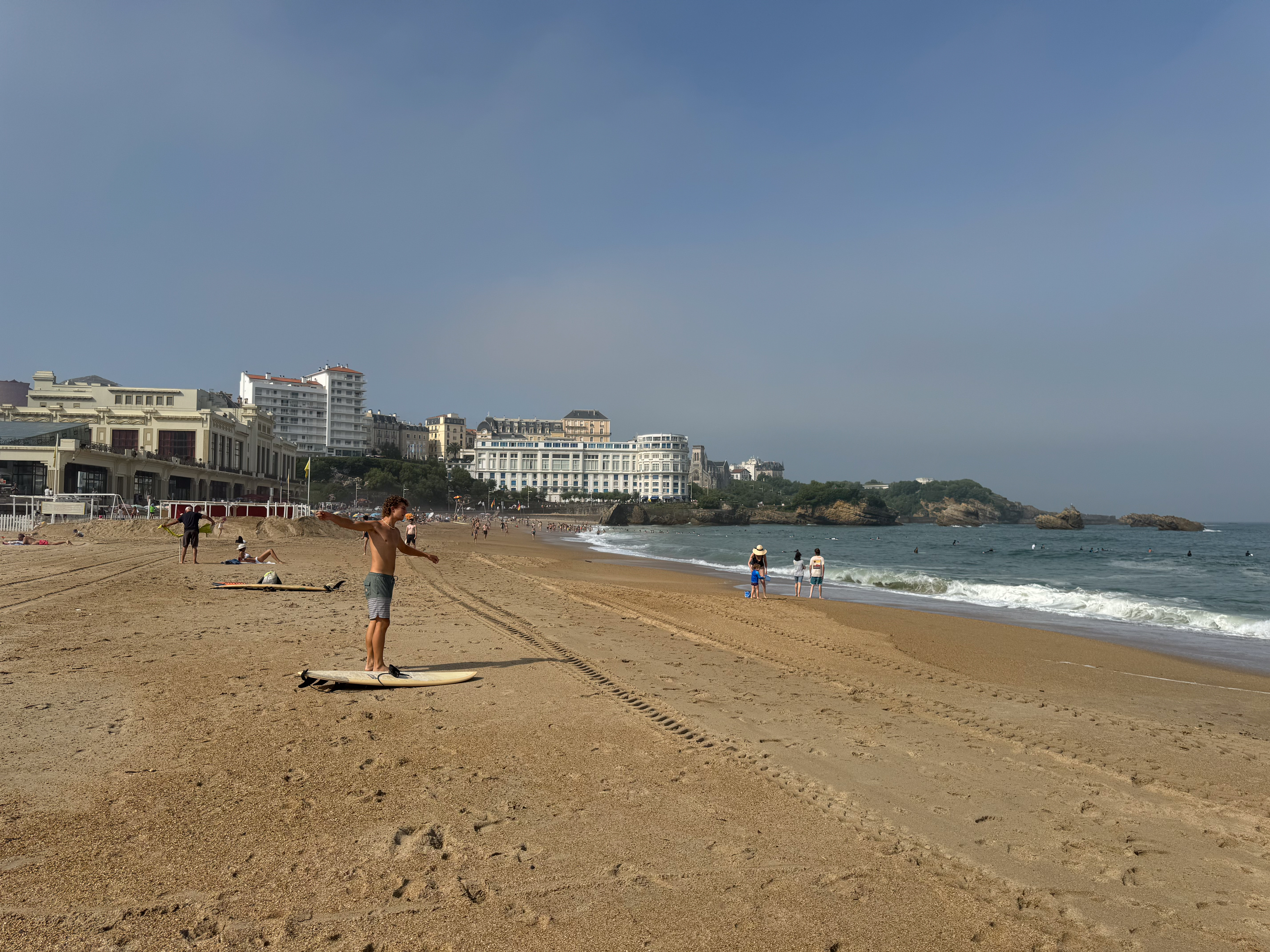 Maar voordat we ons neervlijen in onze strandtent gaan we eerst op verkenning in Biarritz. We wandelen langs de mooie kustlijn met goudgele stranden afgewisseld met ruige rotspartijen. Tot onze grote verbazing komt er opeens geheel onverwacht uit het niets een mistdeken alles bedekken. Wat aanleiding geeft tot bijzonder sfeervolle foto’s.