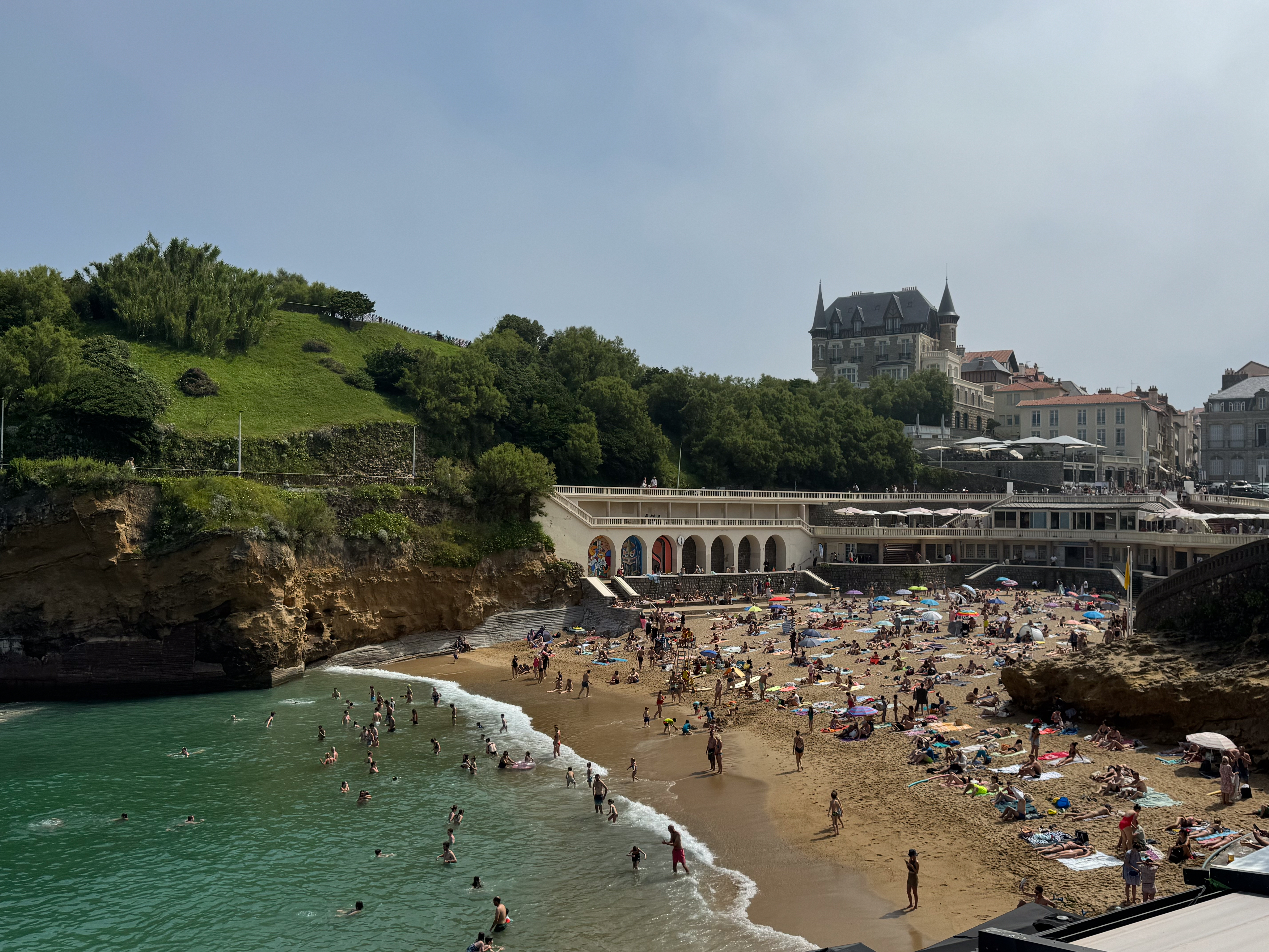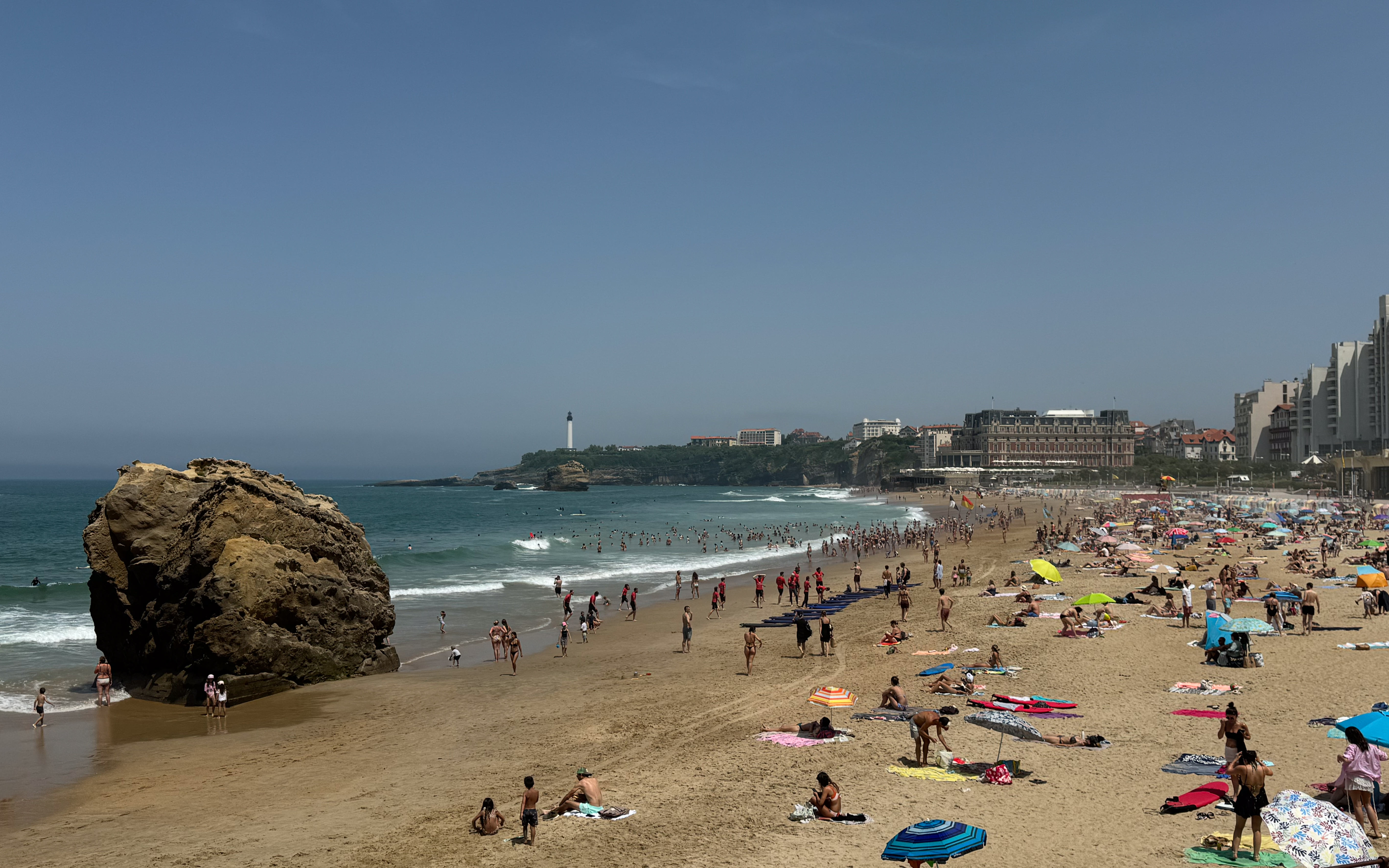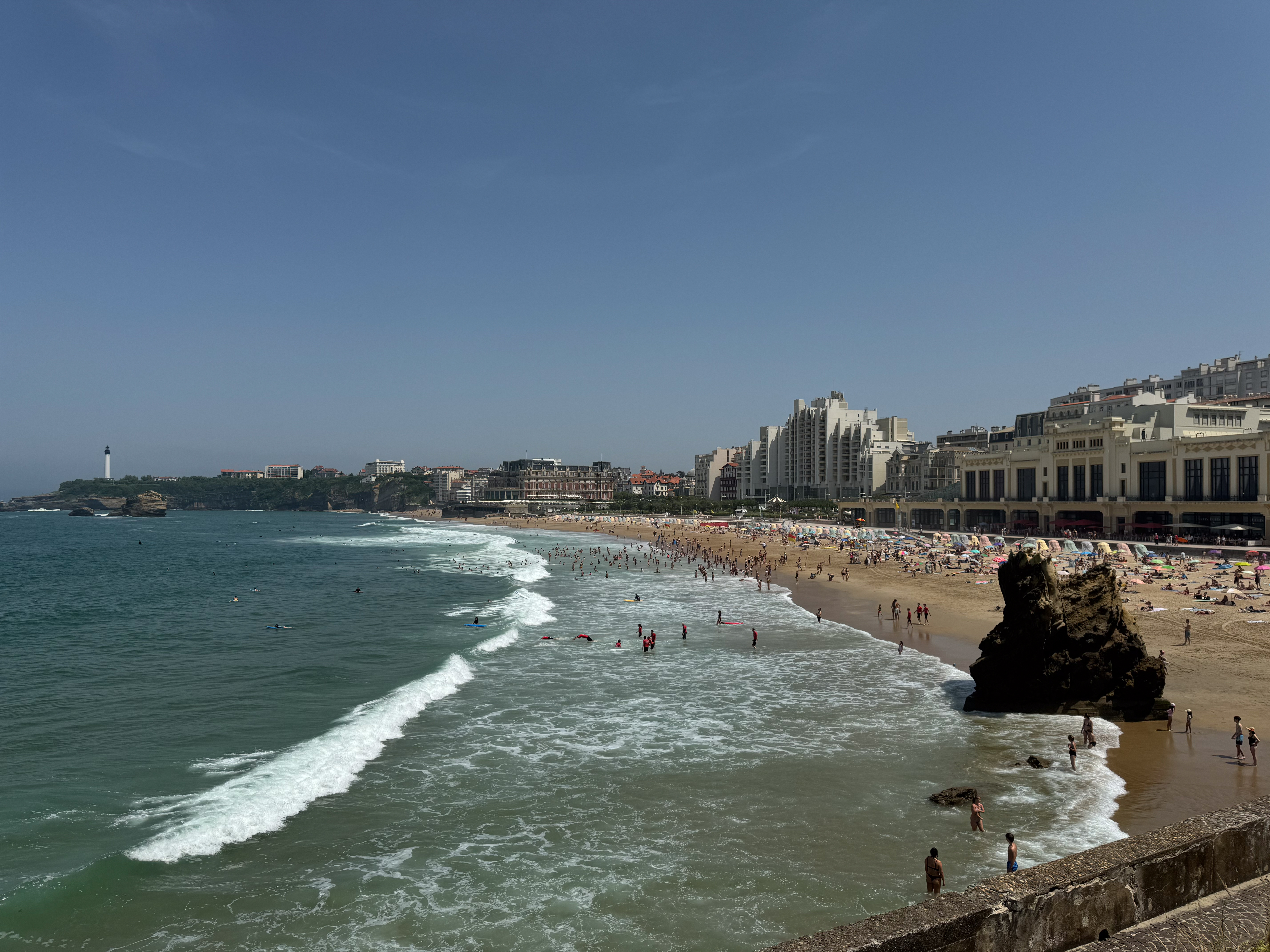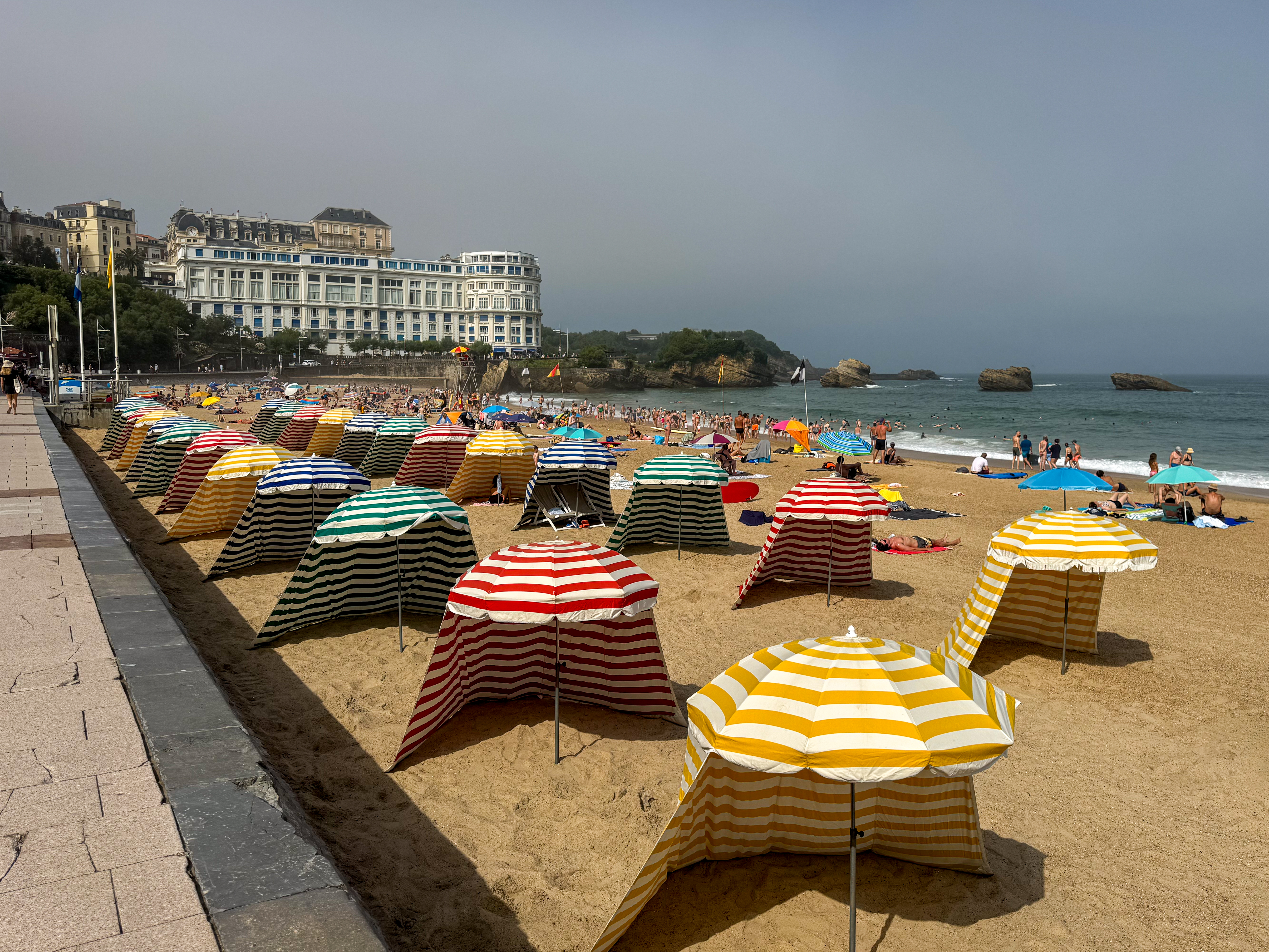Na een vlotte rit van een twintig minuten parkeren we onze wagen in parking Grande Plage, letterlijk vlakbij het mooie zandstrand van Biarritz. Bijzonder handig. We laten de strandspullen achter in de wagen en wandelen eerst naar het strand om een tent en strandstoelen te huren. Helaas zijn we al te laat voor de strandstoelen, maar een tent huren lukt nog wel. Het is echt té warm om in de vlakke zon op het strand te zitten.