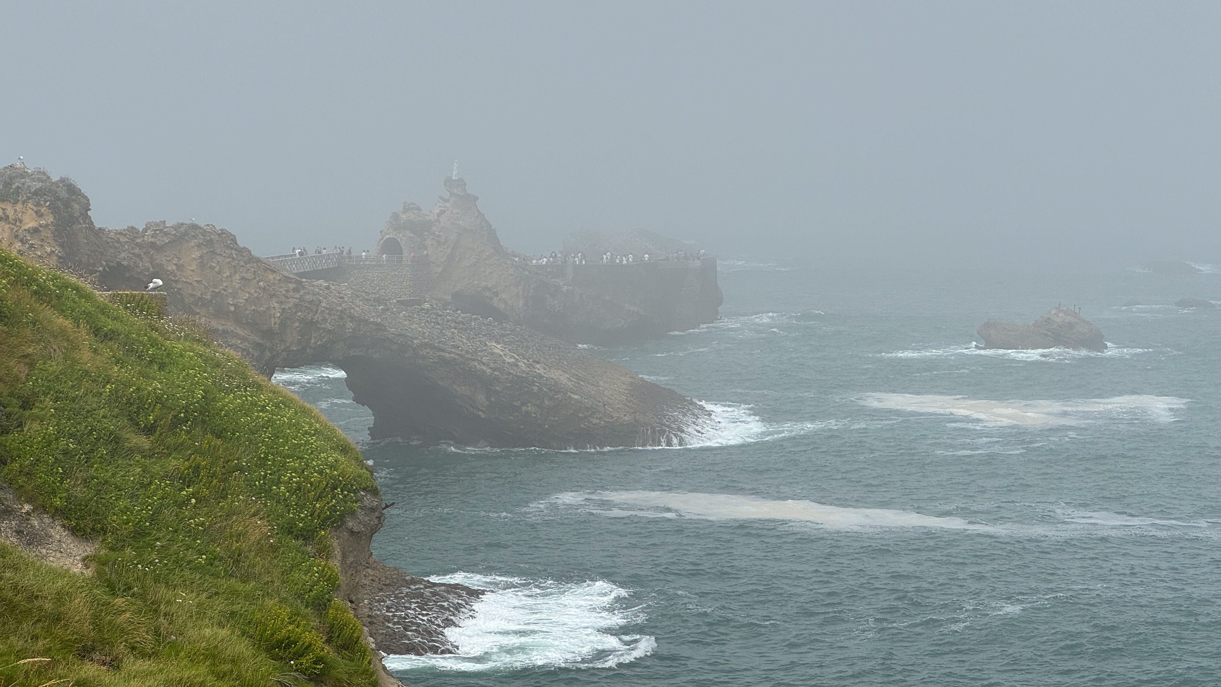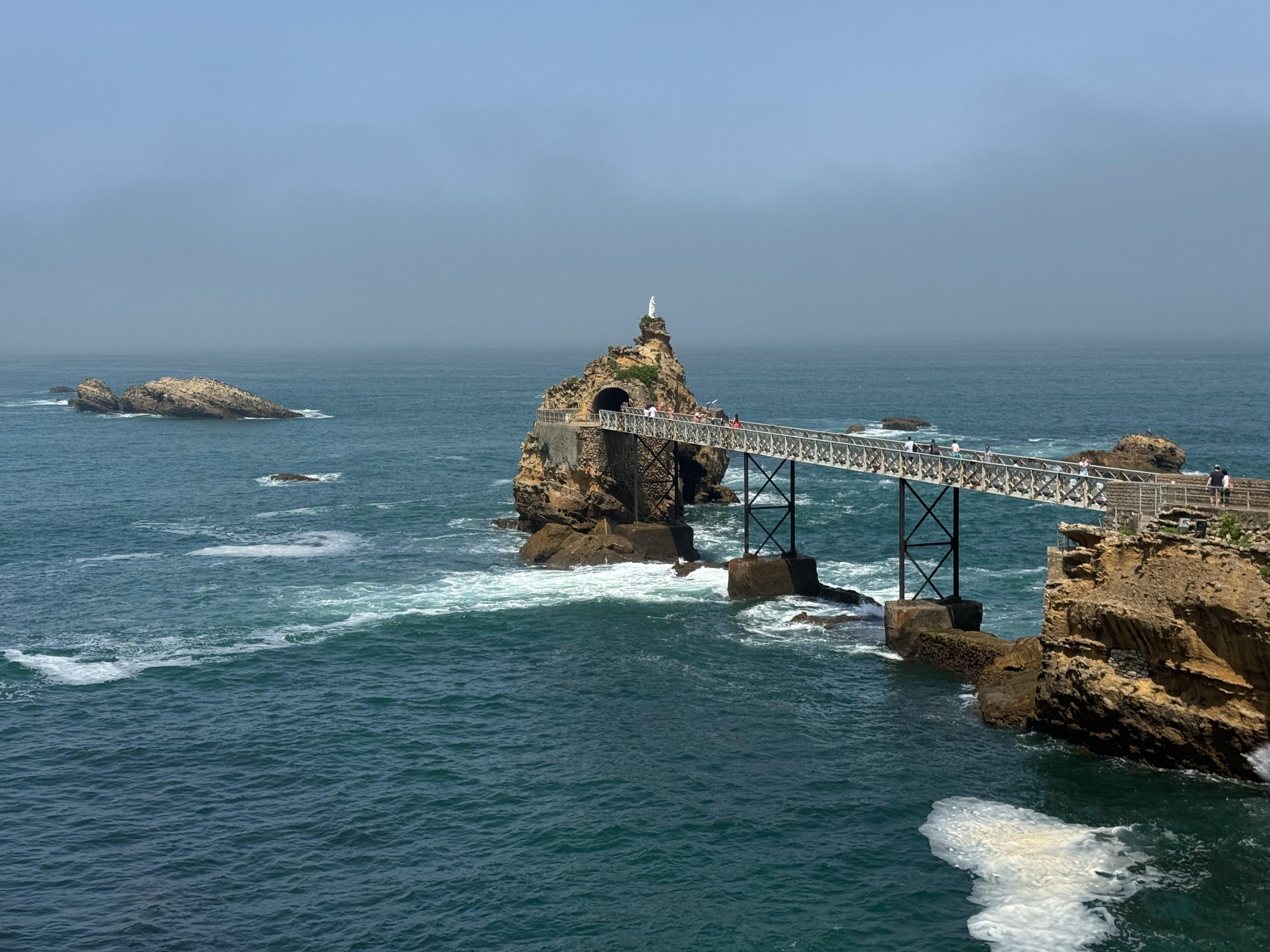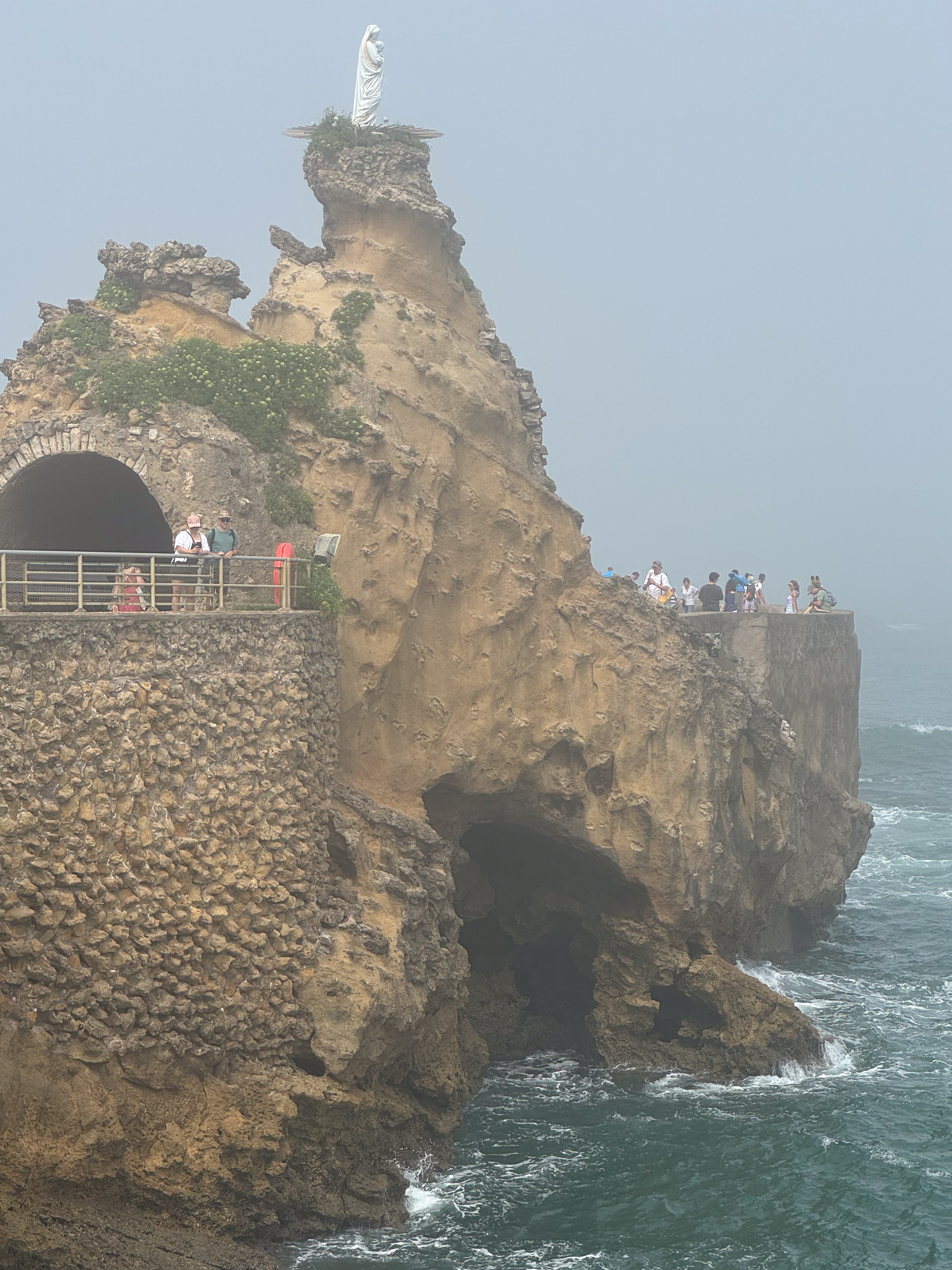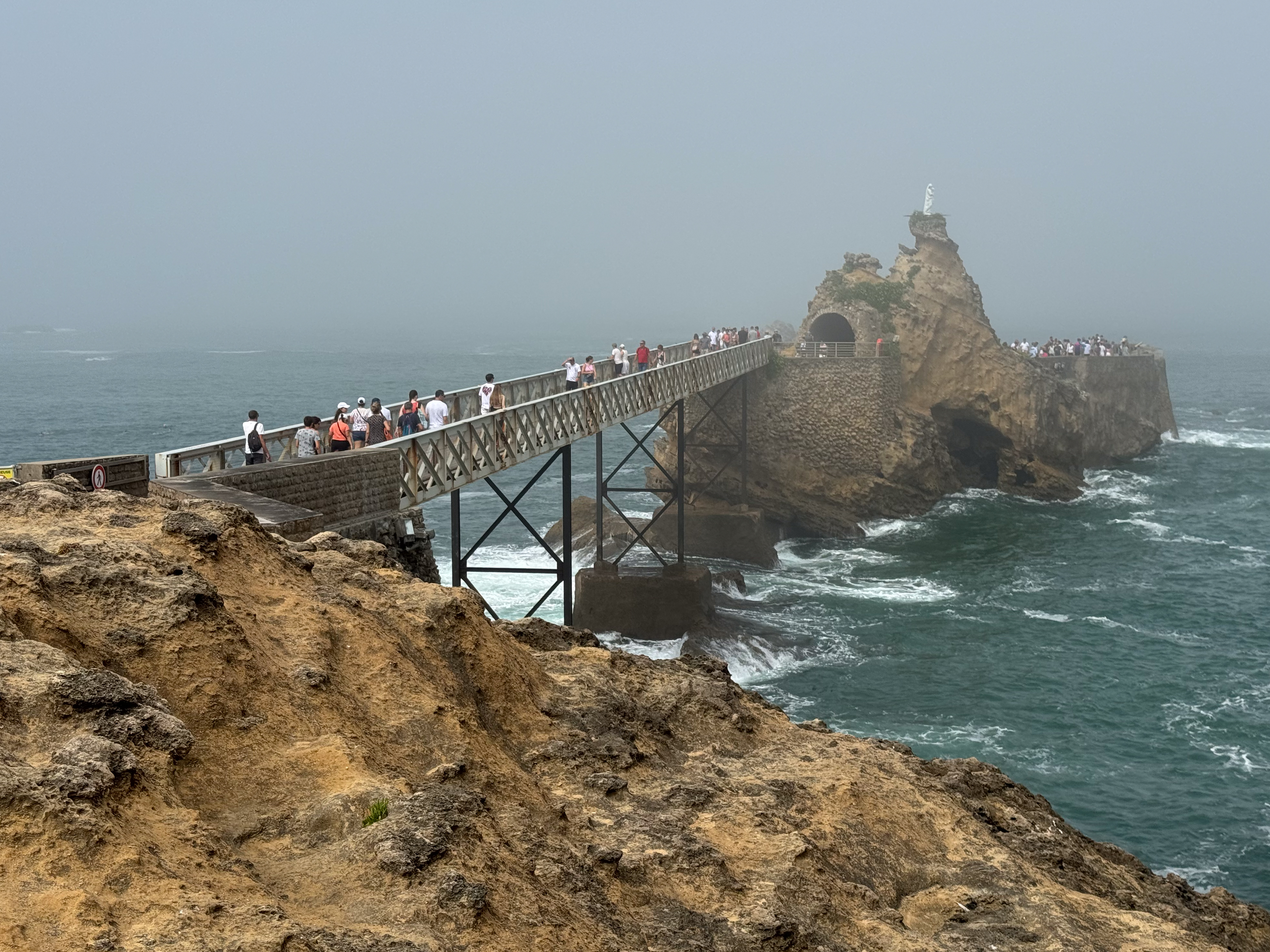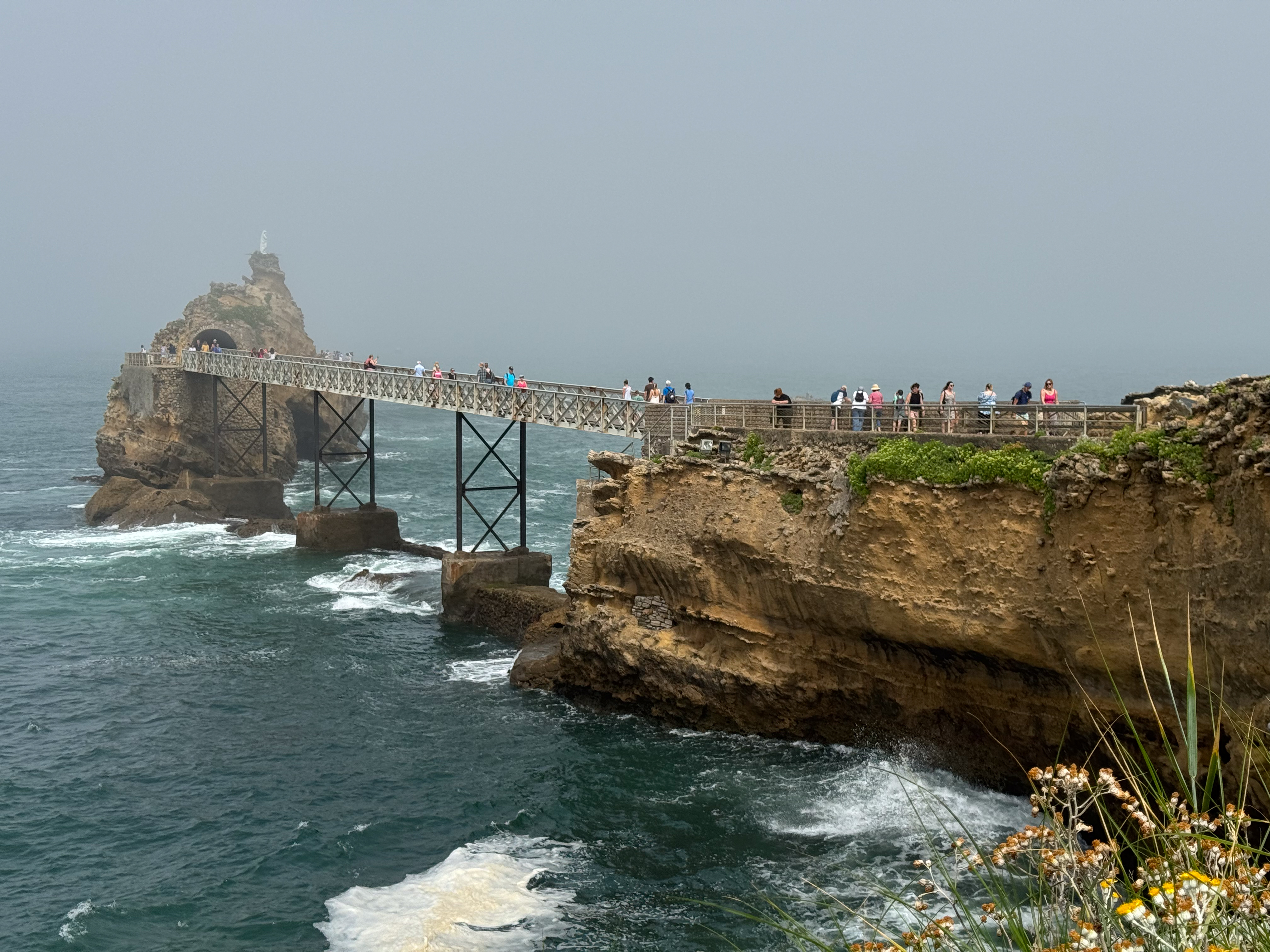 We slenteren verder langs le Port des Pêcheurs, een gezellig haventje met een aantal restaurants, dat er redelijk authentiek uitziet. Terwijl we onze wandeling verder zetten naar Rocher de la Vierge wordt het steeds mistiger. Echt een bizar fenomeen, zo’n zomermist. Het is nog steeds aangenaam warm, maar de warmte is nu veel draaglijker en in niets te vergelijken met de hitte gisteren in Bayonne. We lopen over de voetgangersbrug tot aan het uitkijkplatform aan de achterkant van de rots met het mariabeeld.