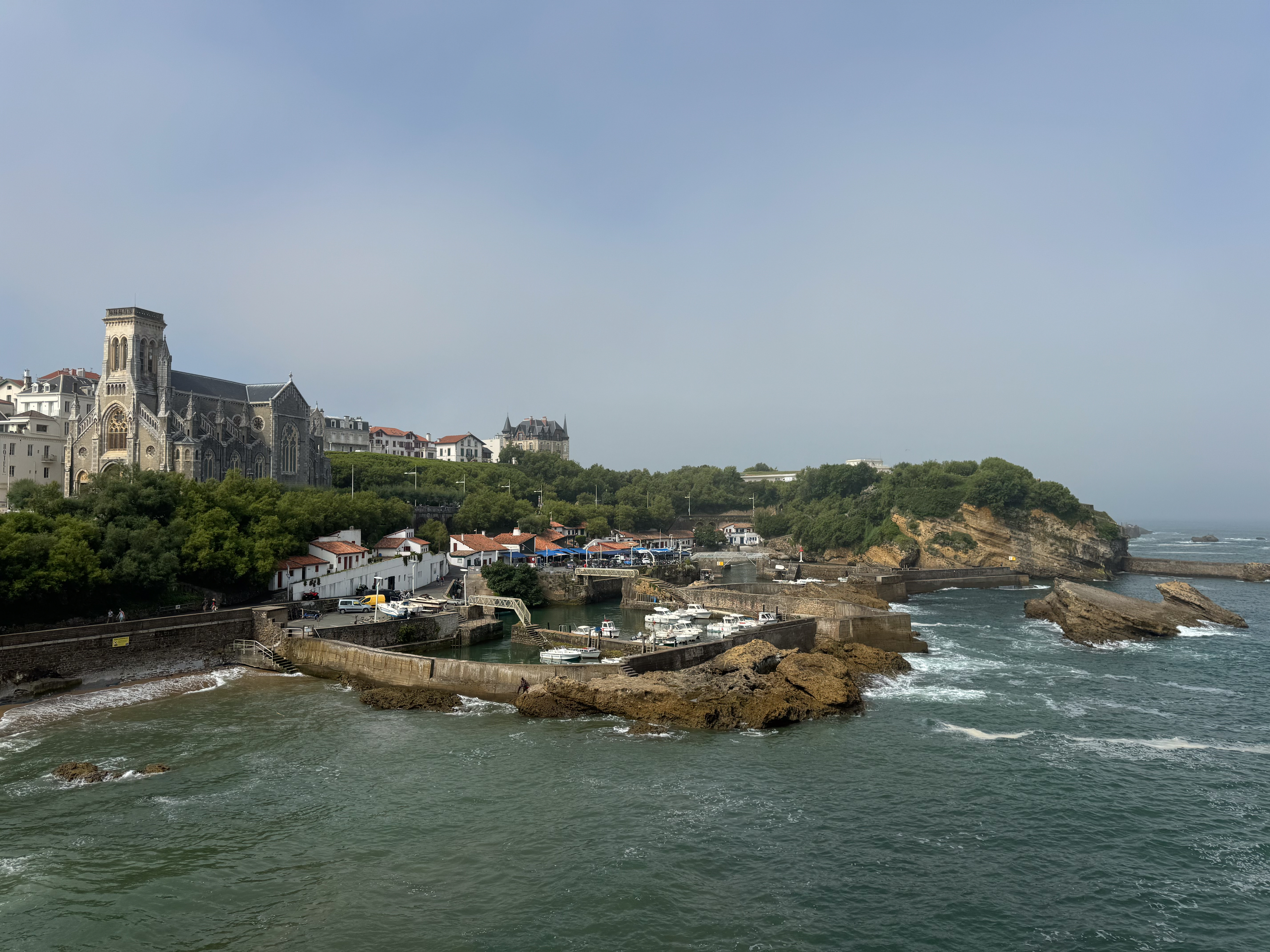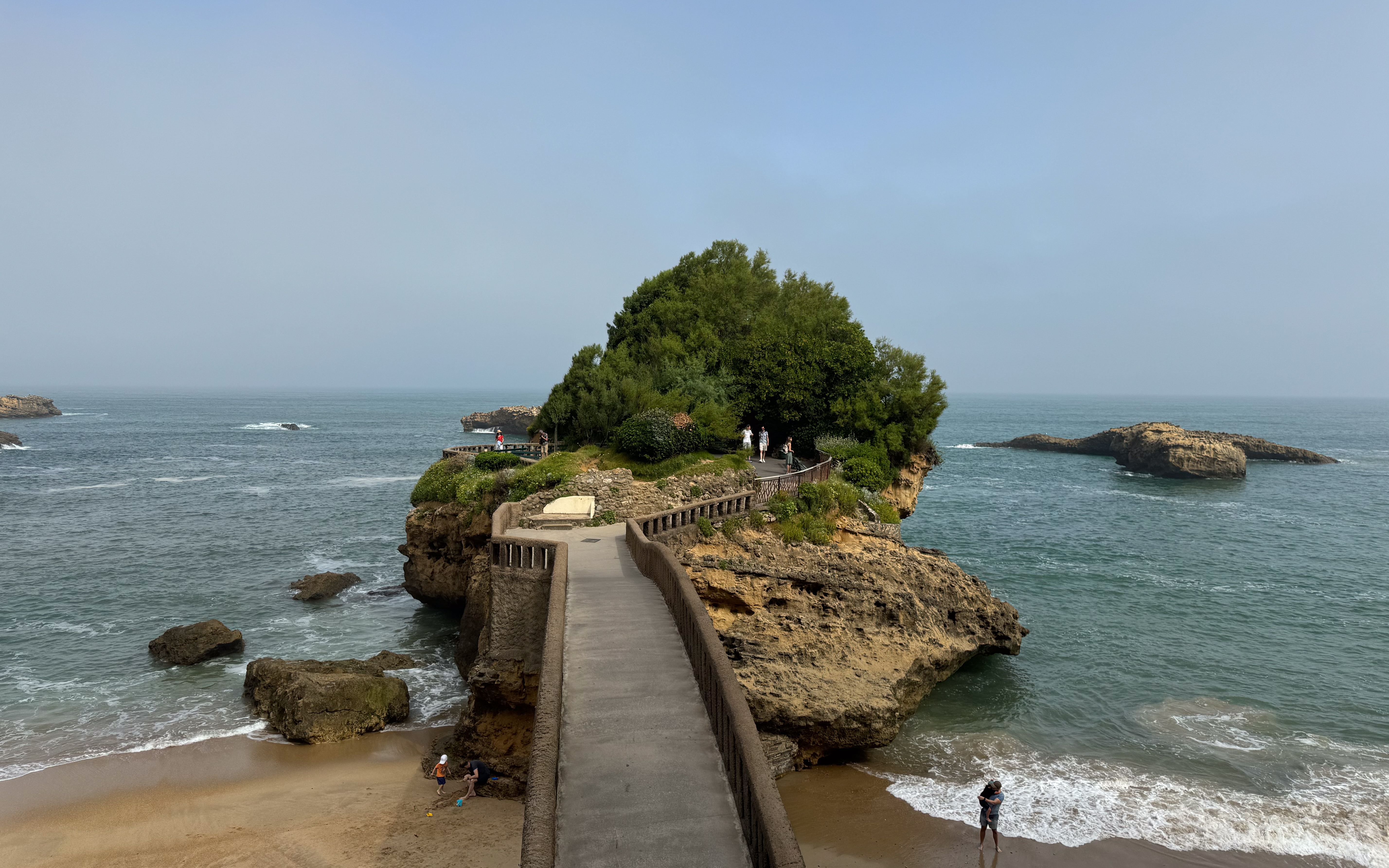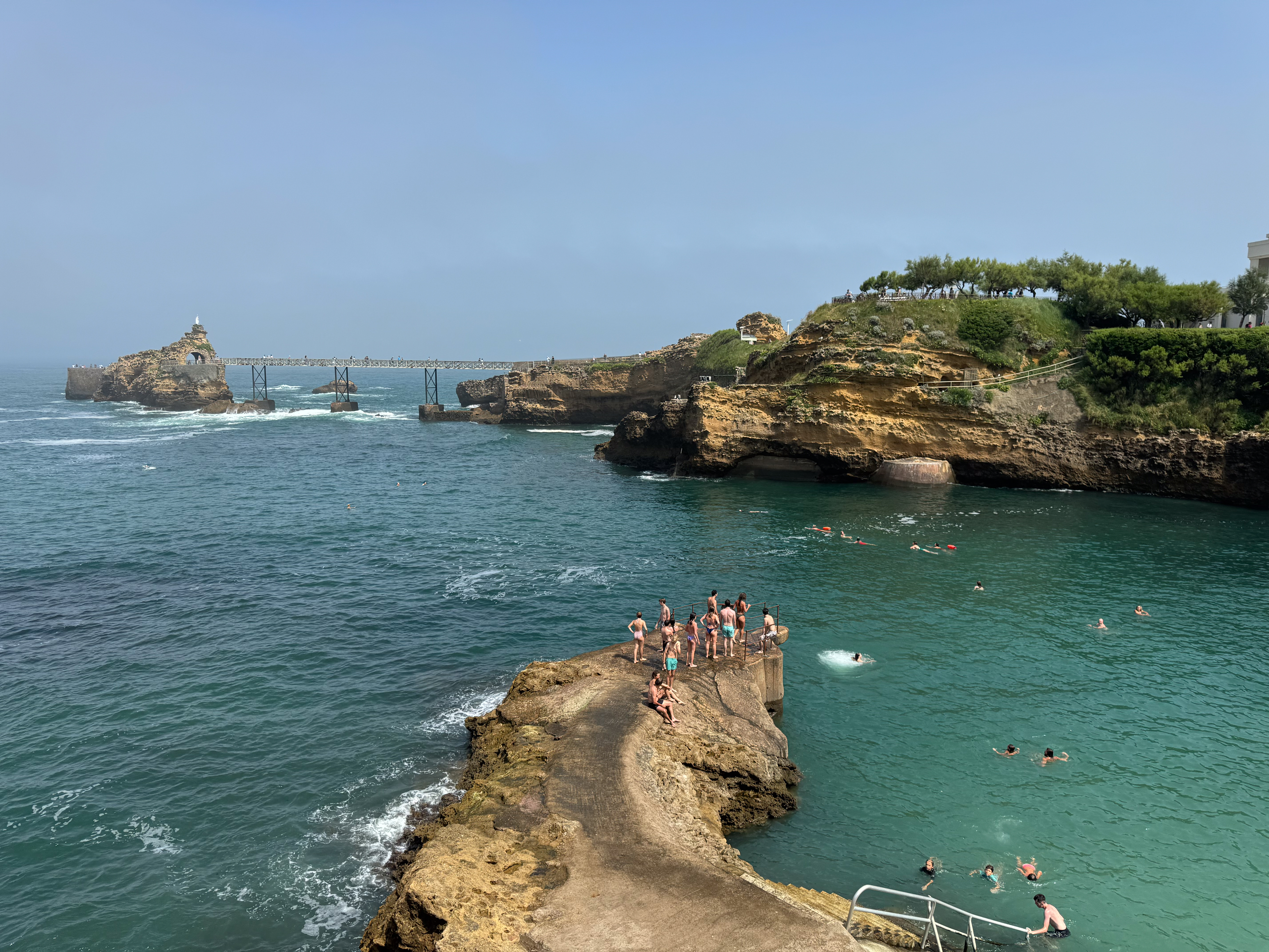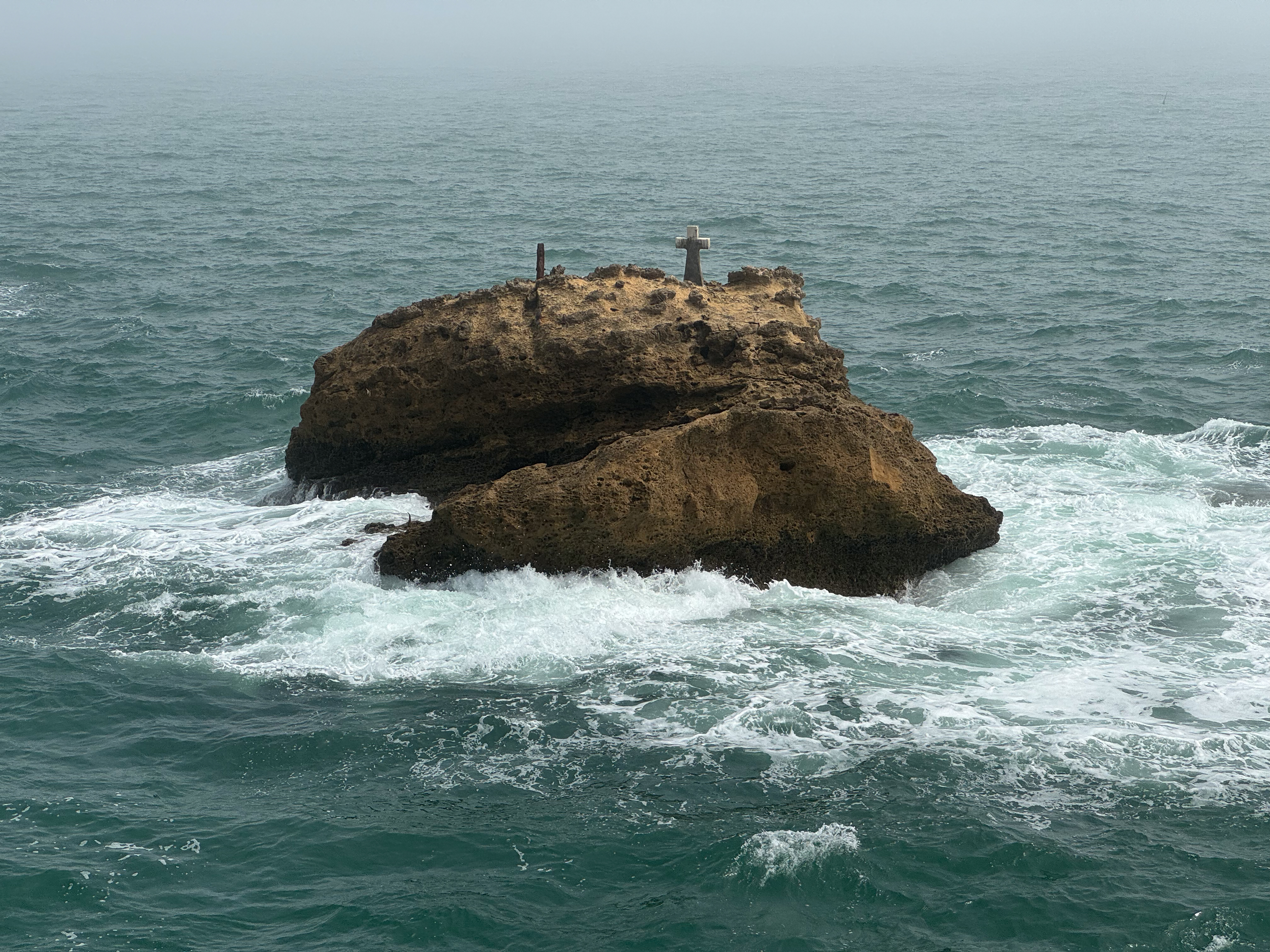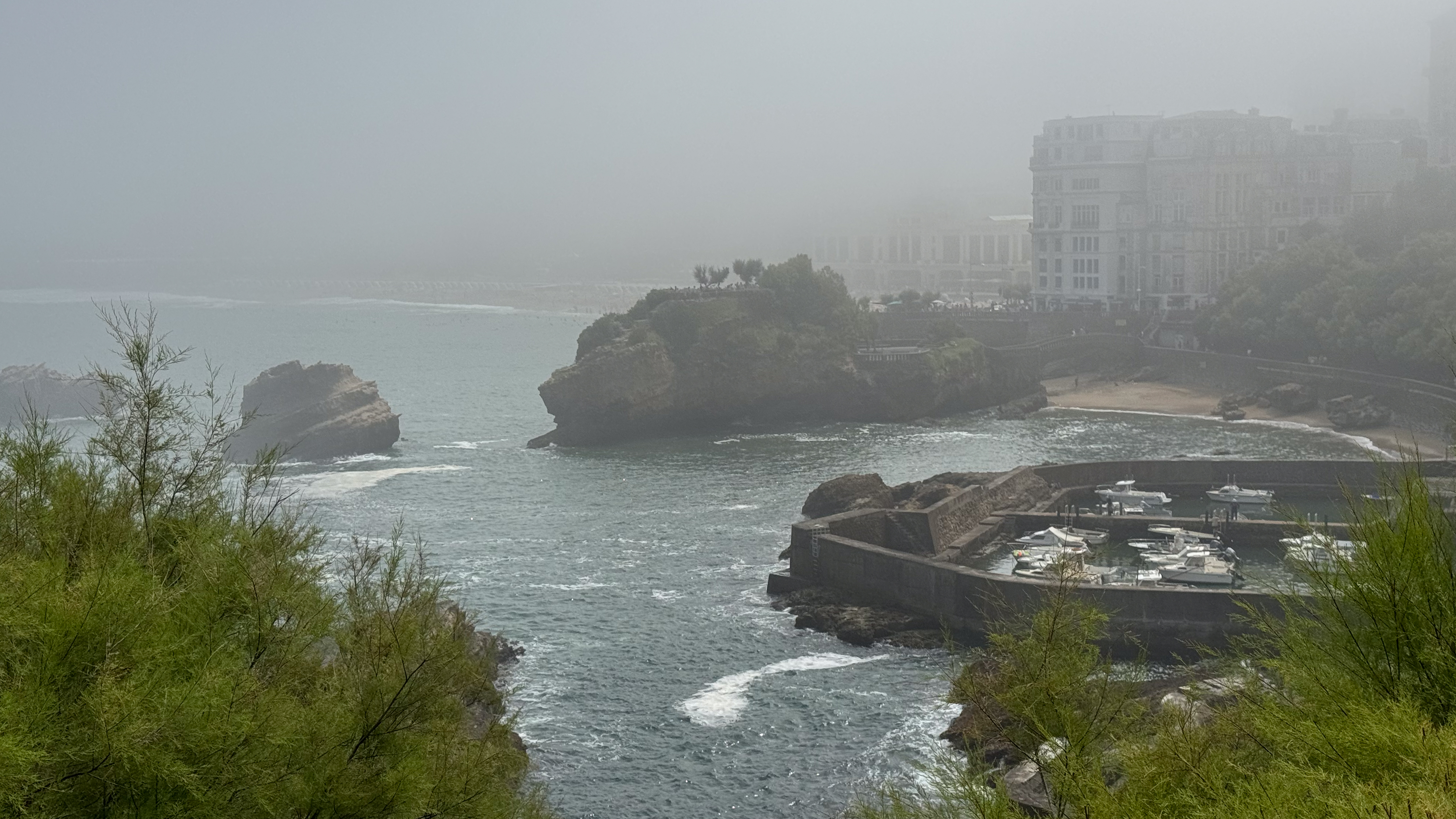 We slenteren verder langs le Port des Pêcheurs, een gezellig haventje met een aantal restaurants, dat er redelijk authentiek uitziet. Terwijl we onze wandeling verder zetten naar Rocher de la Vierge wordt het steeds mistiger. Echt een bizar fenomeen, zo’n zomermist. Het is nog steeds aangenaam warm, maar de warmte is nu veel draaglijker en in niets te vergelijken met de hitte gisteren in Bayonne. We lopen over de voetgangersbrug tot aan het uitkijkplatform aan de achterkant van de rots met het mariabeeld.