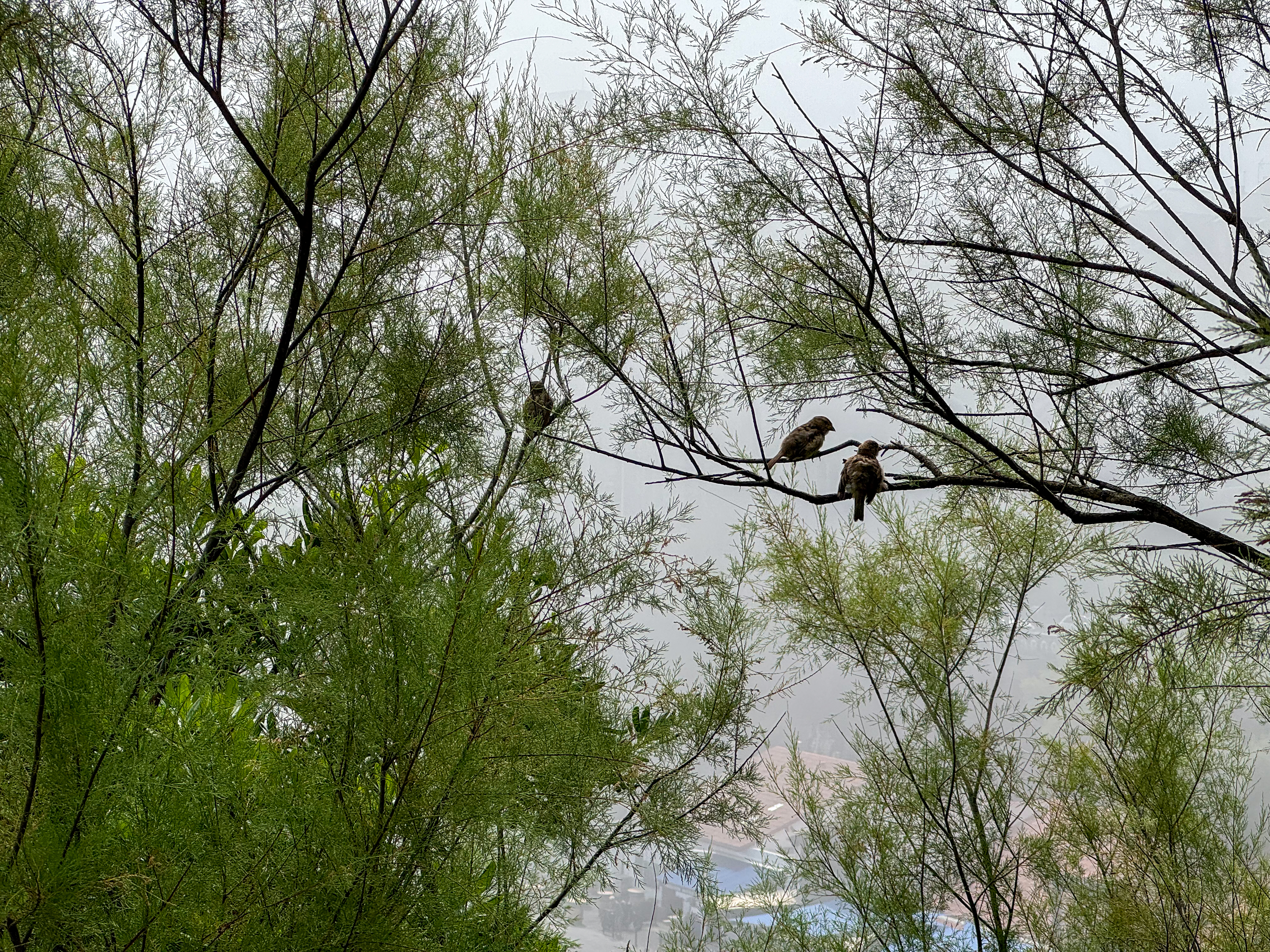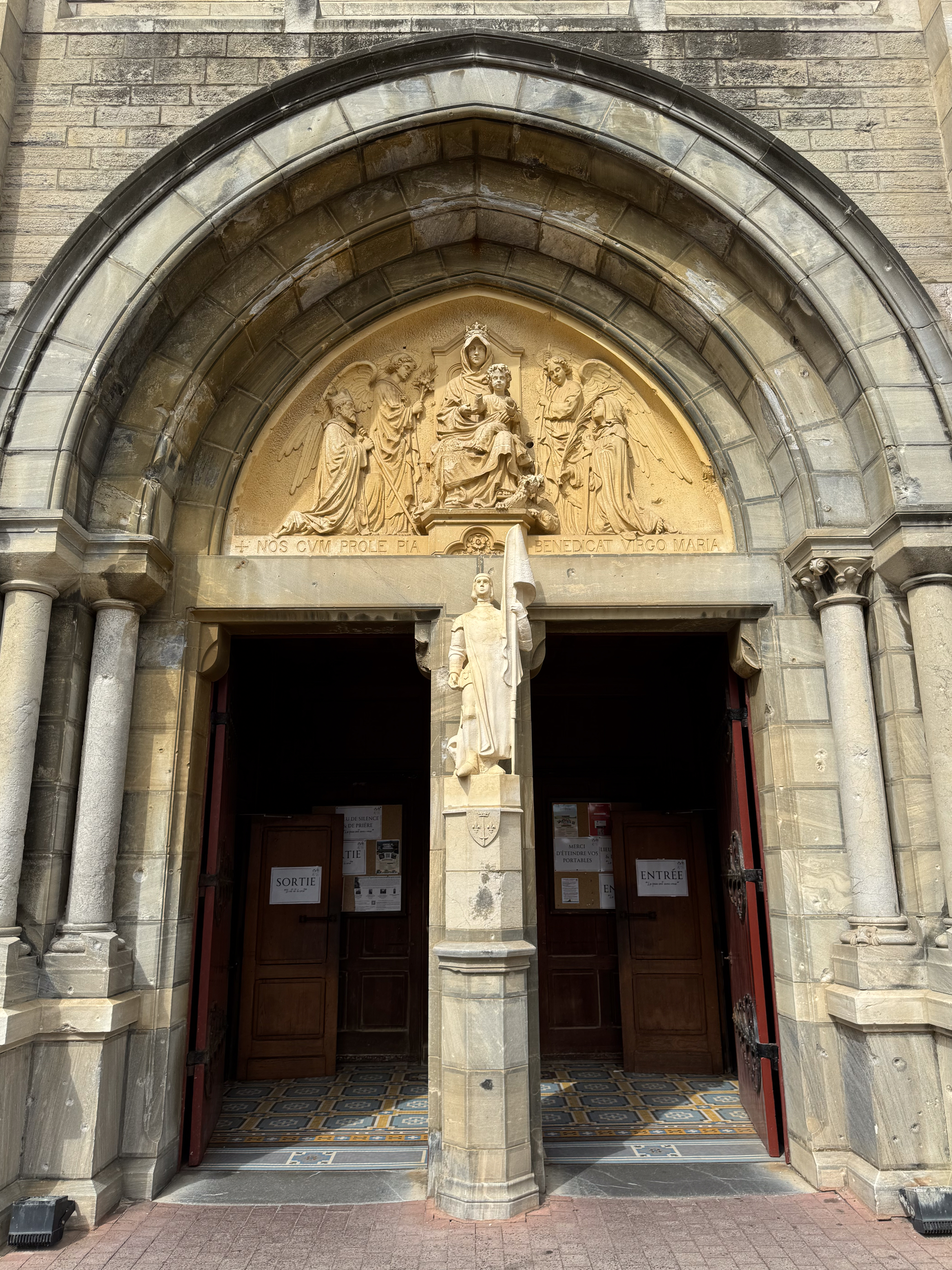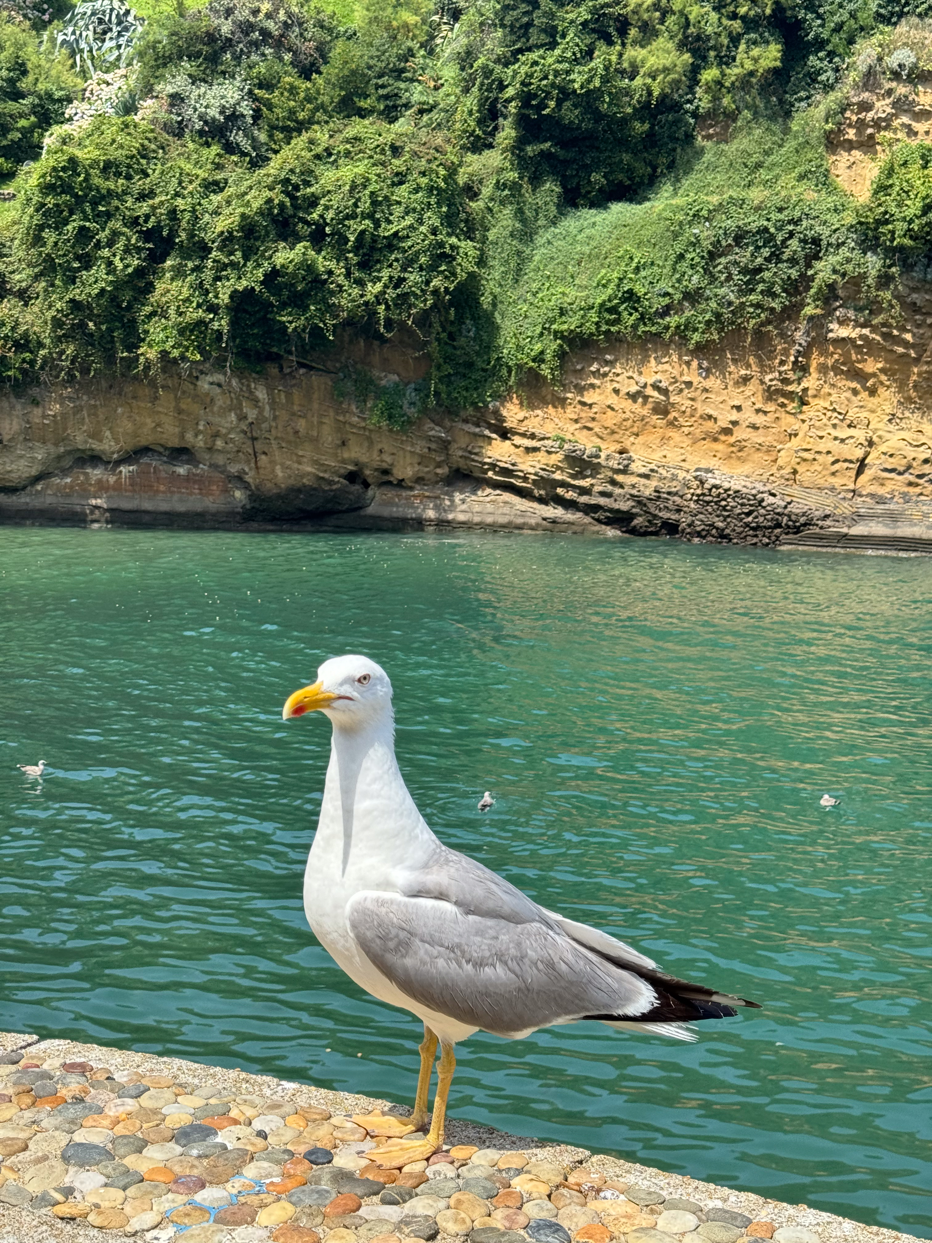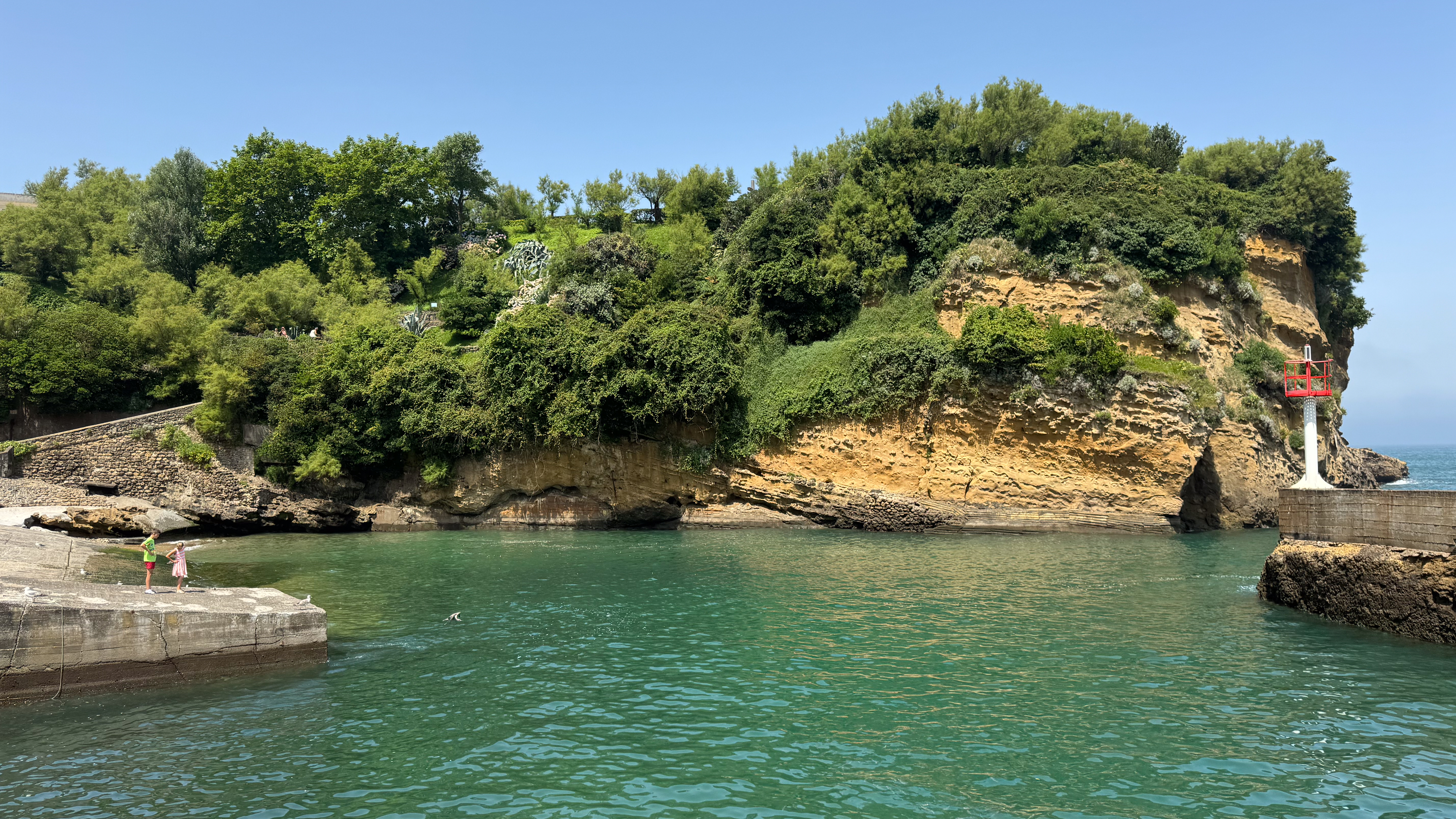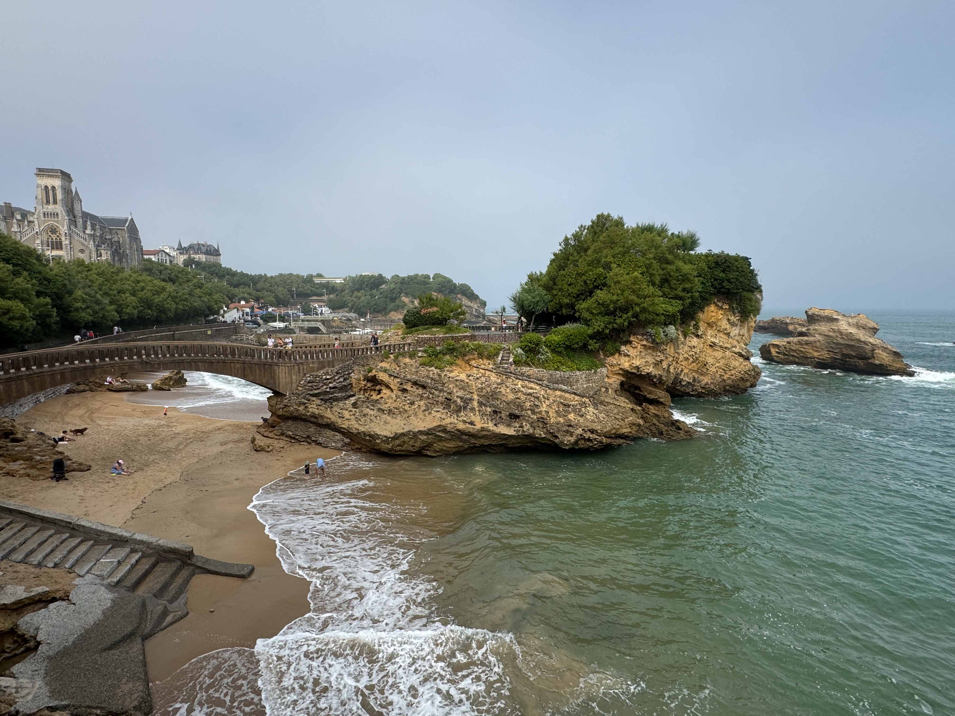 We slenteren verder langs le Port des Pêcheurs, een gezellig haventje met een aantal restaurants, dat er redelijk authentiek uitziet. Terwijl we onze wandeling verder zetten naar Rocher de la Vierge wordt het steeds mistiger. Echt een bizar fenomeen, zo’n zomermist. Het is nog steeds aangenaam warm, maar de warmte is nu veel draaglijker en in niets te vergelijken met de hitte gisteren in Bayonne. We lopen over de voetgangersbrug tot aan het uitkijkplatform aan de achterkant van de rots met het mariabeeld.