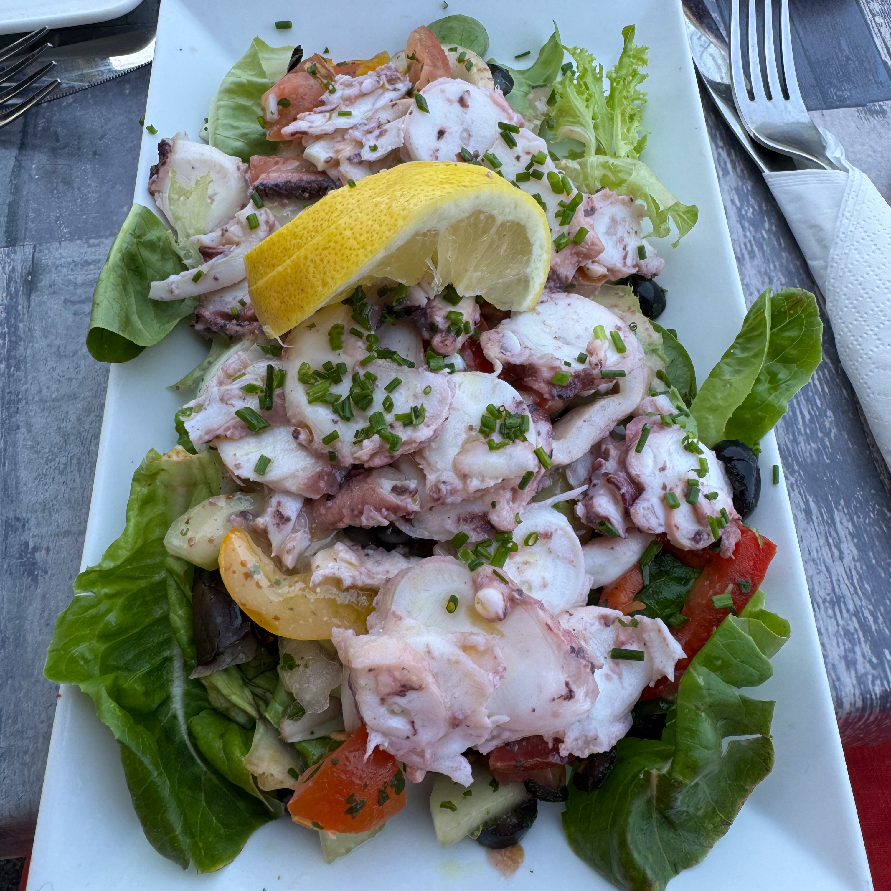 Ik geniet van een lekkere octopussalade, terwijl mijn vriend smult van een stevig stuk tonijn. Het eten is simple, maar bijzonder smaakvol. Zo hebben we het graag. En ja, natuurlijk bestelde we een karaf sangría bij de maaltijd. Altijd lekker.