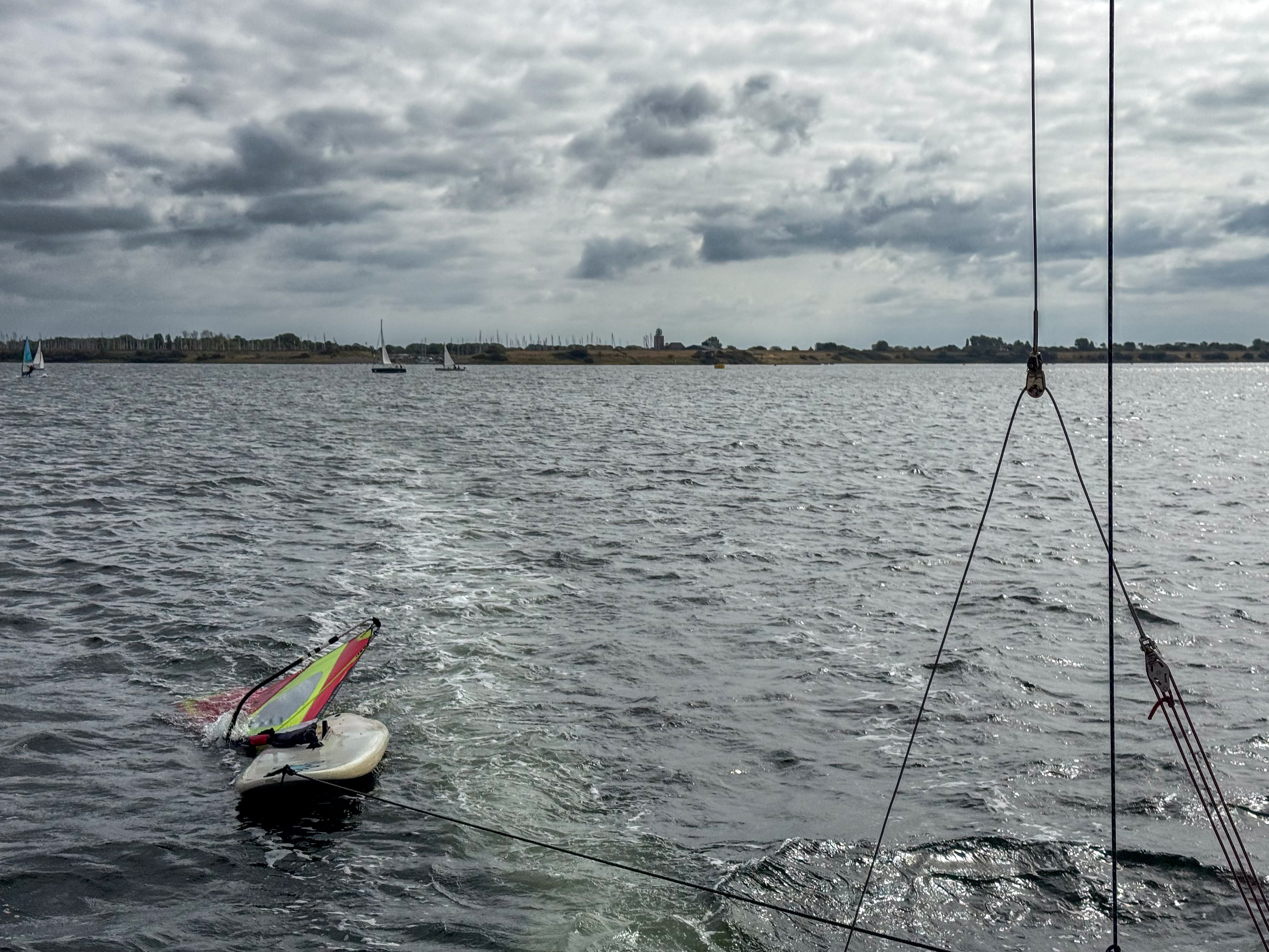 Maar het topmoment van de dag gebeurde toen we al op de motor waren overgeschakeld en we op de terugweg waren naar de haven van Zeil- & Surfcentrum Brouwersdam. Mijn vriend merkte op dat er een surfer in het water lag die teken naar ons deed. We waren hem eerst voorbij gevaren, maar doordat we al op de motor aan het varen waren, was het makkelijk om terug te keren en te informeren wat het probleem was. De man zei dat een meisje al een hele tijd met haar surfplank en zeil in het water lag en er duidelijk niet in slaagde het zeil opnieuw recht te trekken. Doordat ze al redelijk lang in het water lag, kreeg ze het natuurlijk ook steeds kouder. De surfer in kwestie had dat opgemerkt en riep daarom onze hulp in om haar terug te brengen naar de haven.