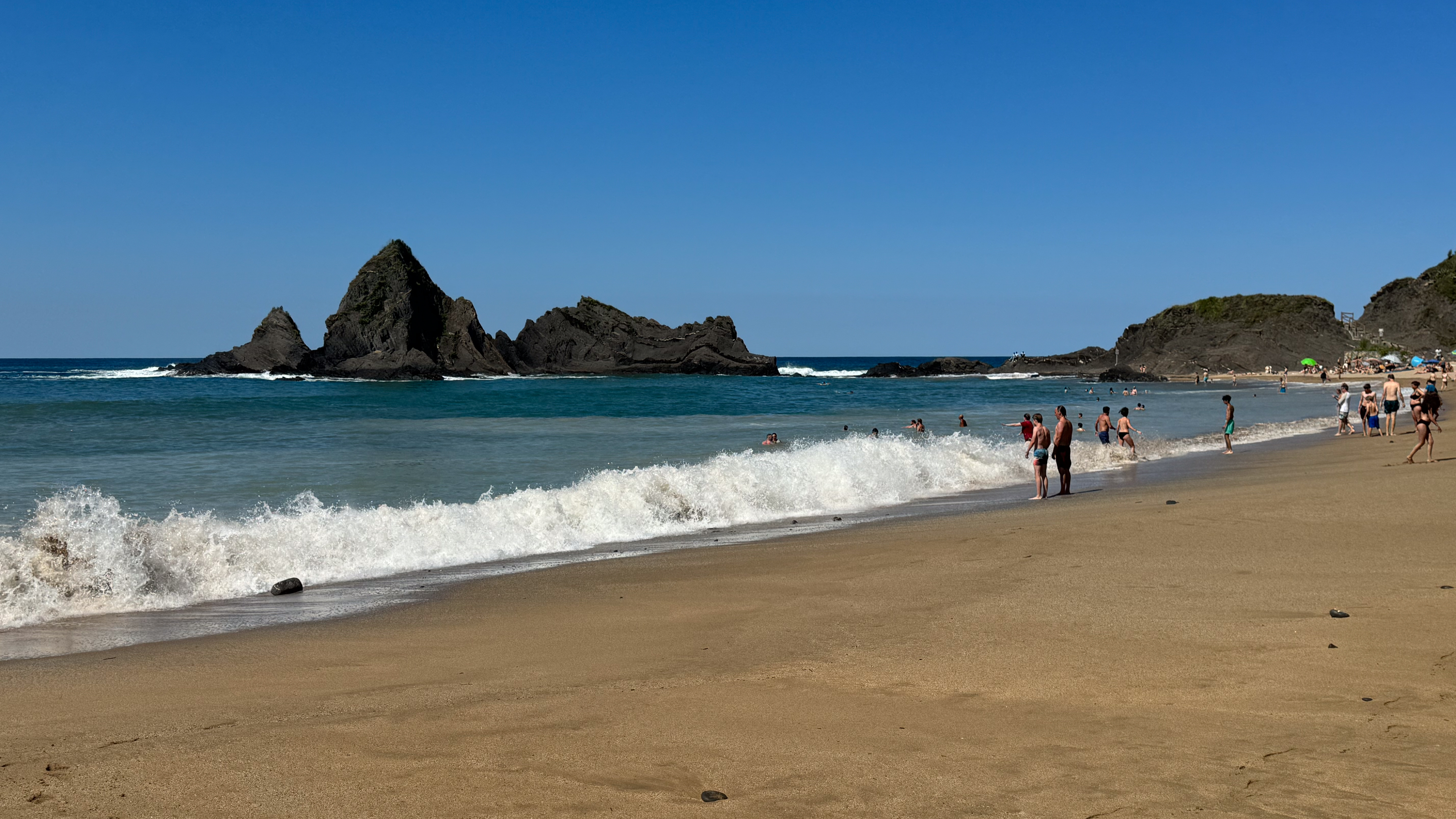 Het zandstrand is zeer aantrekkelijk, maar onzichtbaar onder de waterlijn liggen in de branding verraderlijke kiezels. En ja, mijn vriend slaagt erin zich te verwonden door de combinatie van de kiezels met de extreem sterke branding. Gelukkig is er een gedeelte van het strand waar er geen kiezels liggen, maar over het algemeen vormt zwemmen in de Atlantische oceaan hier toch wel een uitdaging. We begrijpen alleszins heel goed waarom het maar in een klein gedeelte van de baai toegelaten is om te zwemmen. Deze stromingen zijn echt heel verraderlijk.