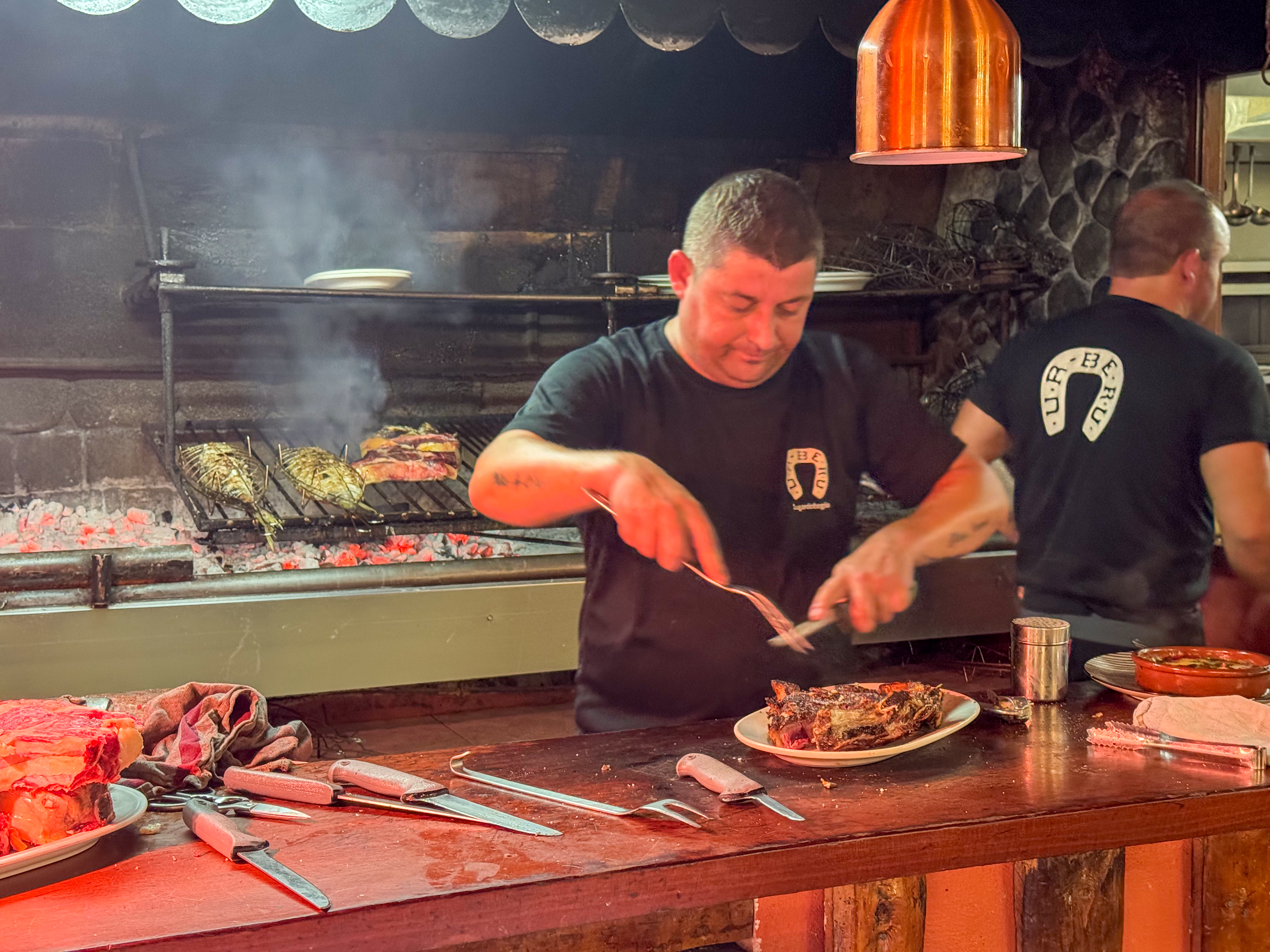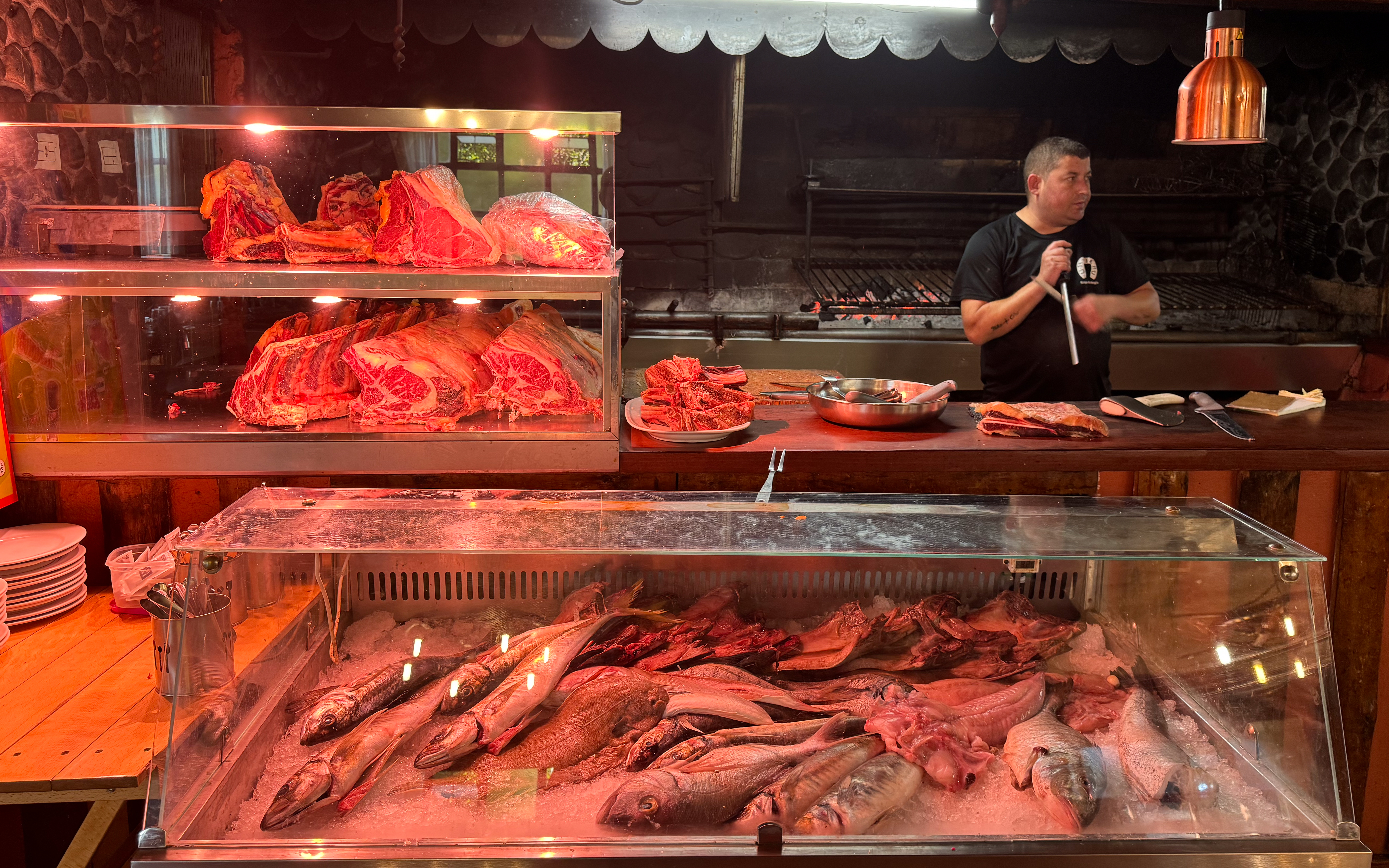 Uiteraard is de fles cider al volledig soldaat gemaakt voordat we plaats mogen nemen aan een houten tafel met zitbanken, die ons zicht biedt op de houtskoolgrill waarop de koks het vlees en de vis klaarmaken. In een koeltoog liggen gigantische lappen vlees waaruit je kan kiezen. Verser kan het niet.
