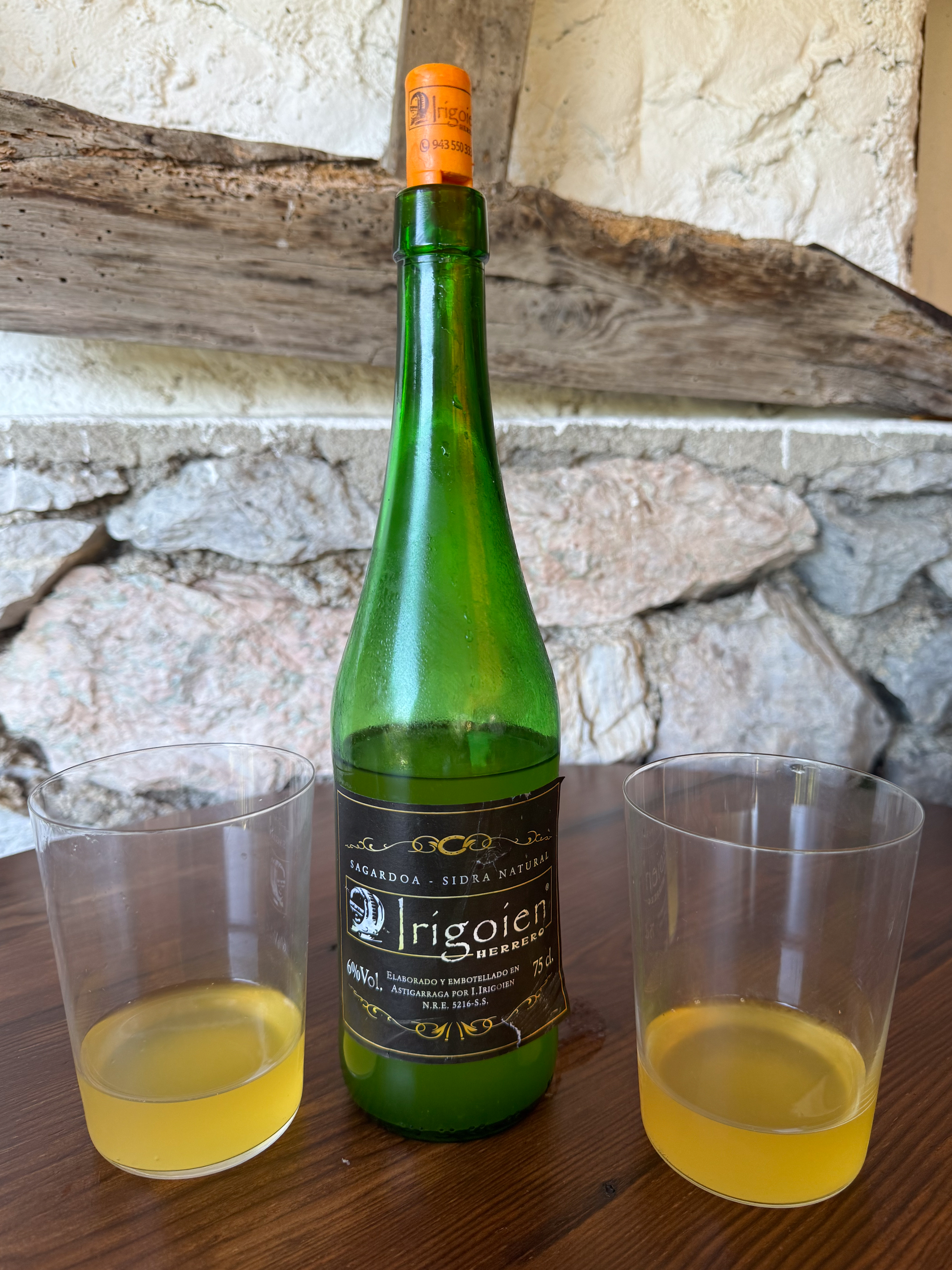 Op de terugweg naar ons hotel stoppen we voor het avondmaal bij Urberu Sagardotegia, cidrería in Itziar. Ik koos deze plek uit omdat je hier cider kan drinken rechtstreeks getapt van het vat. Wij komen rond 18.30u aan, wat uiteraard veel te vroeg is om in Baskenland al te kunnen eten. Gelukkig mogen we van de vriendelijke bediening plaats nemen aan een tafel op het (lege) terras om te wachten tot het restaurant officieel open gaat om 20u. Erg vinden we het niet dat we anderhalf uur moeten wachten, dat geeft ons de gelegenheid om een flesje cider te drinken!