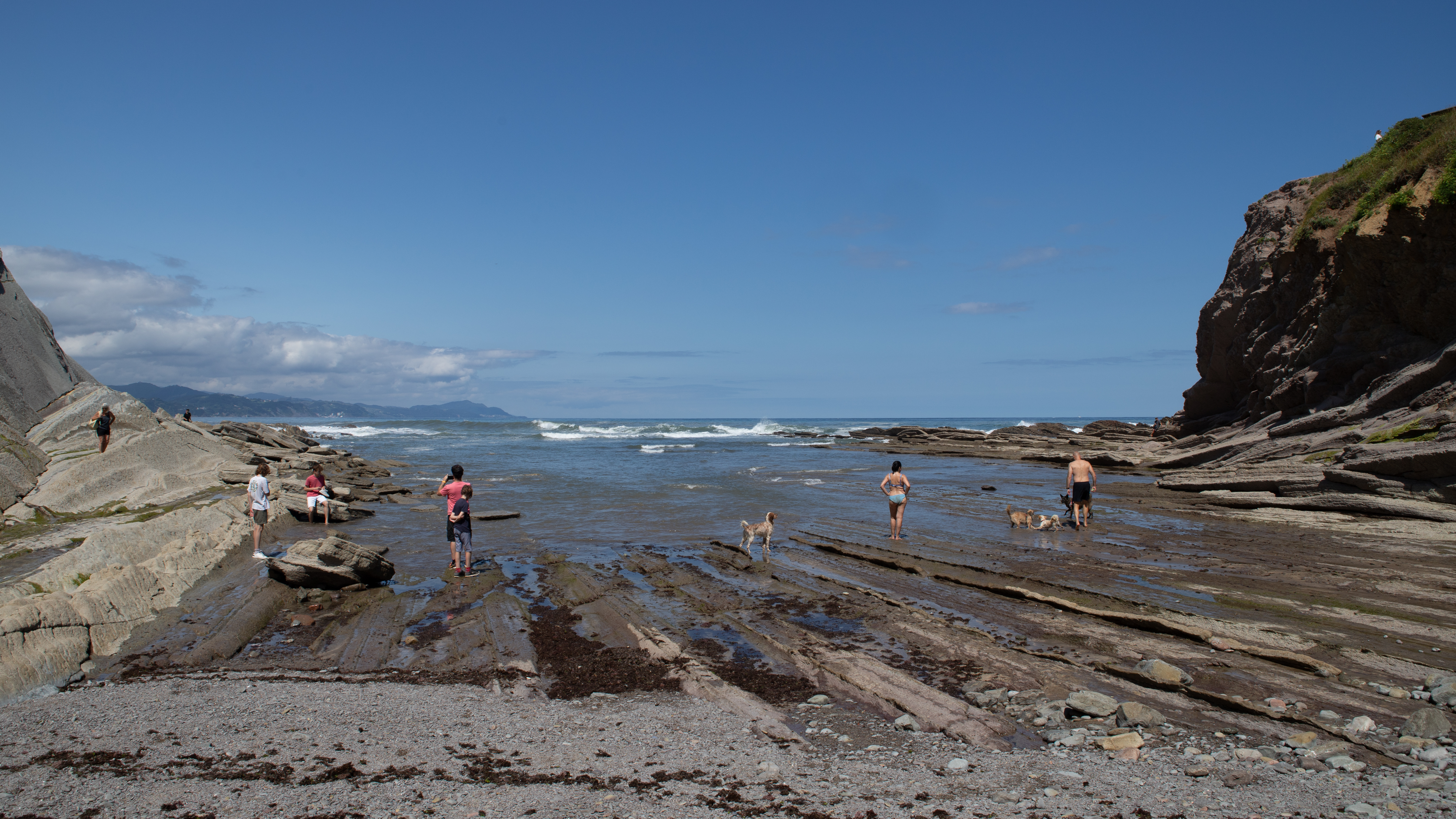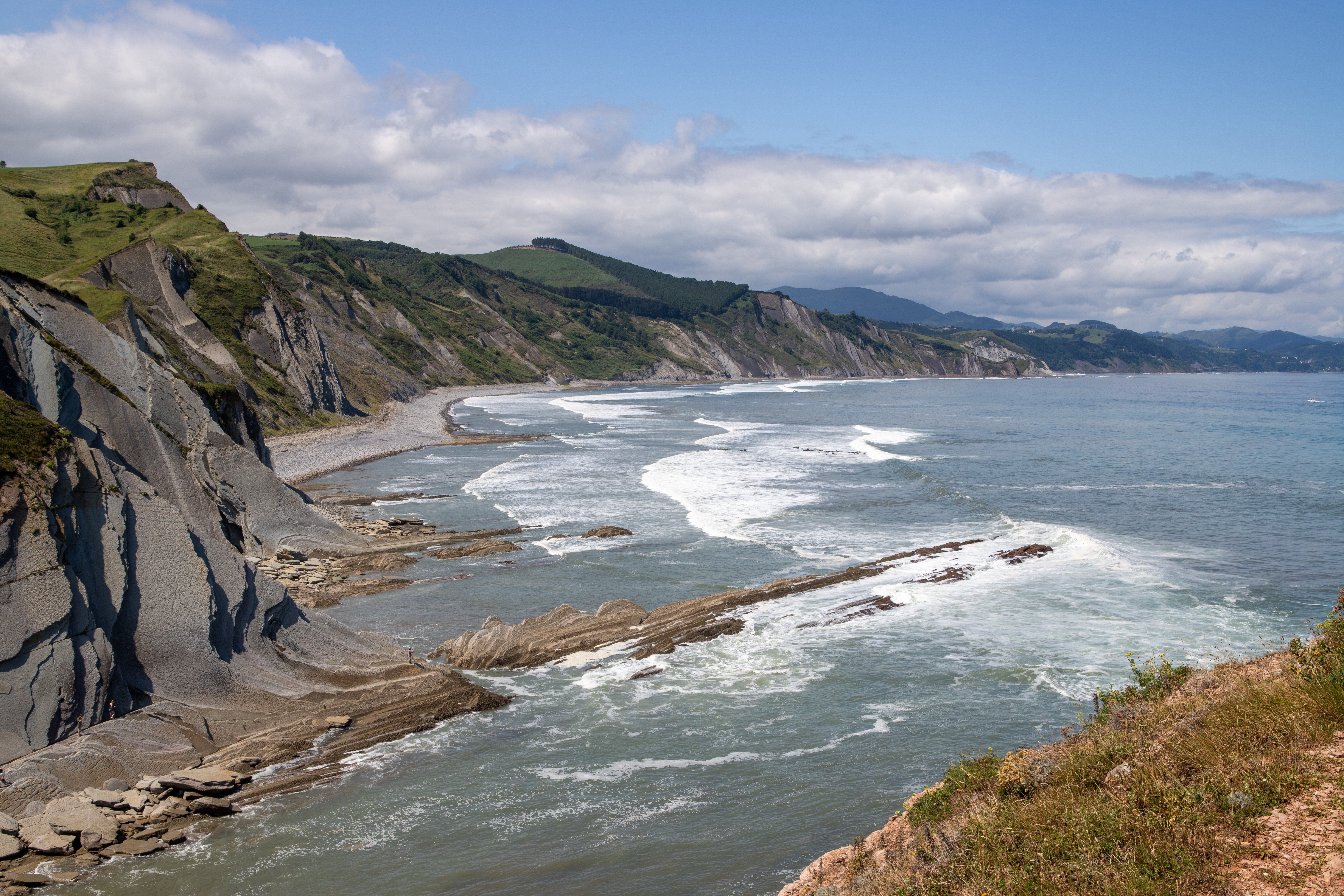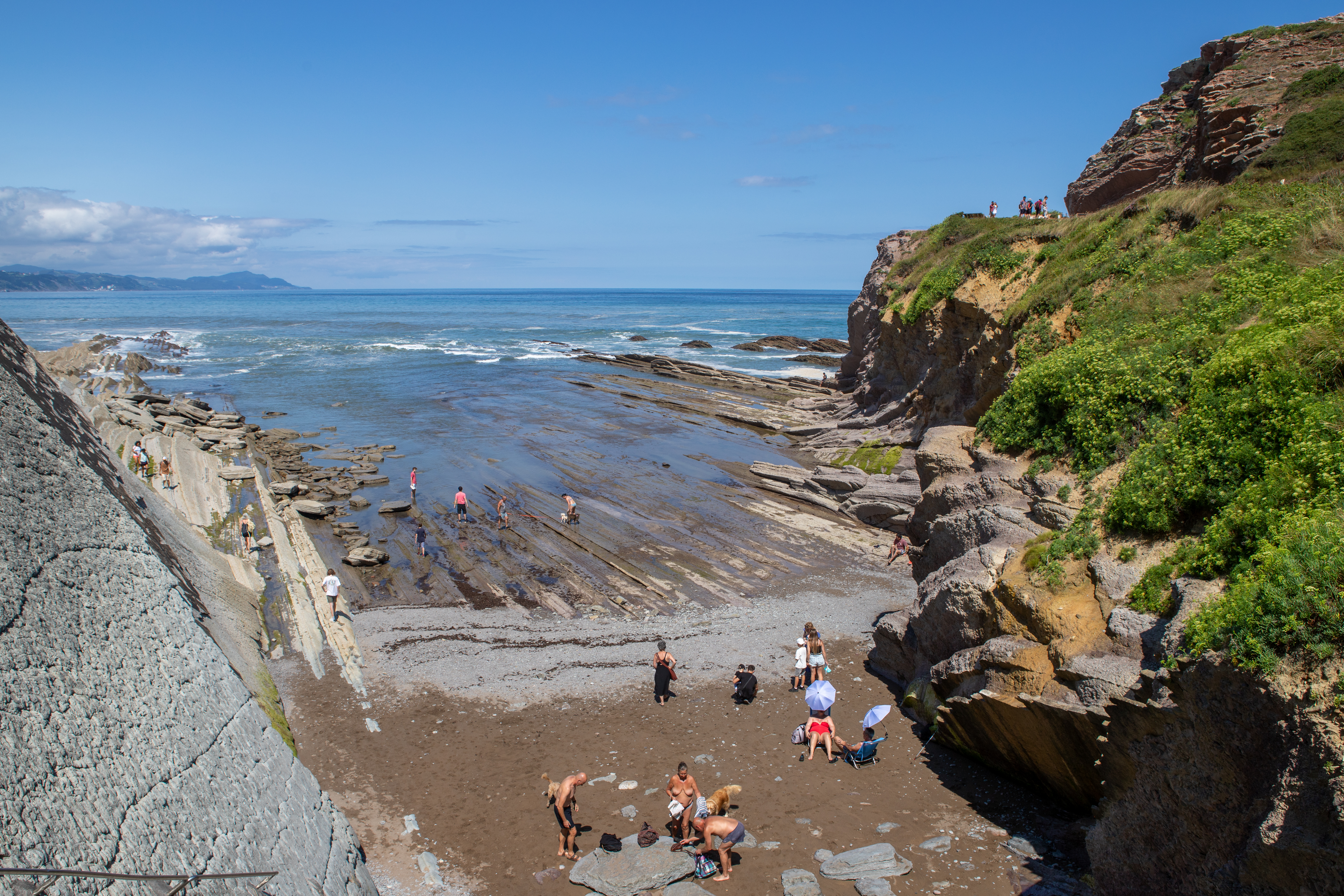 Daarna maken we een wandeling die ons brengt naar een rotsstrand dat duidelijk alleen gebruikt wordt door de locals. We maken eerst een paar foto’s van de fantastisch mooie Baskische kustlijn en dalen dan langs een redelijk gevaarlijke trap af naar het strand. Prachtig! De rotsformatie op het strand wordt flysch genoemd, wat een opeenvolging van sedimentair gesteente is, die gevormd door de afwisselende afzetting van dunne lagen slib en zandsteen, en tref je aan bij kusten die een snelle verandering in de zeespiegel hebben gehad. De flysch in Zumaia werden over een periode van 100 miljoen jaar gevormd. Bij de klim terug naar boven merken we dat de temperaturen aan het stijgen zijn. De onweerszone van gisteren is duidelijk gepasseerd en de zon heeft nu vrij spel. We keren langs een andere weg terug dan we gekomen zijn en worden getrakteerd op een prachtig uitzicht op een groot zandstrand.