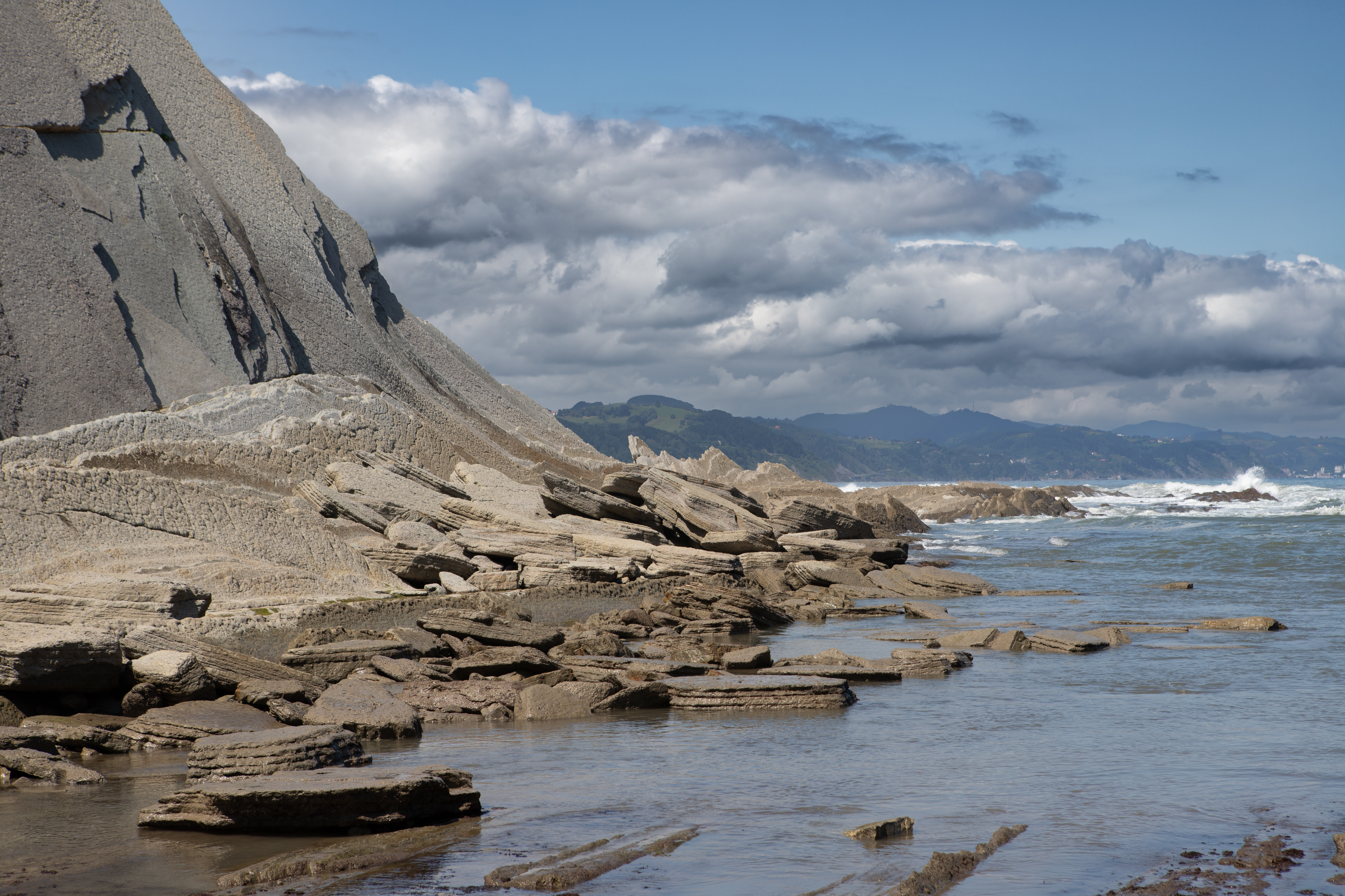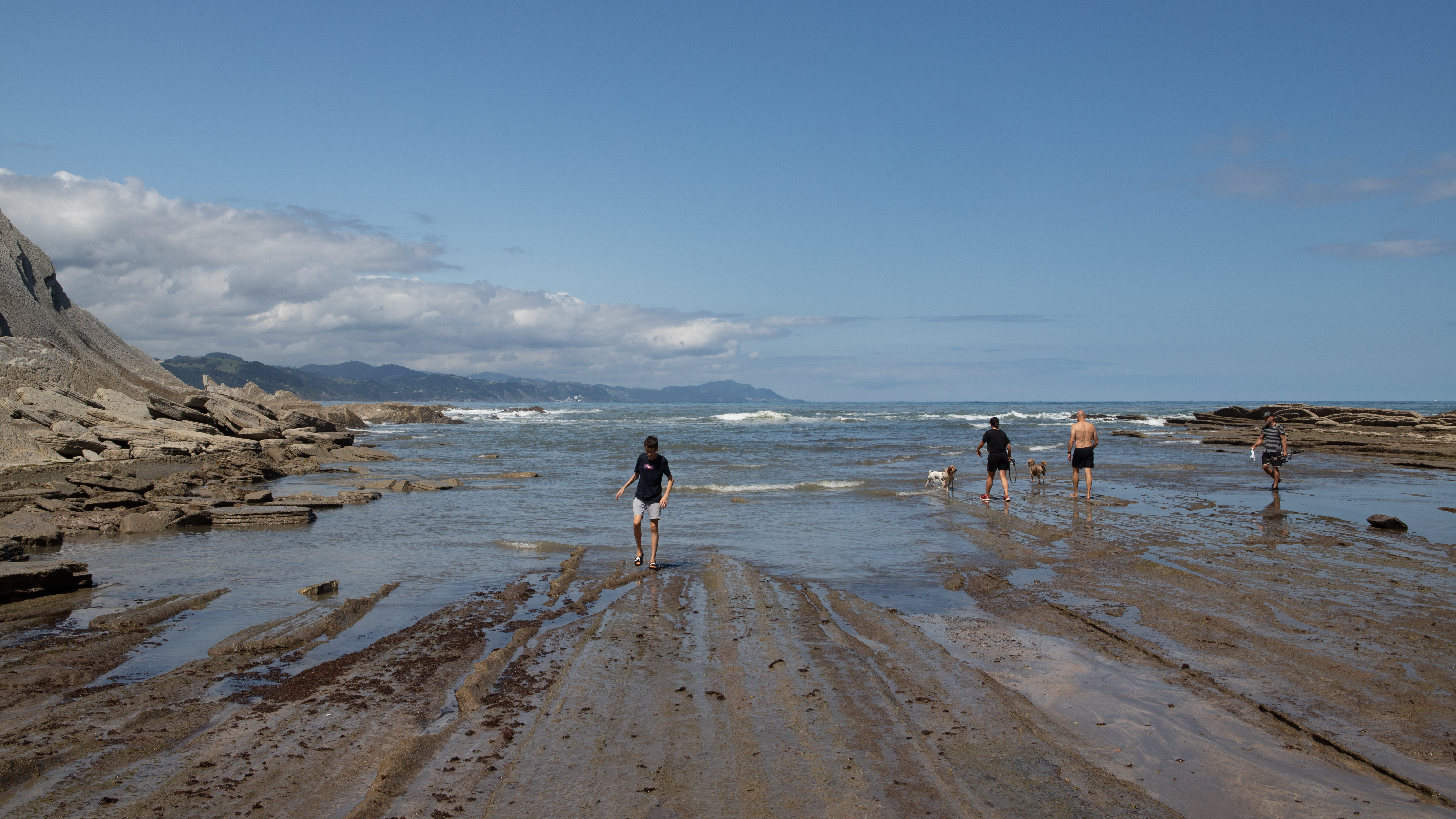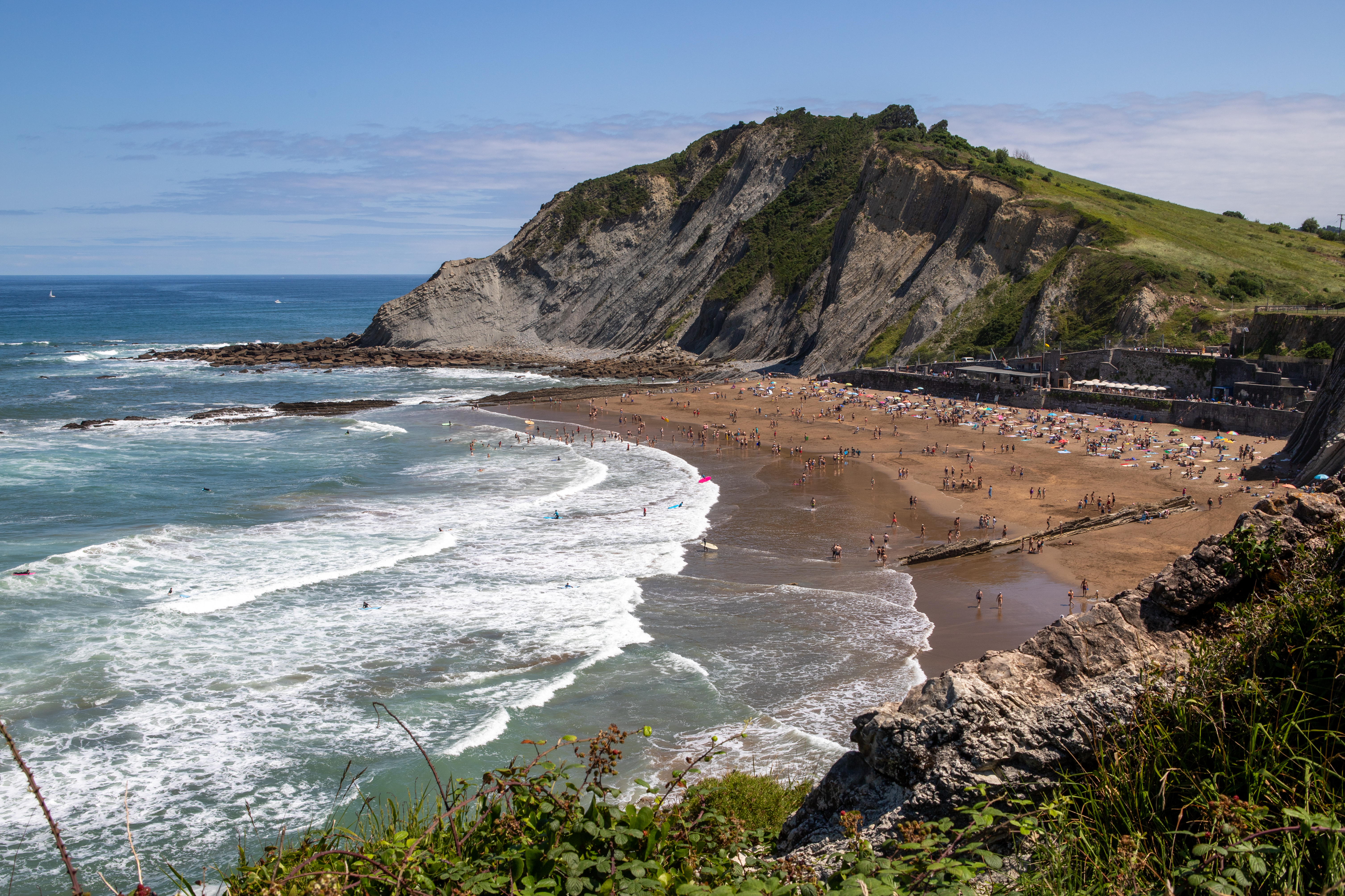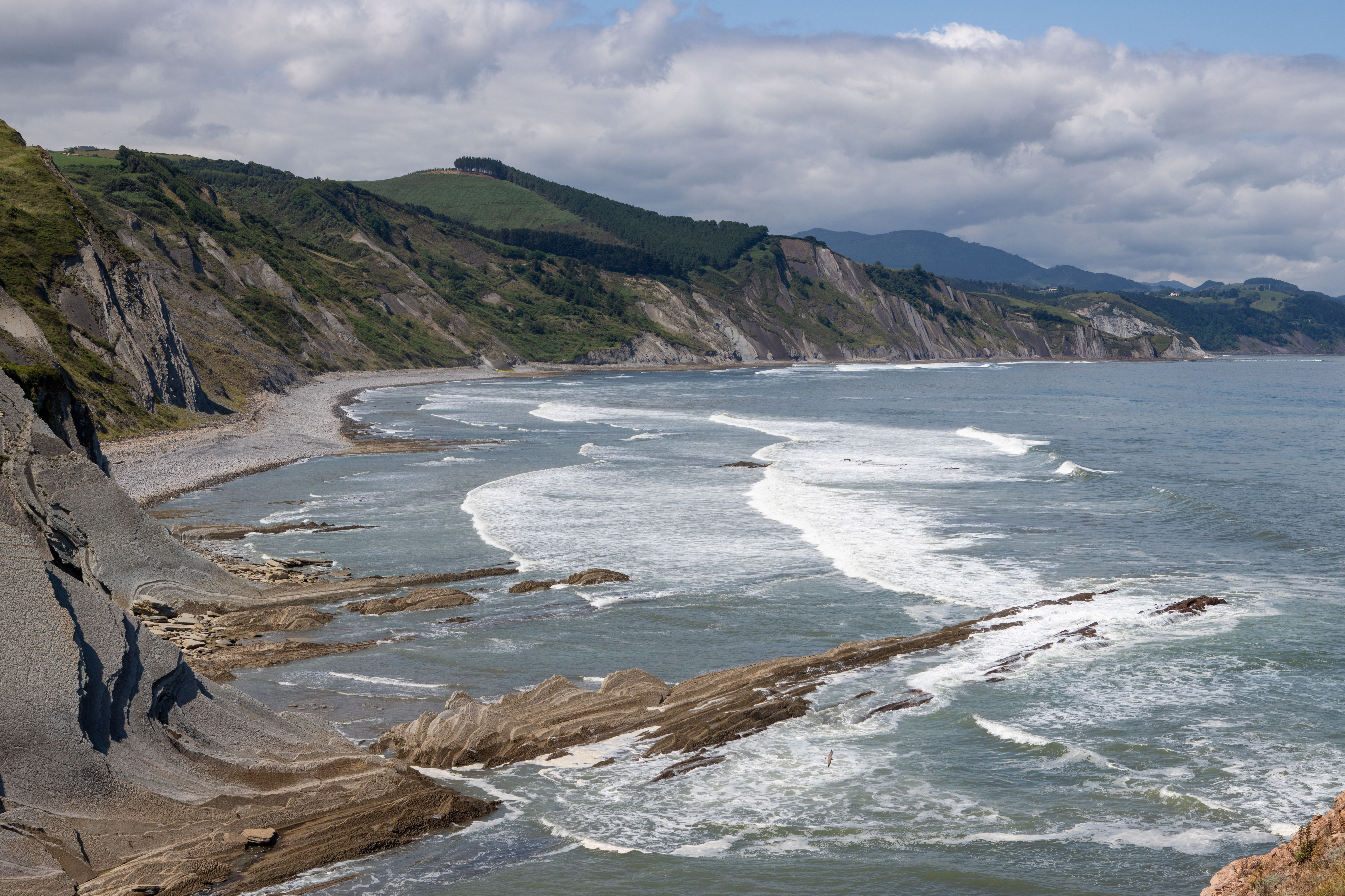 Daarna maken we een wandeling die ons brengt naar een rotsstrand dat duidelijk alleen gebruikt wordt door de locals. We maken eerst een paar foto’s van de fantastisch mooie Baskische kustlijn en dalen dan langs een redelijk gevaarlijke trap af naar het strand. Prachtig! De rotsformatie op het strand wordt flysch genoemd, wat een opeenvolging van sedimentair gesteente is, die gevormd door de afwisselende afzetting van dunne lagen slib en zandsteen, en tref je aan bij kusten die een snelle verandering in de zeespiegel hebben gehad. De flysch in Zumaia werden over een periode van 100 miljoen jaar gevormd. Bij de klim terug naar boven merken we dat de temperaturen aan het stijgen zijn. De onweerszone van gisteren is duidelijk gepasseerd en de zon heeft nu vrij spel. We keren langs een andere weg terug dan we gekomen zijn en worden getrakteerd op een prachtig uitzicht op een groot zandstrand.