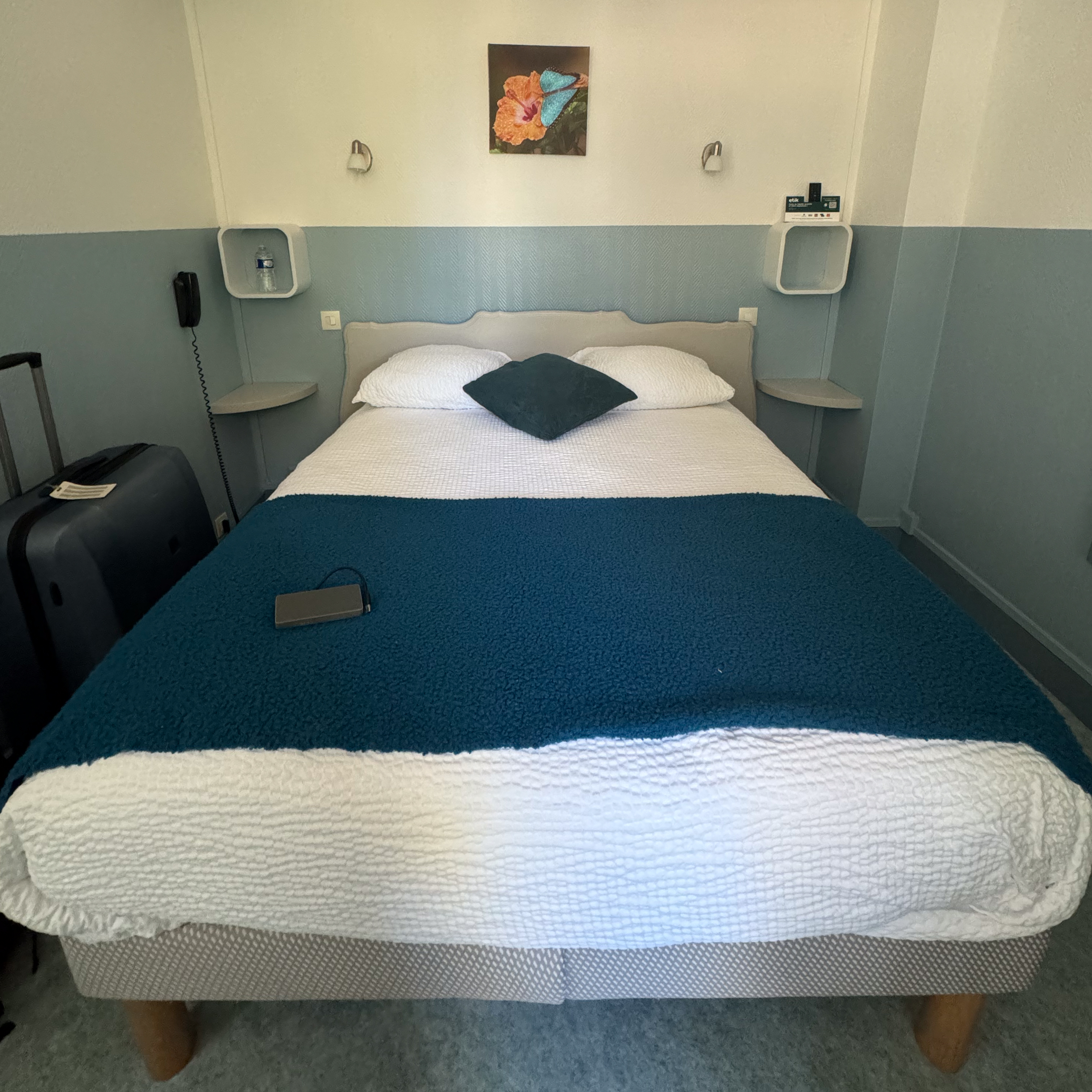 De omgeving van Chauvigny is bijzonder landelijk met velden vol met zonnebloemen. Erg mooi. Rond 19u komen we aan in Chauvigny zelf. We krijgen een kleine kamer in een bijgebouw van het hotel toegewezen. Grote luxe is het niet, maar er is een ventilator om de temperatuur onder controle te houden en we kunnen de kamer goed afsluiten tegen de warmte dankzij de houten luiken.