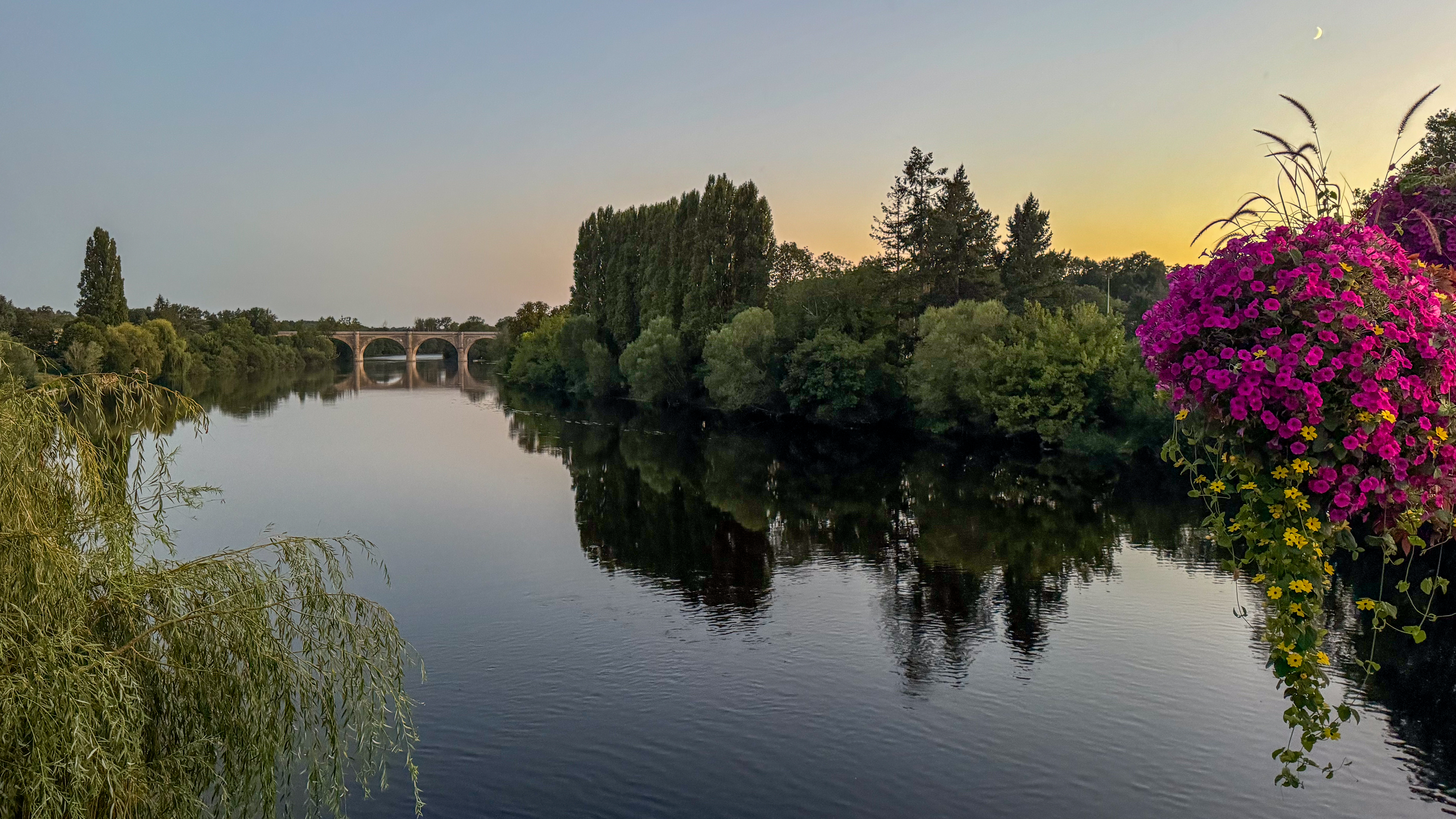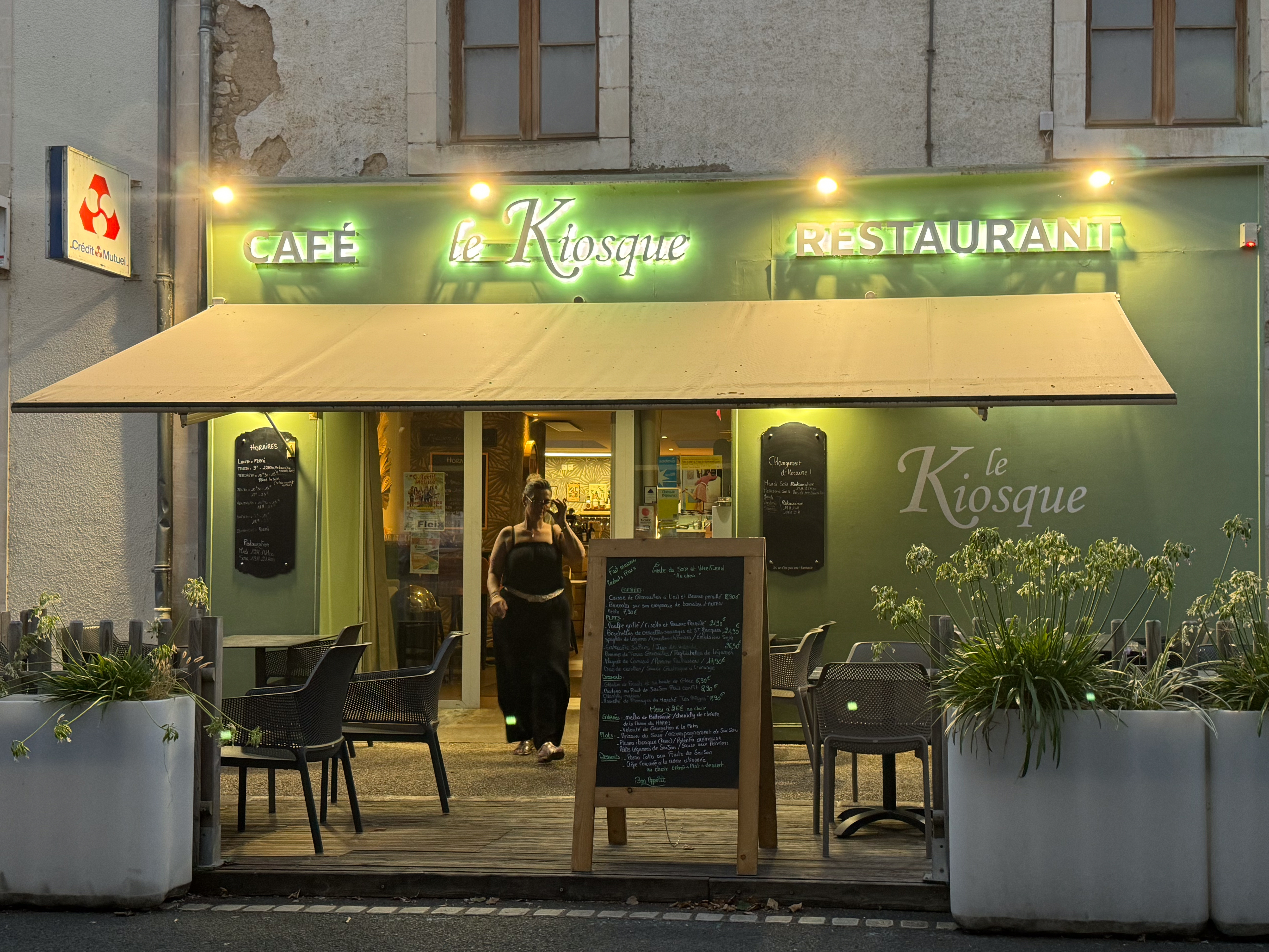 Voor het avondmaal terug we naar Le Kiosque à Chauvigny dat een mooi terras heeft op een groot plein. We zijn er de eerste gasten, maar krijgen al snel gezelschap van andere klanten. We starten de maaltijd uiteraard met een glaasje bubbels. Als voorgerecht eet ik een koude cougettensoep (die ik helaas niet bijzonder lekker vind). voor het hoofdgerecht kiezen we allebei de vis van de dag: een mooi stukje zalm dat gelukkig wel lekker is. Ik heb nog net een gaatje over voor een gevulde pannenkoek als dessert. Mijn vriend sluit de maaltijd af met een glaasje cognac.