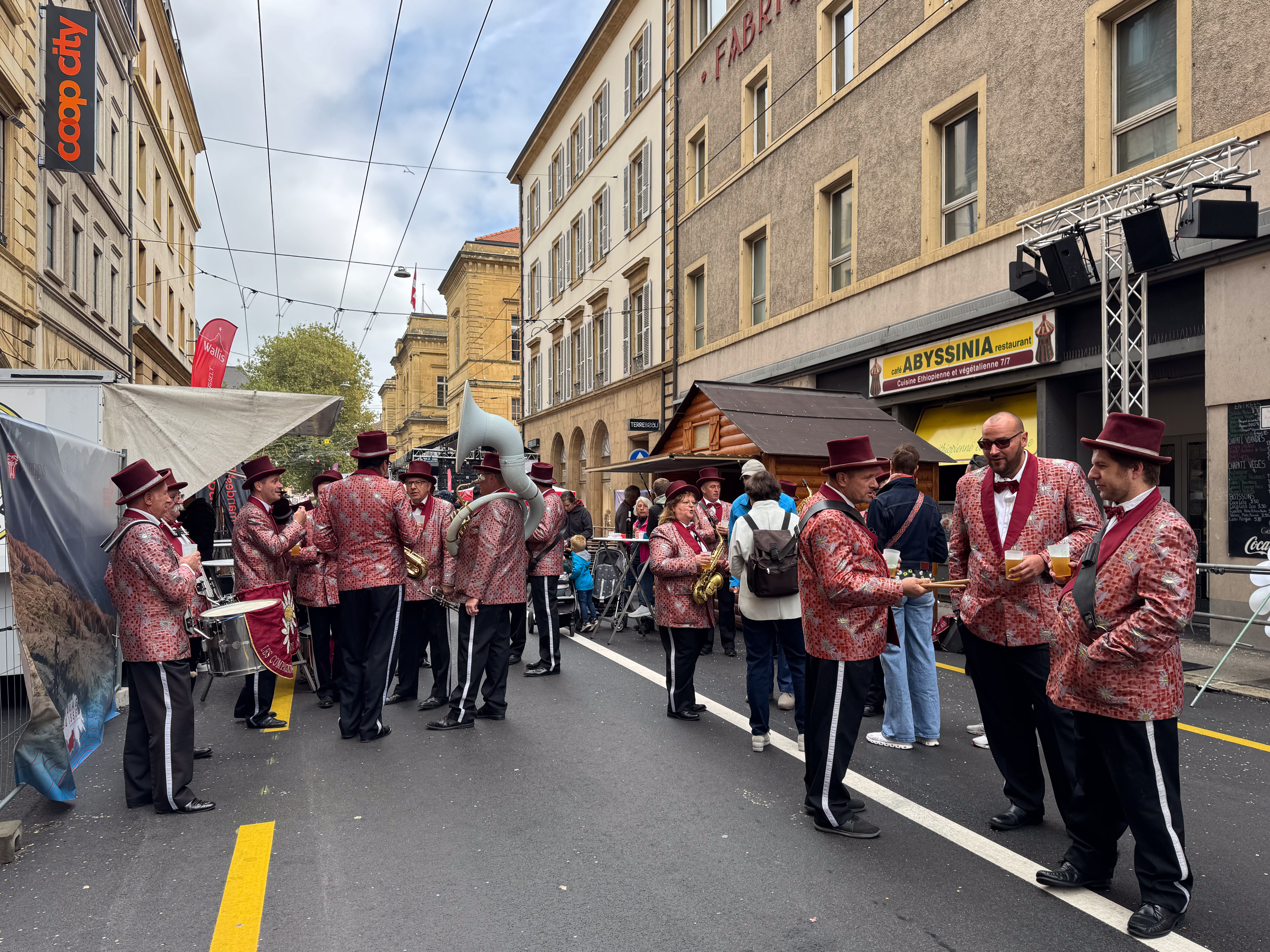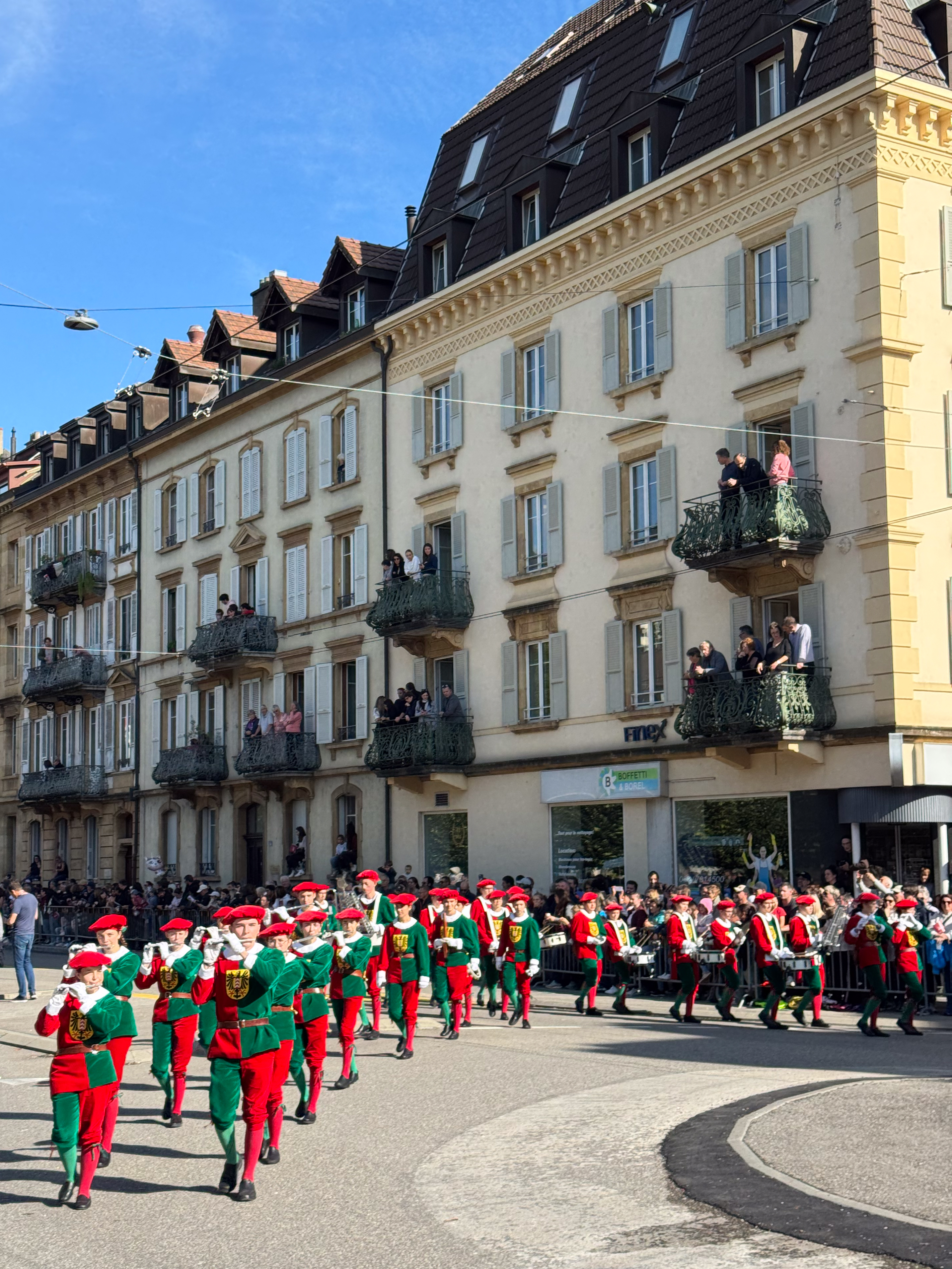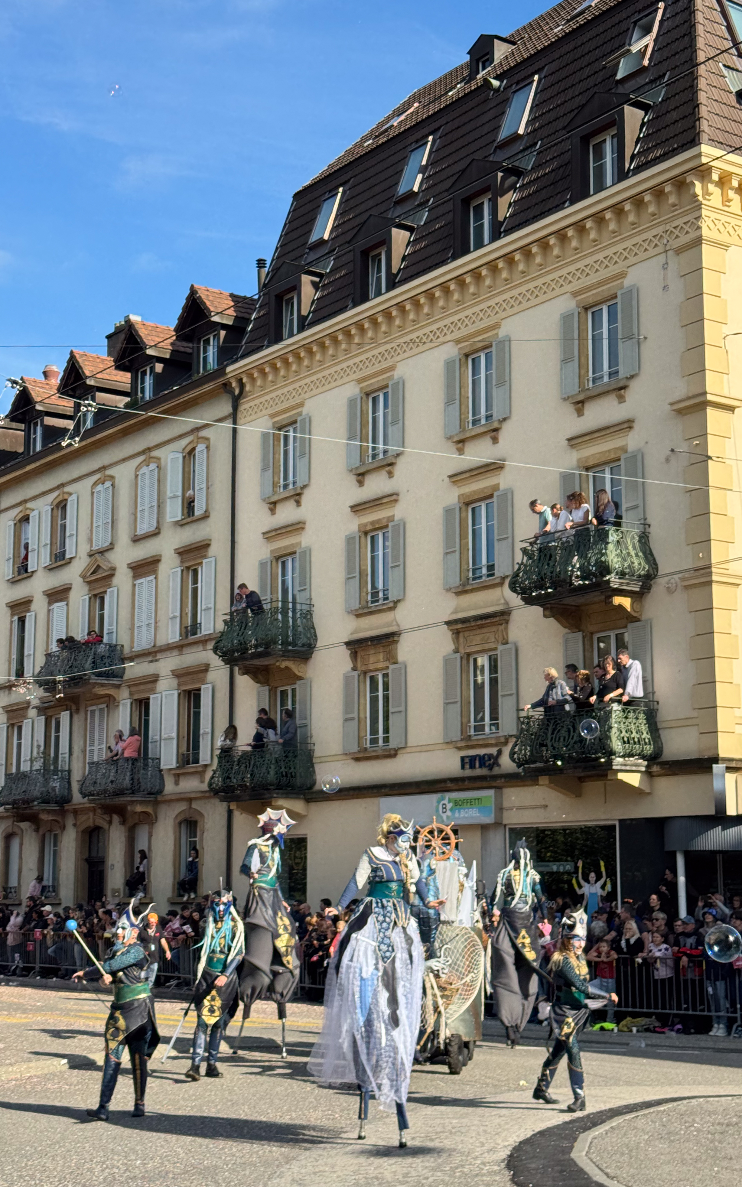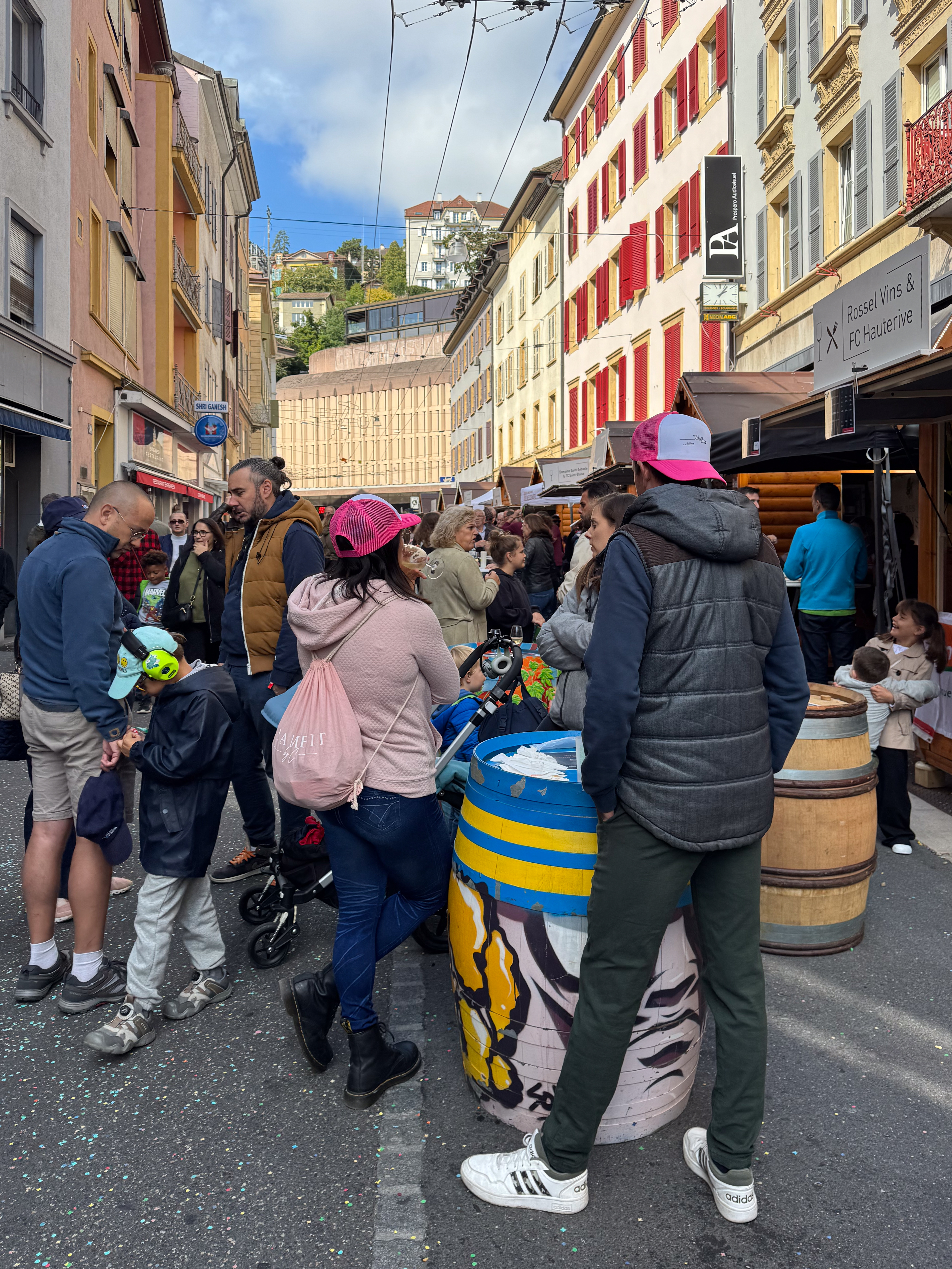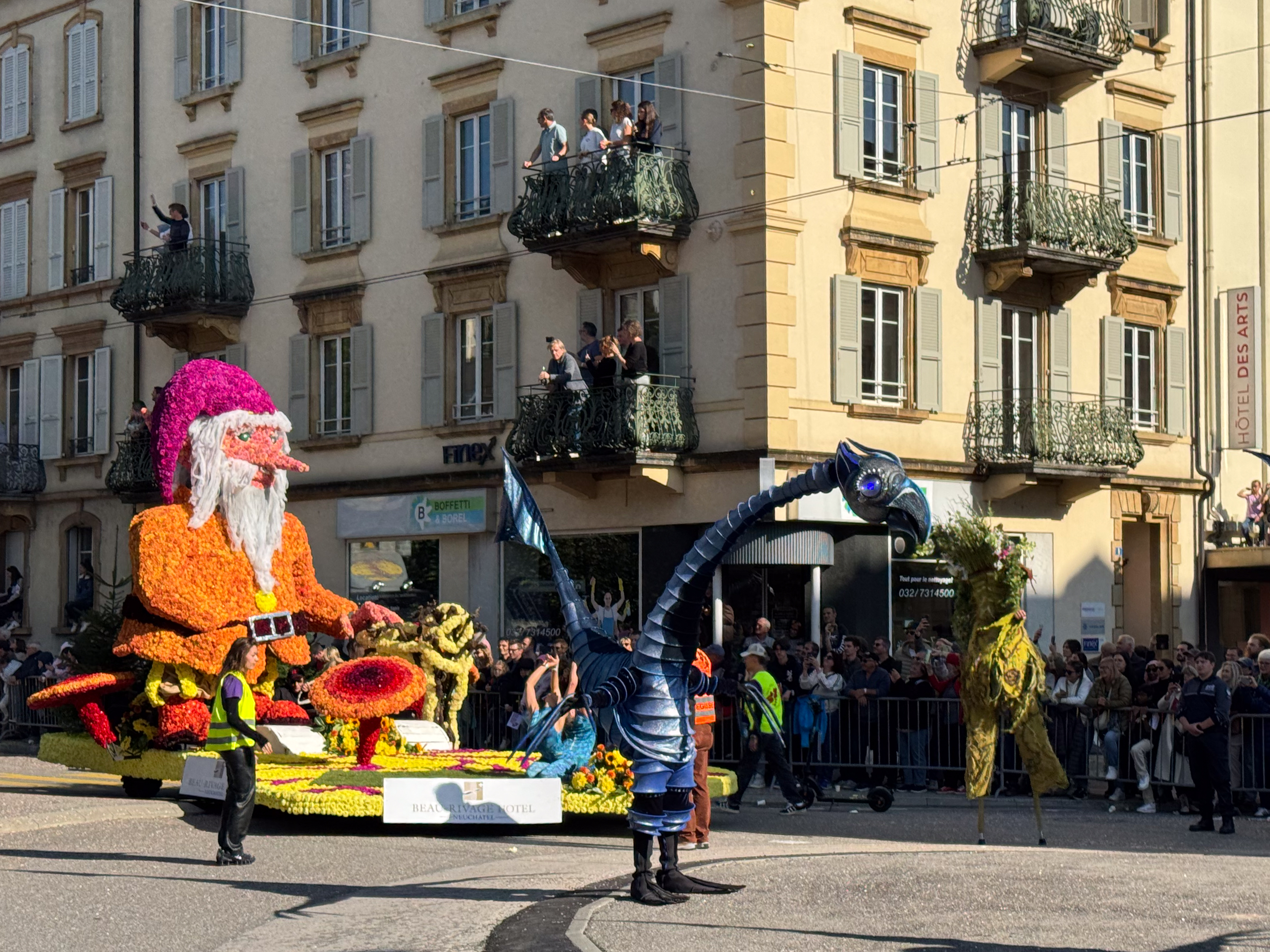 Rond een uur of elf komt de trein van de oud-collega aan in het station van Neuchâtel en trekken we samen naar het stadsgedeelte waar de feesten plaats vinden. Het is nog rustig in de stad, waar alles in gereedheid wordt gebracht voor het Grand Corso Fleuri. Fun fact: ik heb nog nooit in mijn leven een bloemencorso meegemaakt, maar raakte gefascineerd door het gegeven door het lezen van het boekje ‘Tiny en het bloemenfeest‘ (uit 1973, begot!), dat nog van mijn moeder moet zijn geweest. We kopen ons een polsbandje dat ons later toegang moet verschaffen tot het parcours van het bloemencorso en ik kijk ernaar uit om straks voor de eerste keer met bloemen versierde wagens aan mij voorbij te zien trekken.