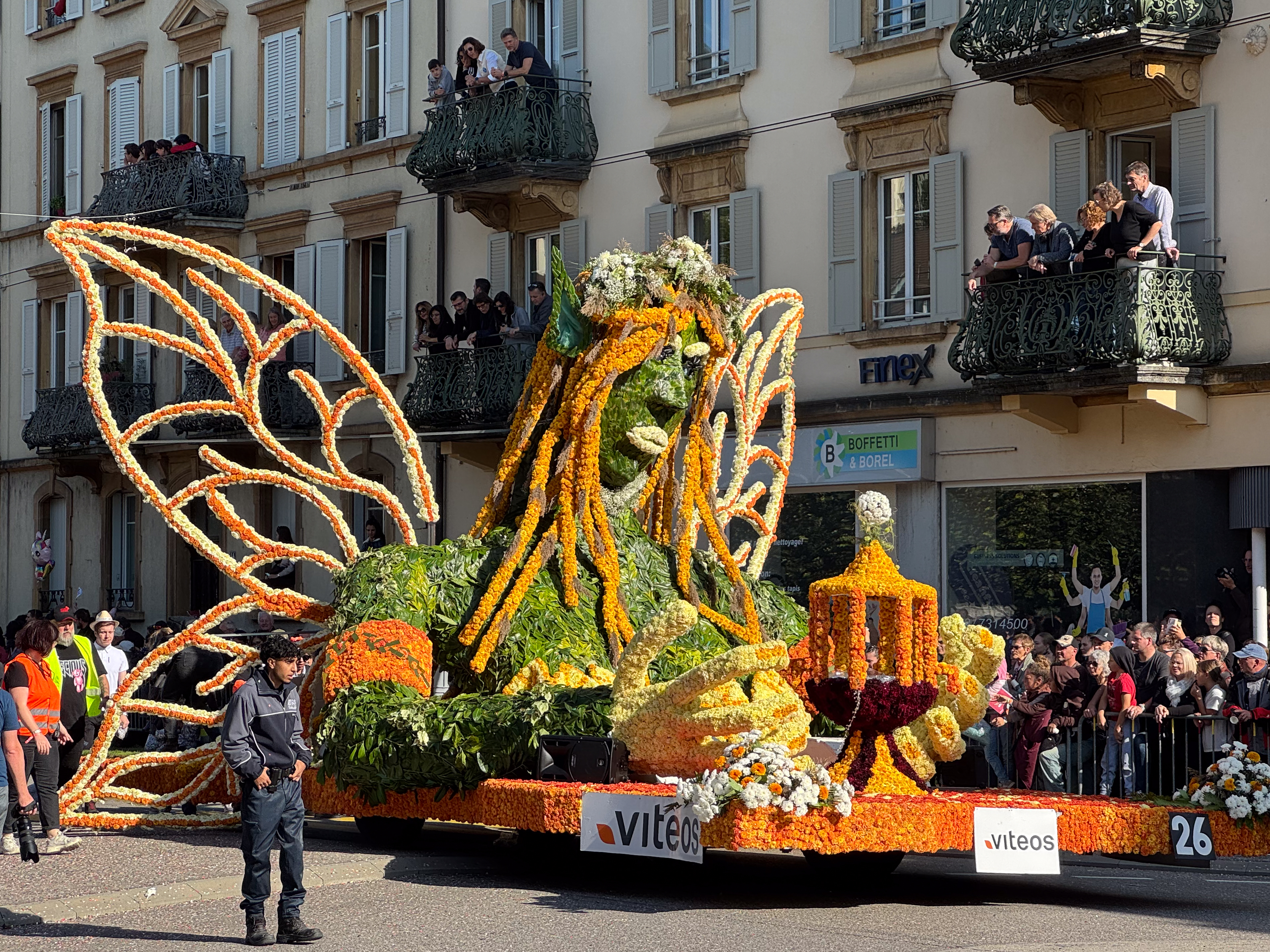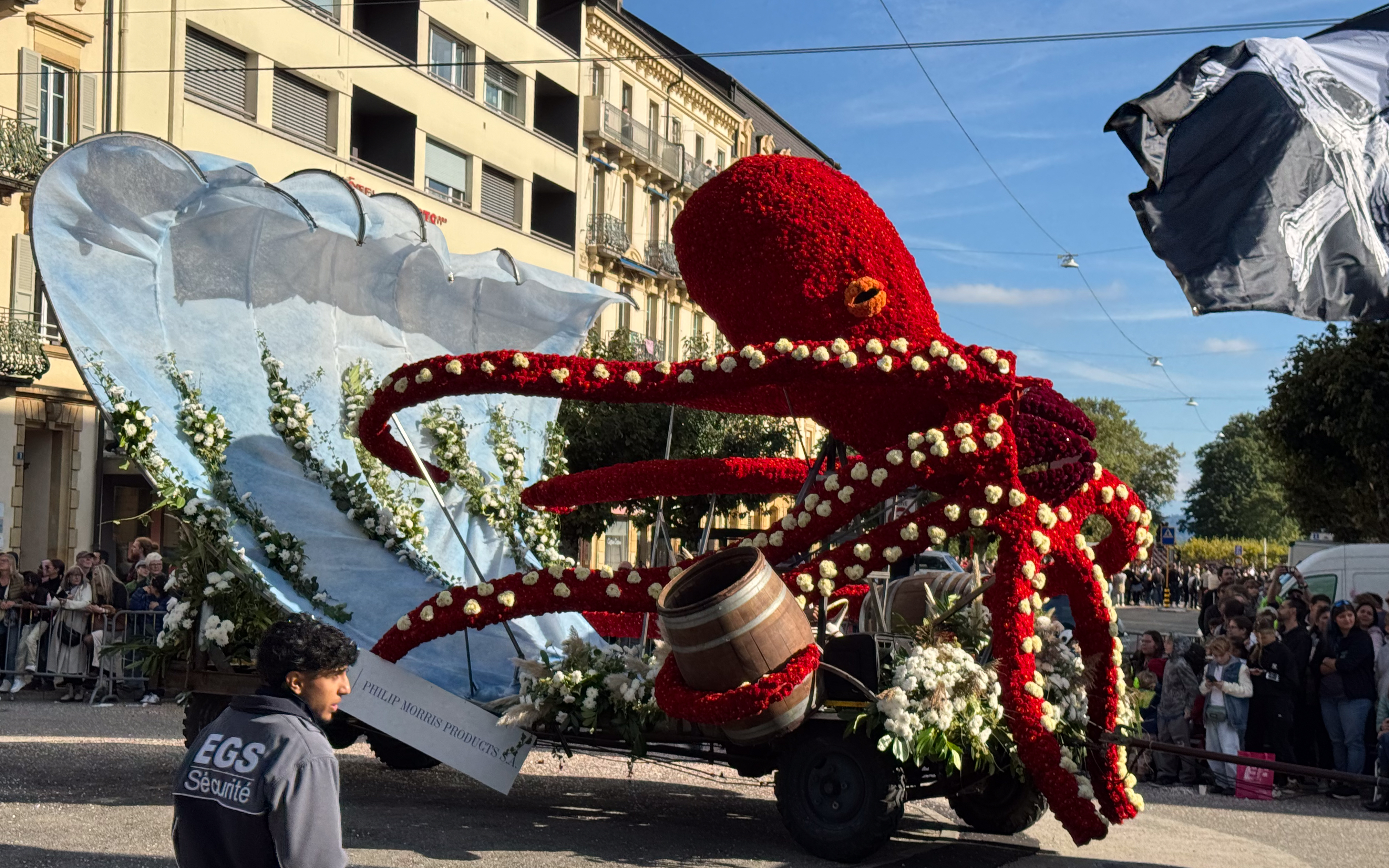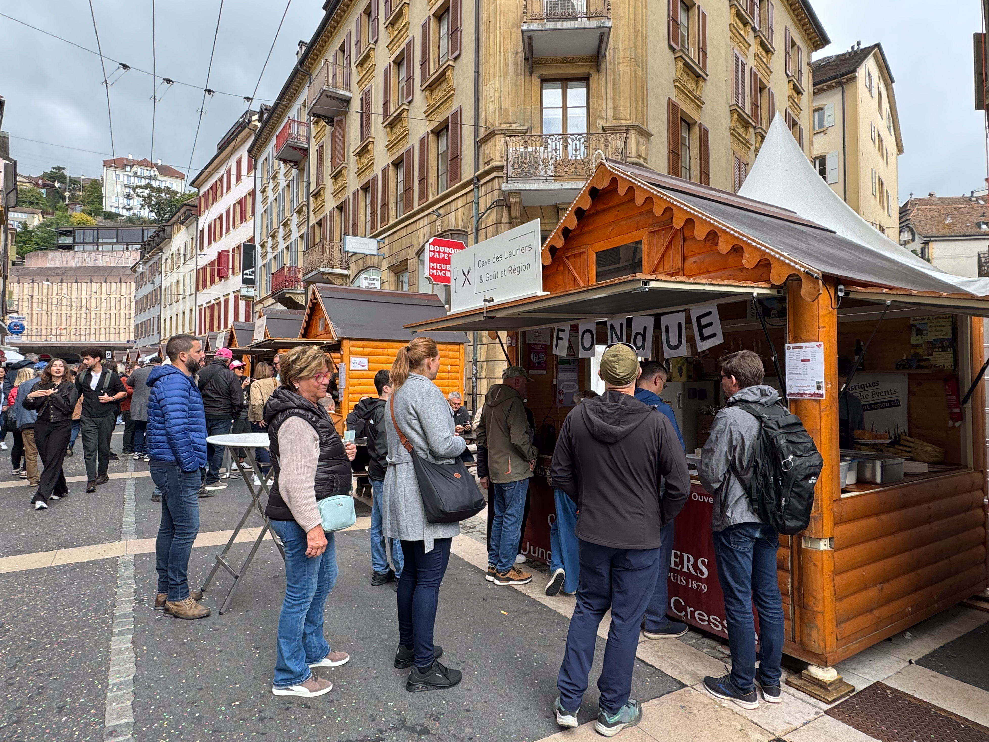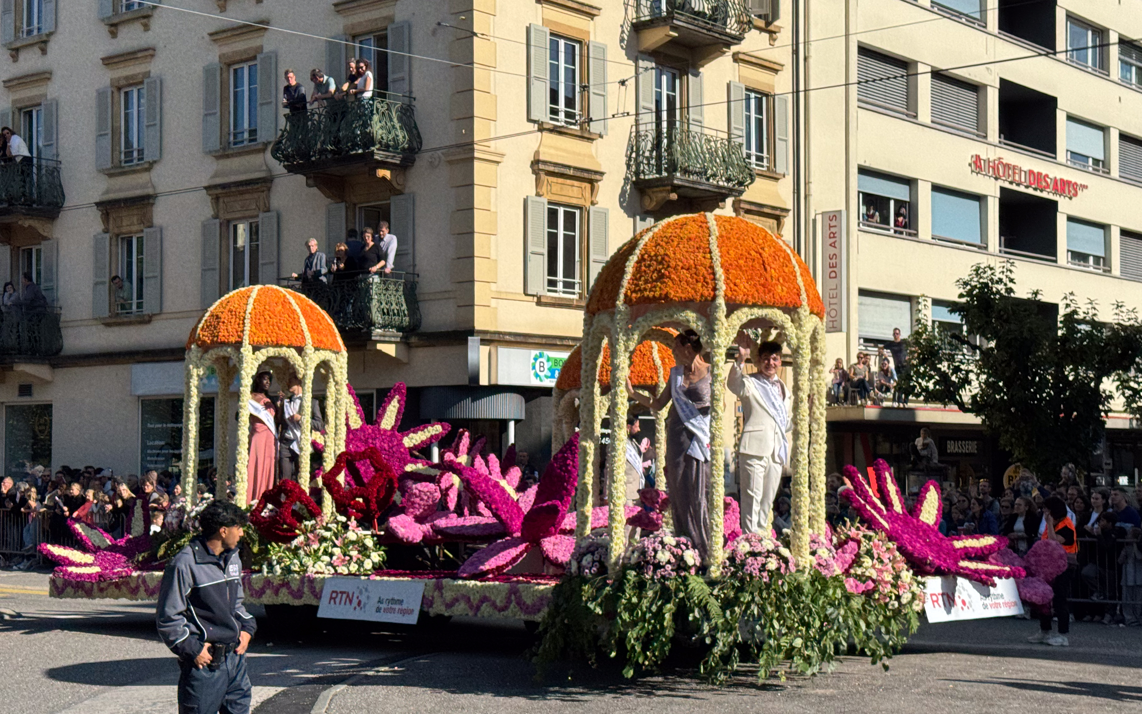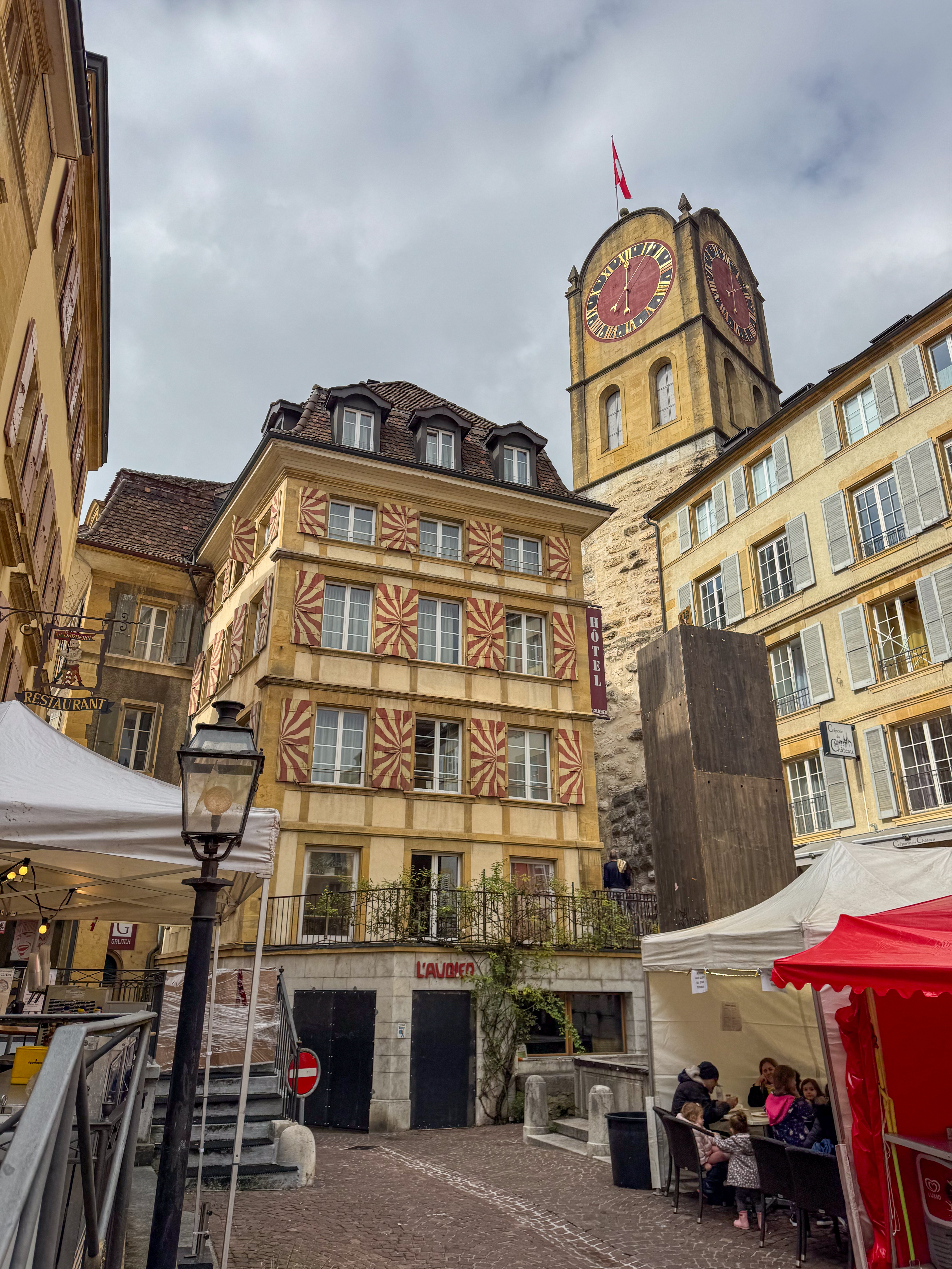 Rond een uur of elf komt de trein van de oud-collega aan in het station van Neuchâtel en trekken we samen naar het stadsgedeelte waar de feesten plaats vinden. Het is nog rustig in de stad, waar alles in gereedheid wordt gebracht voor het Grand Corso Fleuri. Fun fact: ik heb nog nooit in mijn leven een bloemencorso meegemaakt, maar raakte gefascineerd door het gegeven door het lezen van het boekje ‘Tiny en het bloemenfeest‘ (uit 1973, begot!), dat nog van mijn moeder moet zijn geweest. We kopen ons een polsbandje dat ons later toegang moet verschaffen tot het parcours van het bloemencorso en ik kijk ernaar uit om straks voor de eerste keer met bloemen versierde wagens aan mij voorbij te zien trekken.