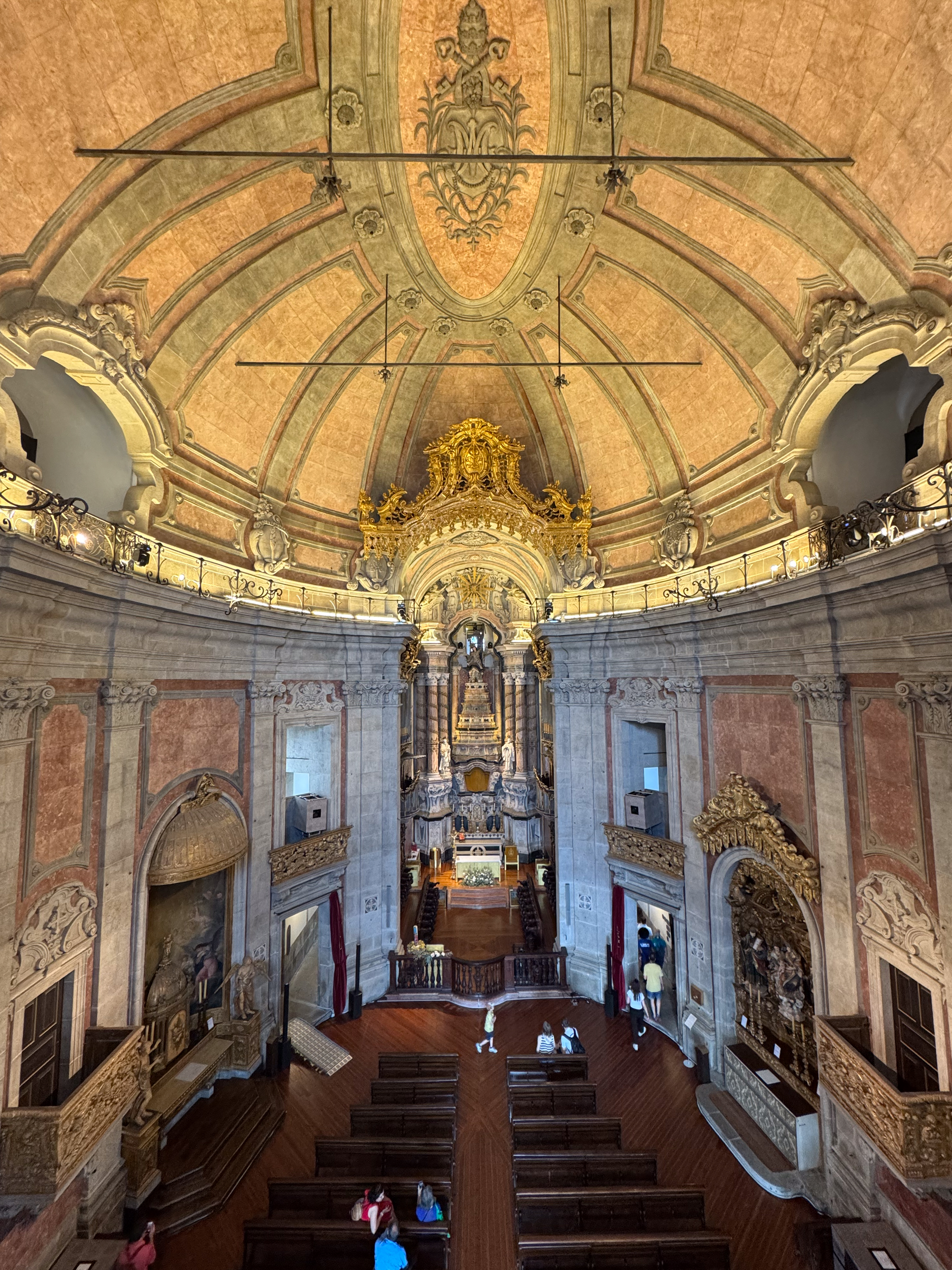 We zijn van plan later een bezoek te brengen aan de kerken, maar worden in de Igreja dos Carmelitas binnen gewuifd door een bedelaar aan de deur, die ons verzekert dat de kerk echt prachtig is en bovendien: gratis te bezoeken, in tegenstelling tot de buurkerk. We stoppen de man wat geld toe en wandelen de kerk binnen. En hij had gelijk, de kerk is werkelijk rijkelijk versierd en we hebben zelfs toegang tot de sacristie met de typische houten kasten met lades voor de gewaden van de priesters en een prachtige plafondschildering.