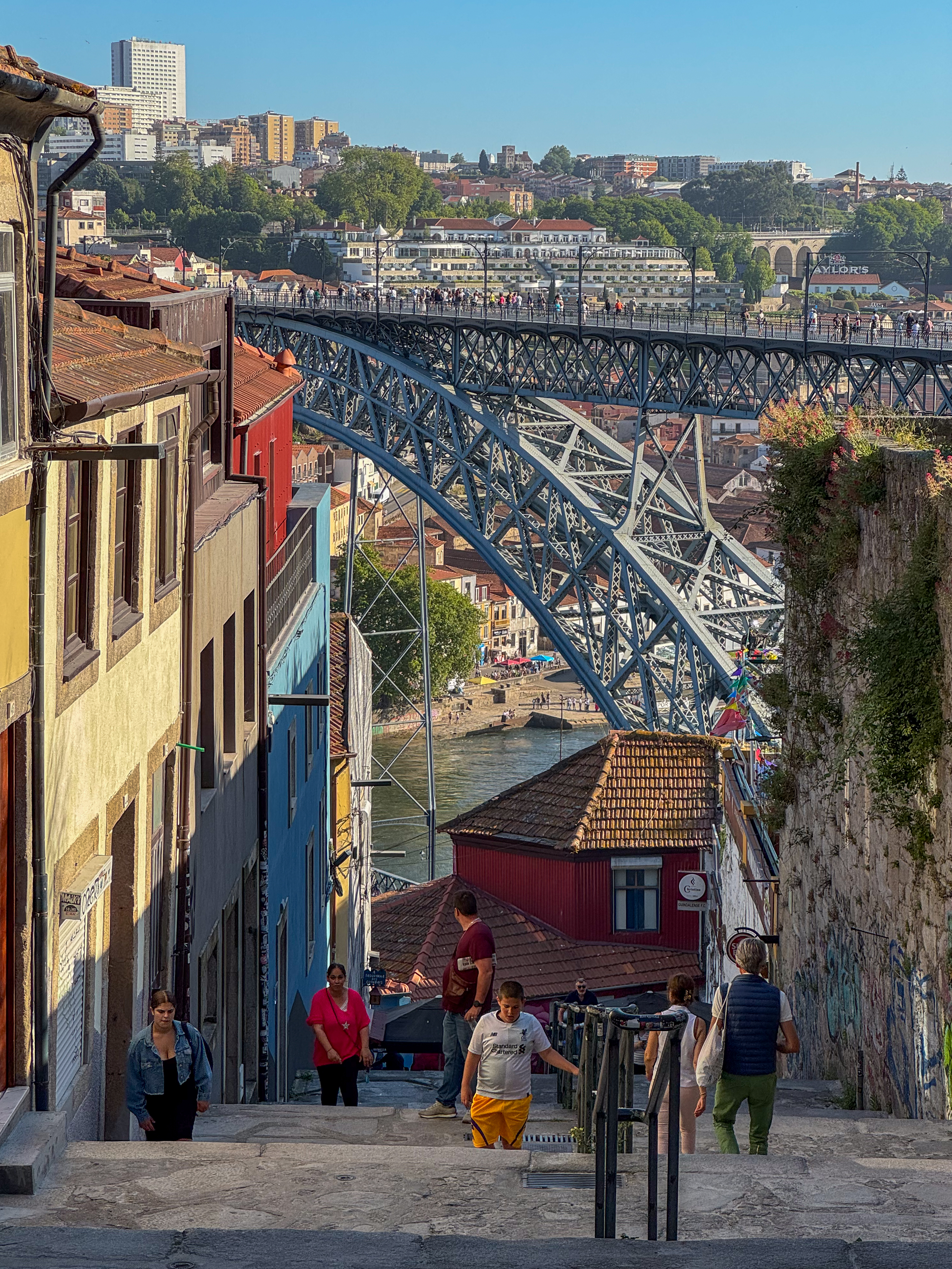 Vervolgens wandelen we langs de gerestaureerde restanten van de oude Fernandomuur uit de veertiende eeuw naar de Ponte Dom Luís I, een indrukwekkende stalen constructie ontworpen door ingenieur Théophile Seyrig, een Belgische compagnon van Eiffel. Het fijne aan deze brug is dat er enkel sporadisch een tram passeert en je verder als voetganger gans de breedte van de brug kan innemen. Het uitzicht vanaf de brug op de Douro en omgeving in het avondlicht is prachtig.